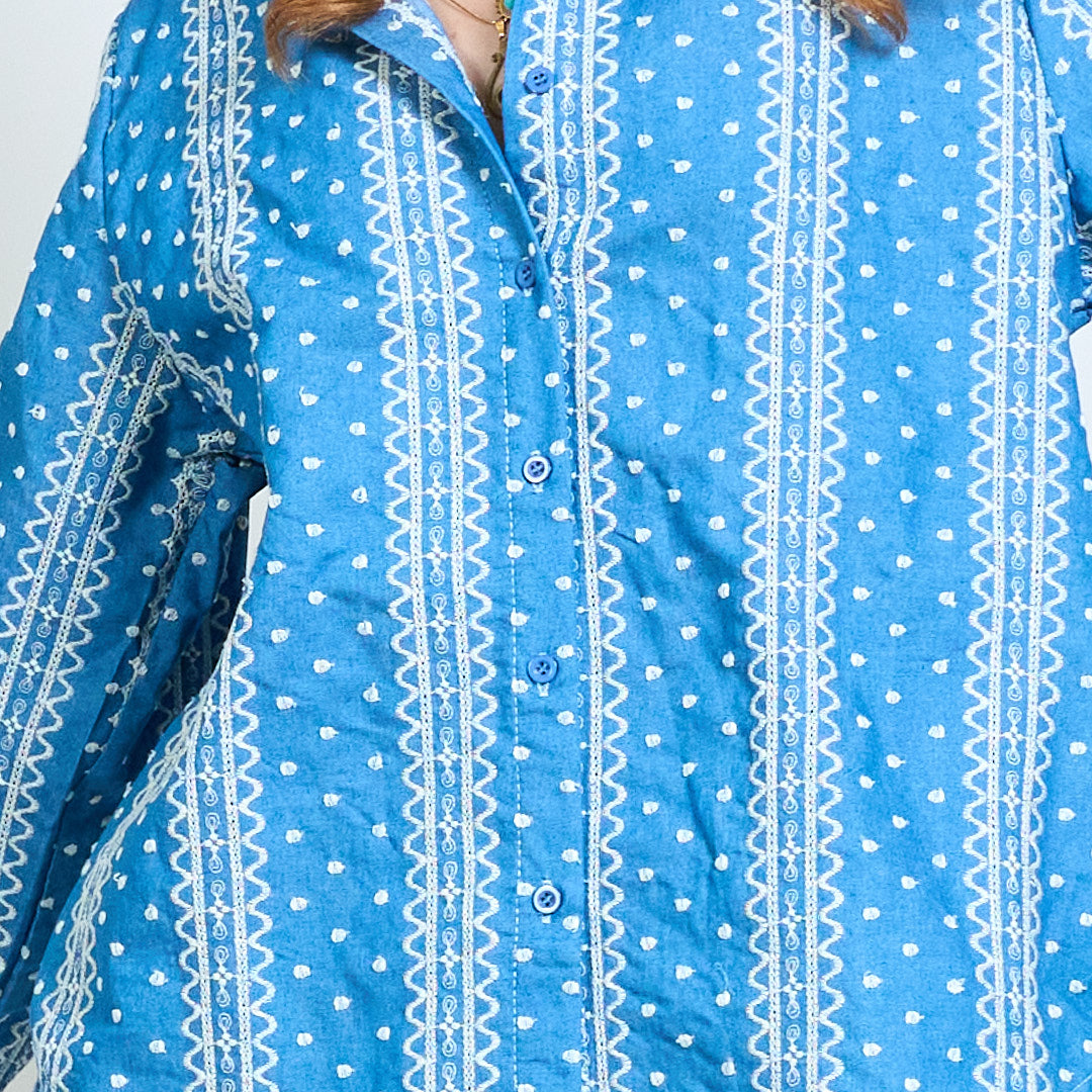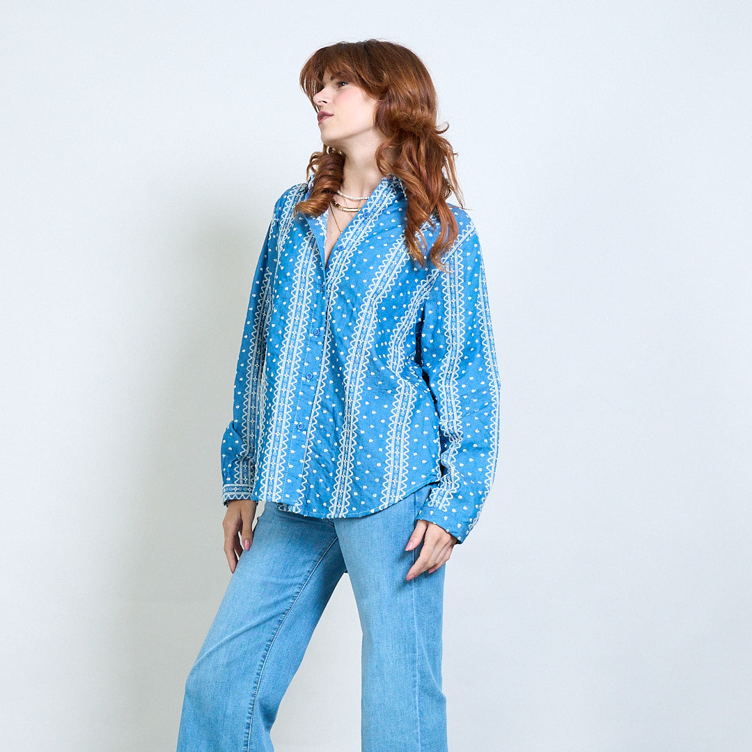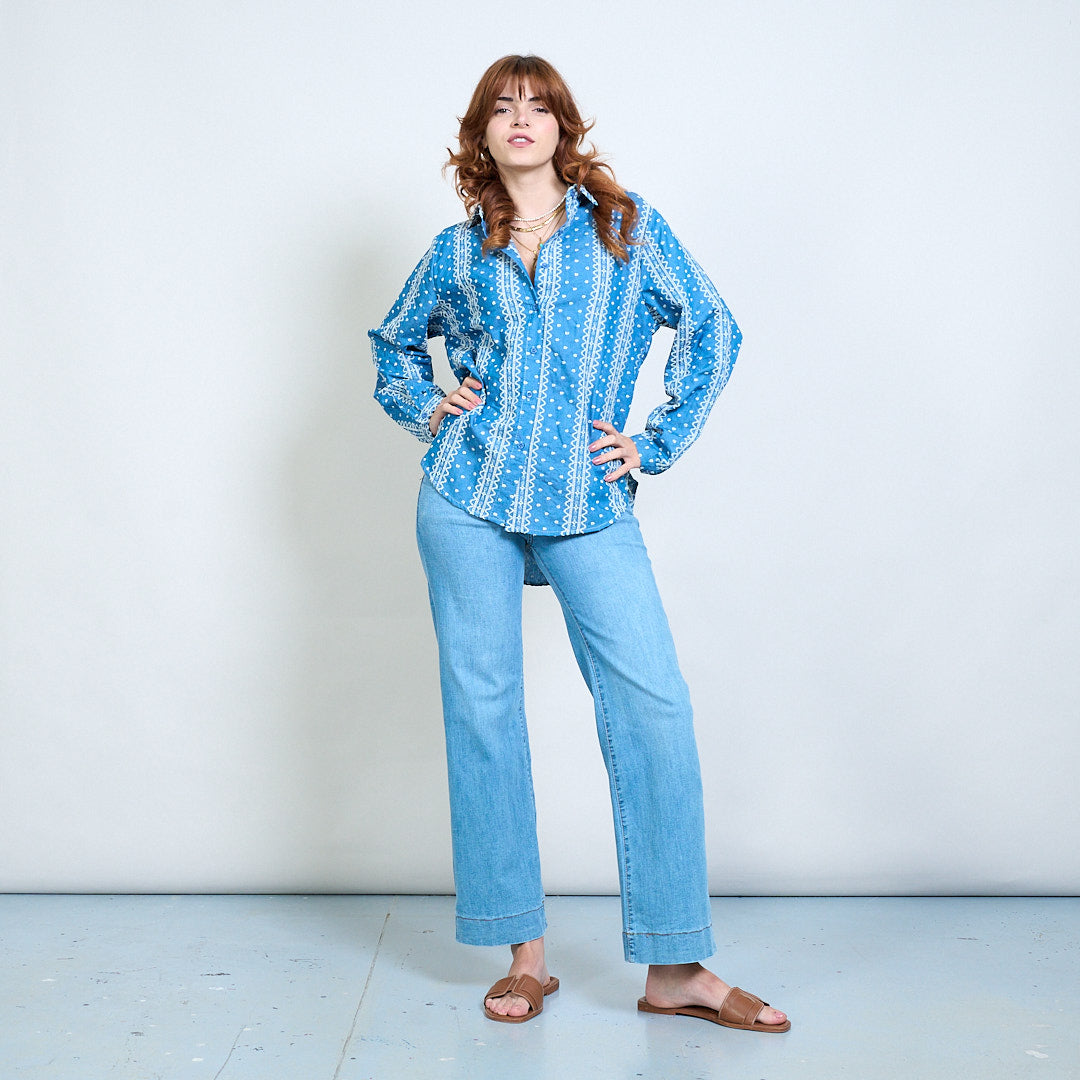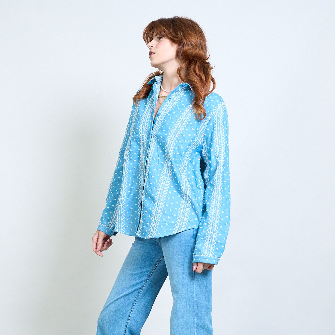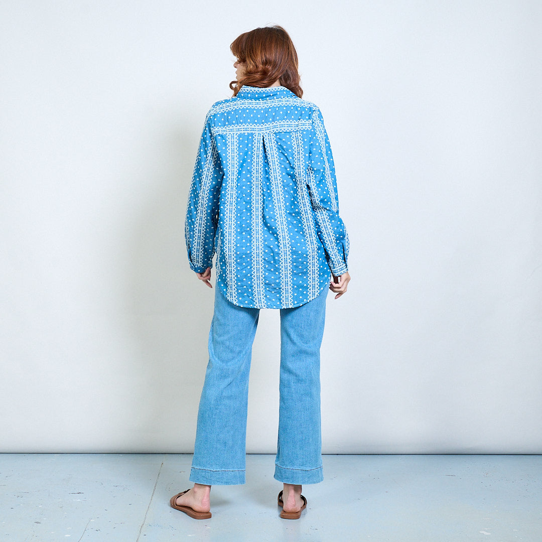 Heart Dot y Zigzag Bordado Coloque Collar Denim Camisa Al por mayor