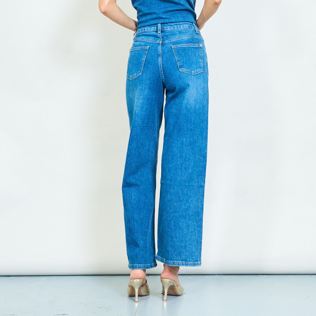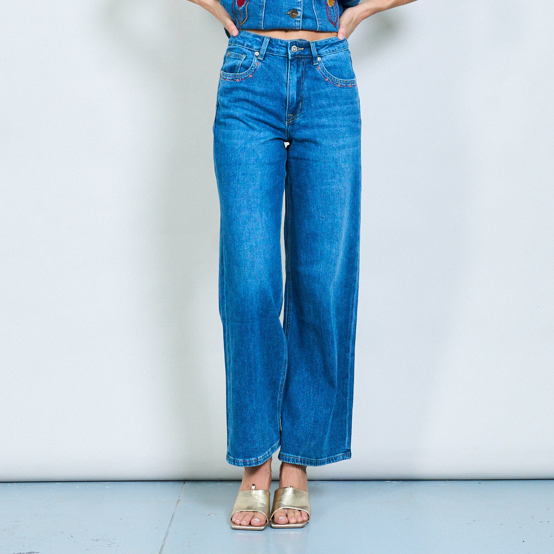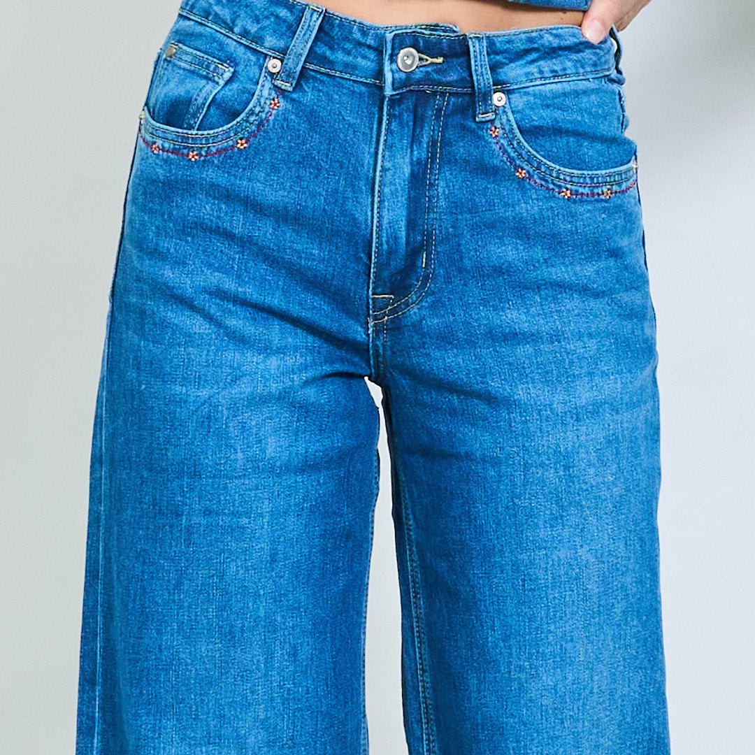 Jeans de mezclilla de pierna ancha con bordado floral al por mayor