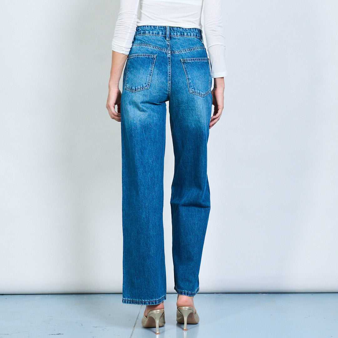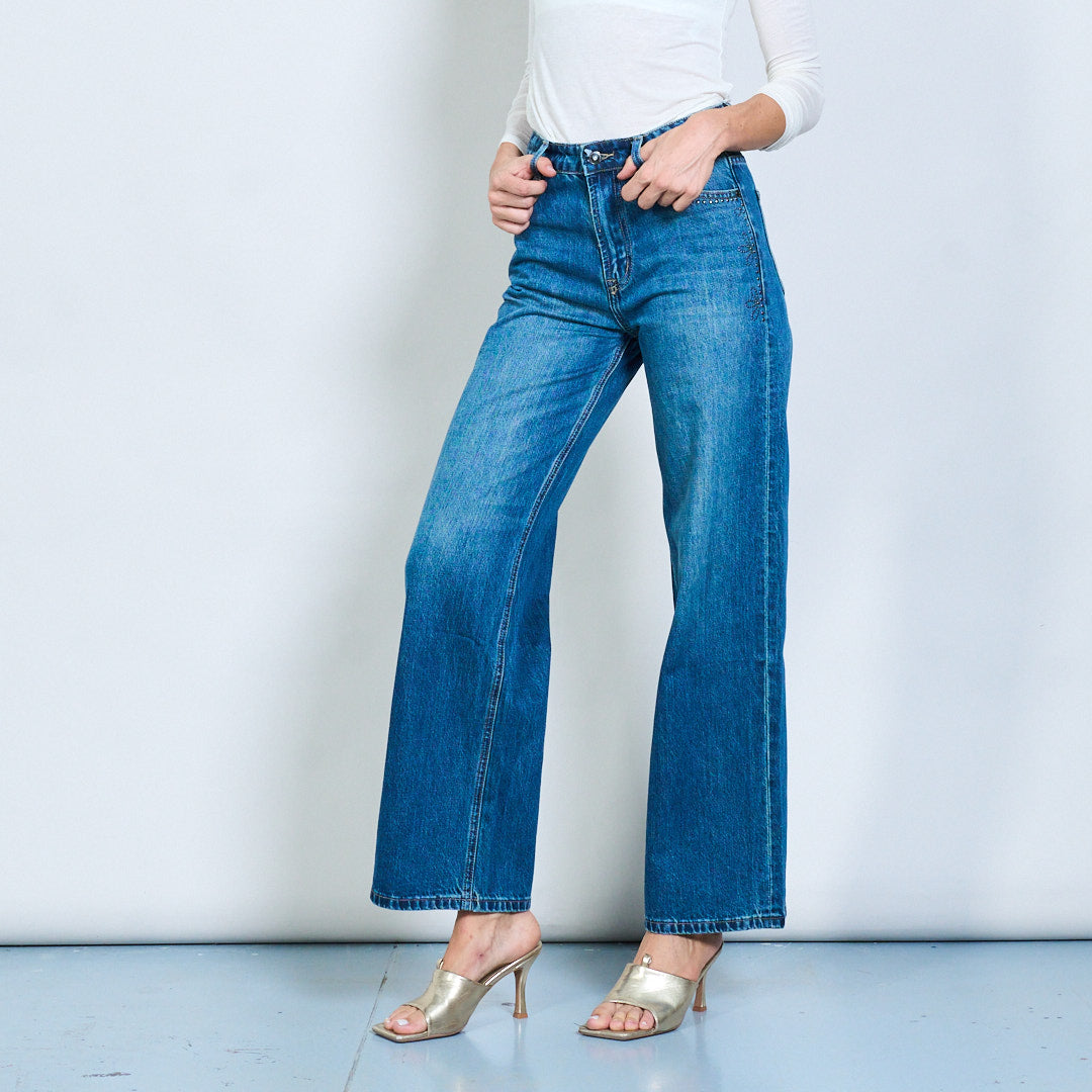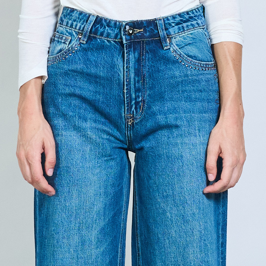Jeans de mezclilla de pierna ancha con pernos de imitación al por mayor