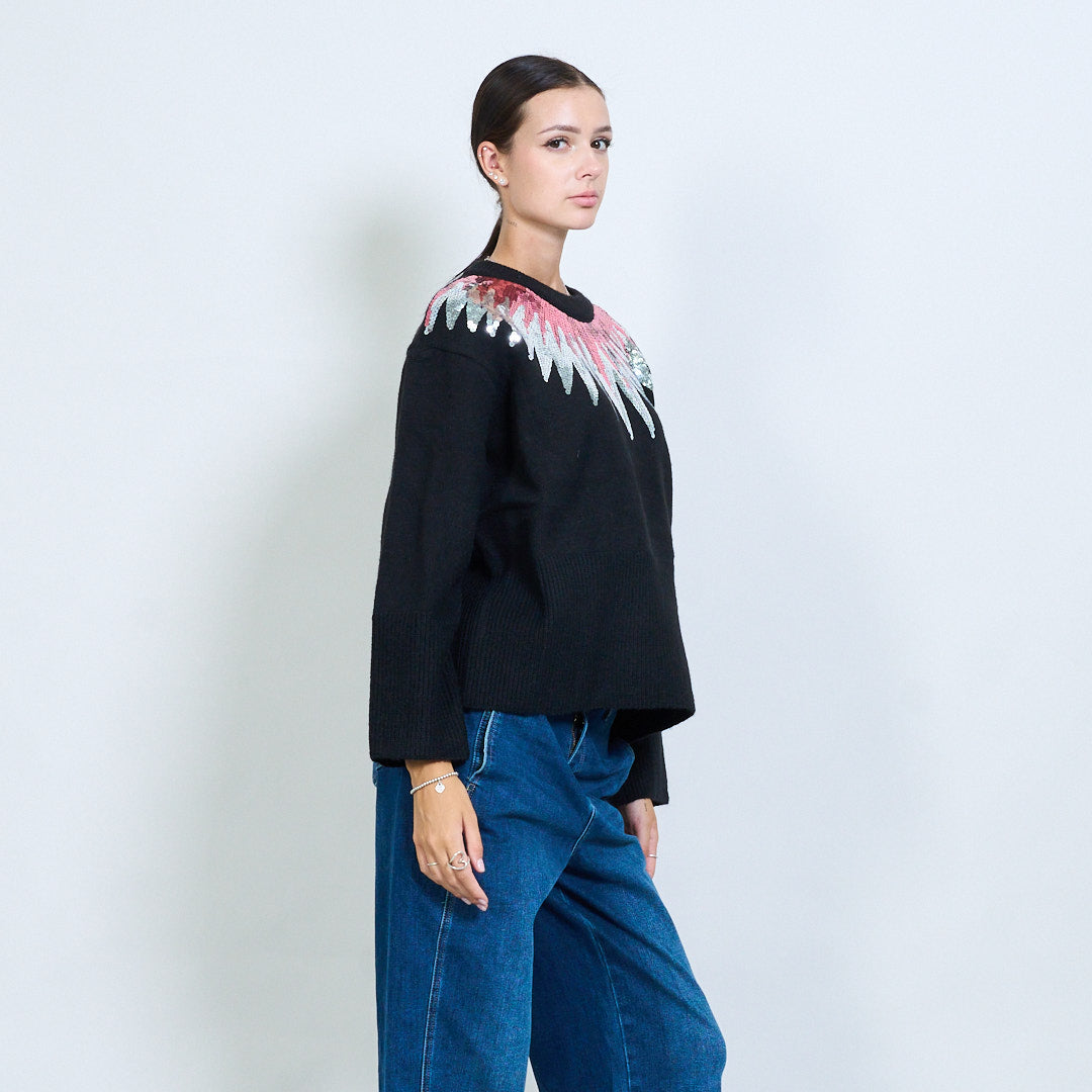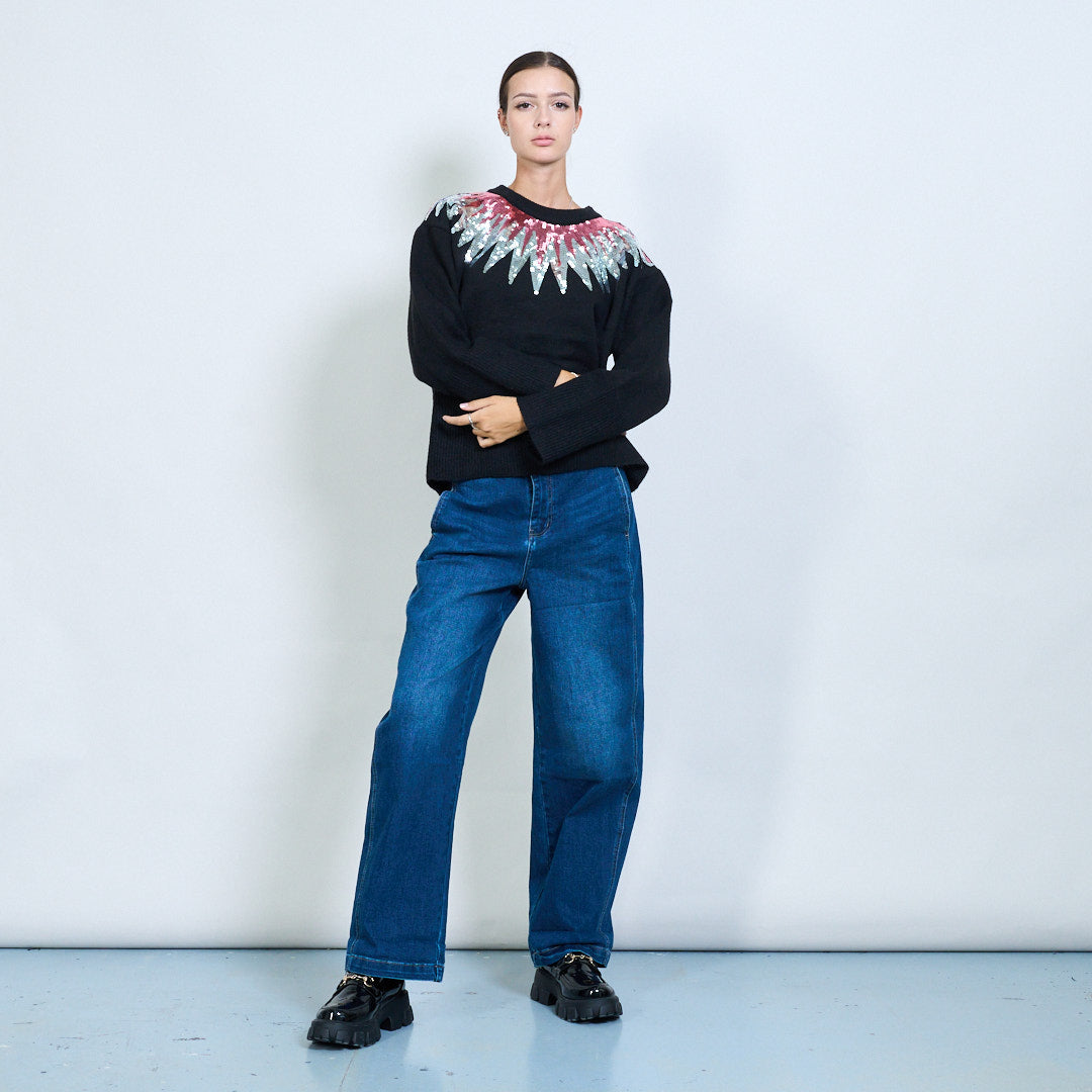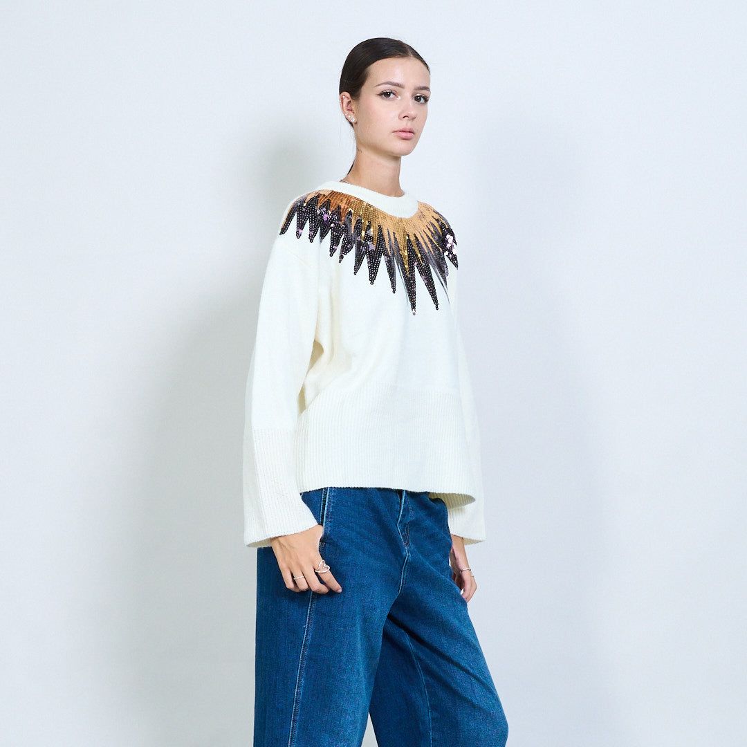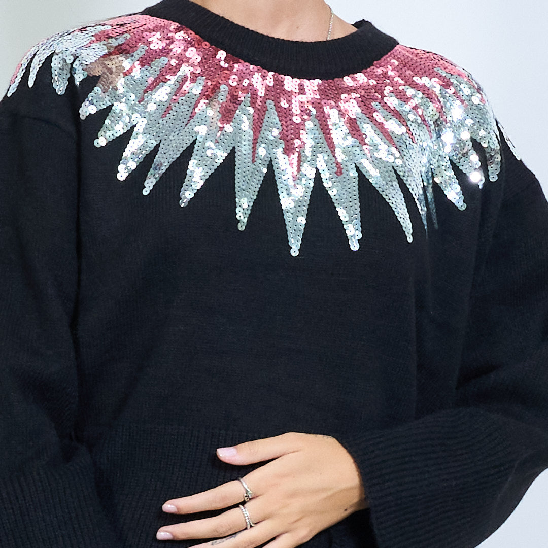 - Bold de lentejuelas en el patrón inspirado en la llama en los hombros
