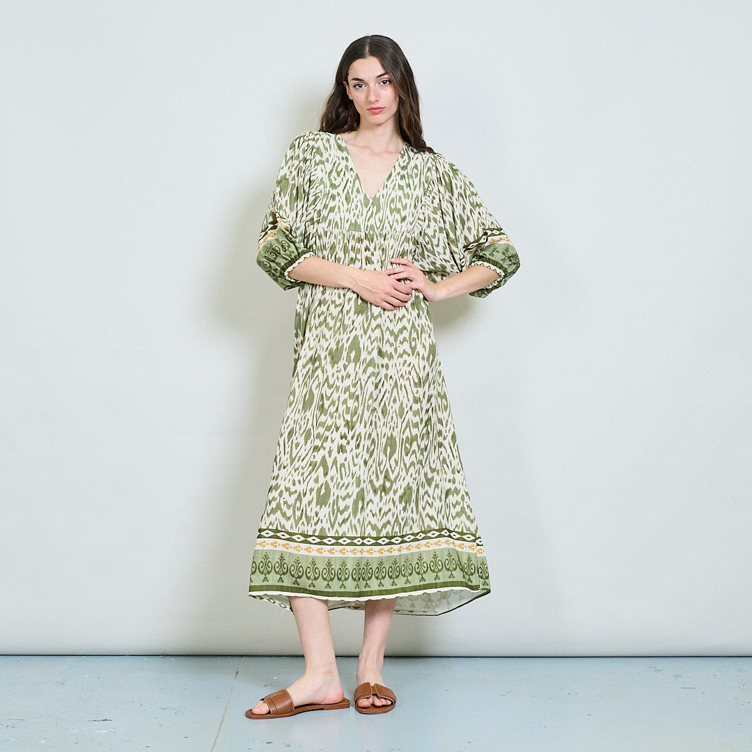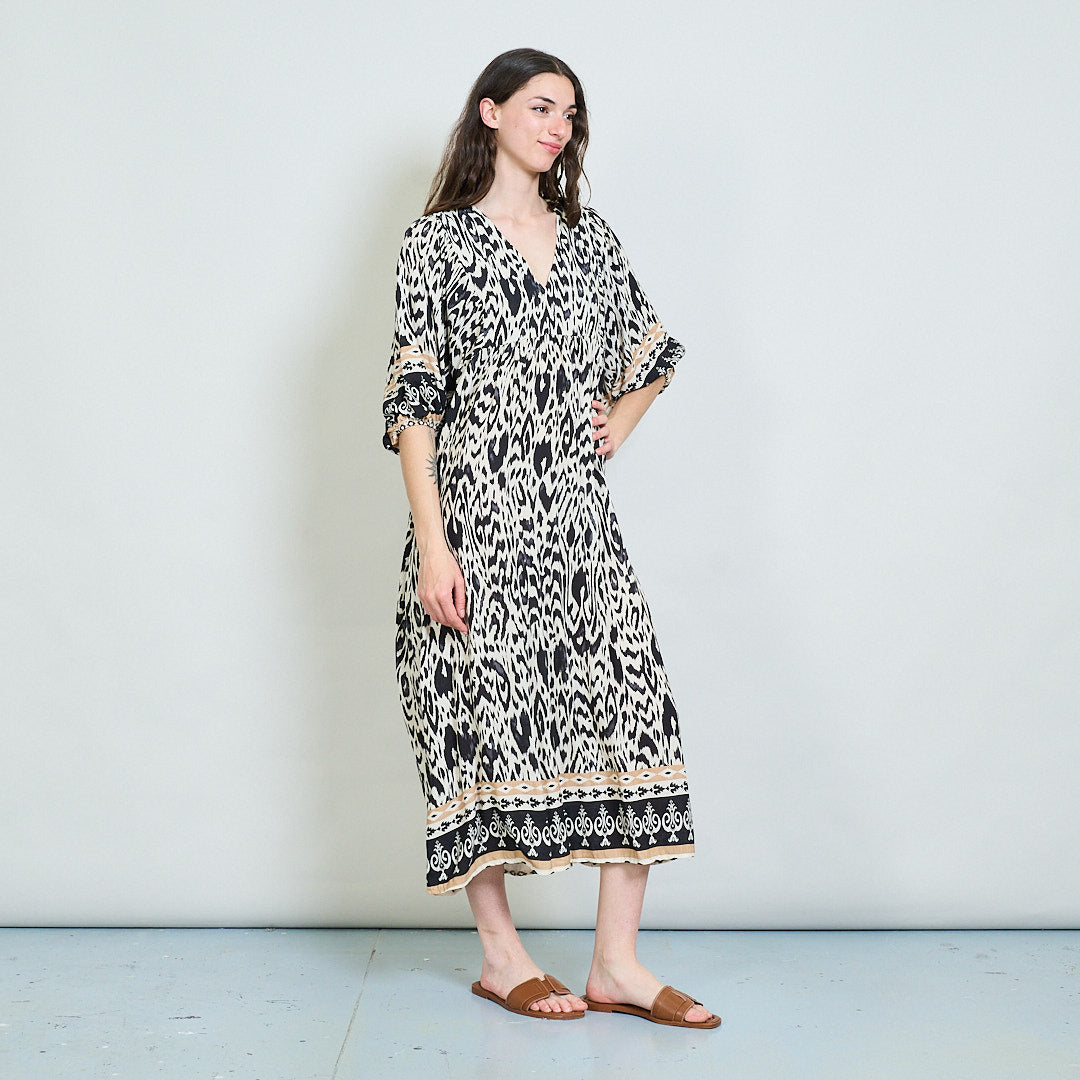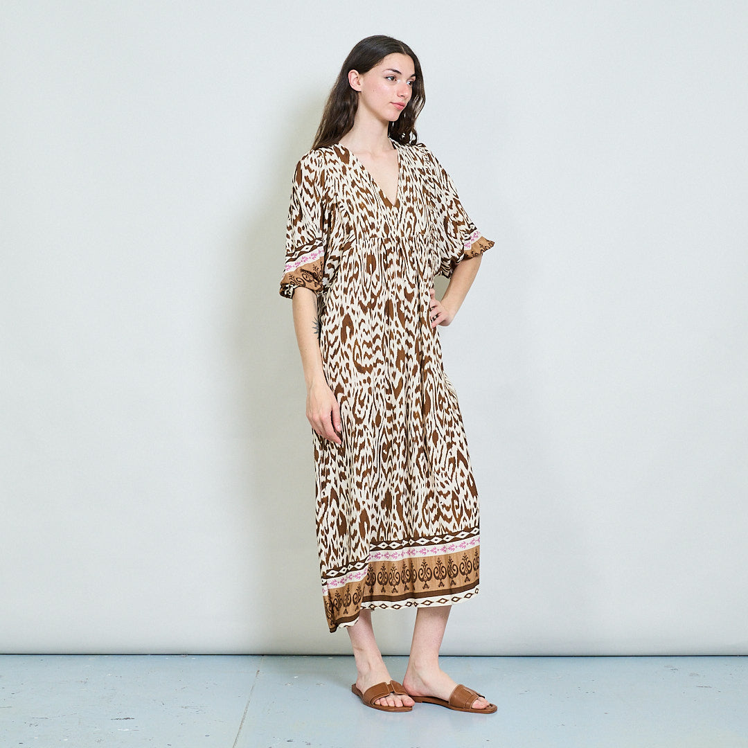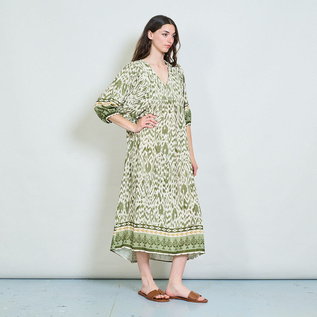 Vestido midi relajado relajado con cuello en V con estampado fronterizo Tribal Ikat al por mayor