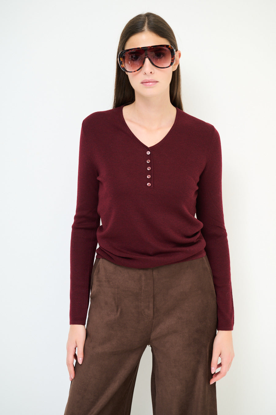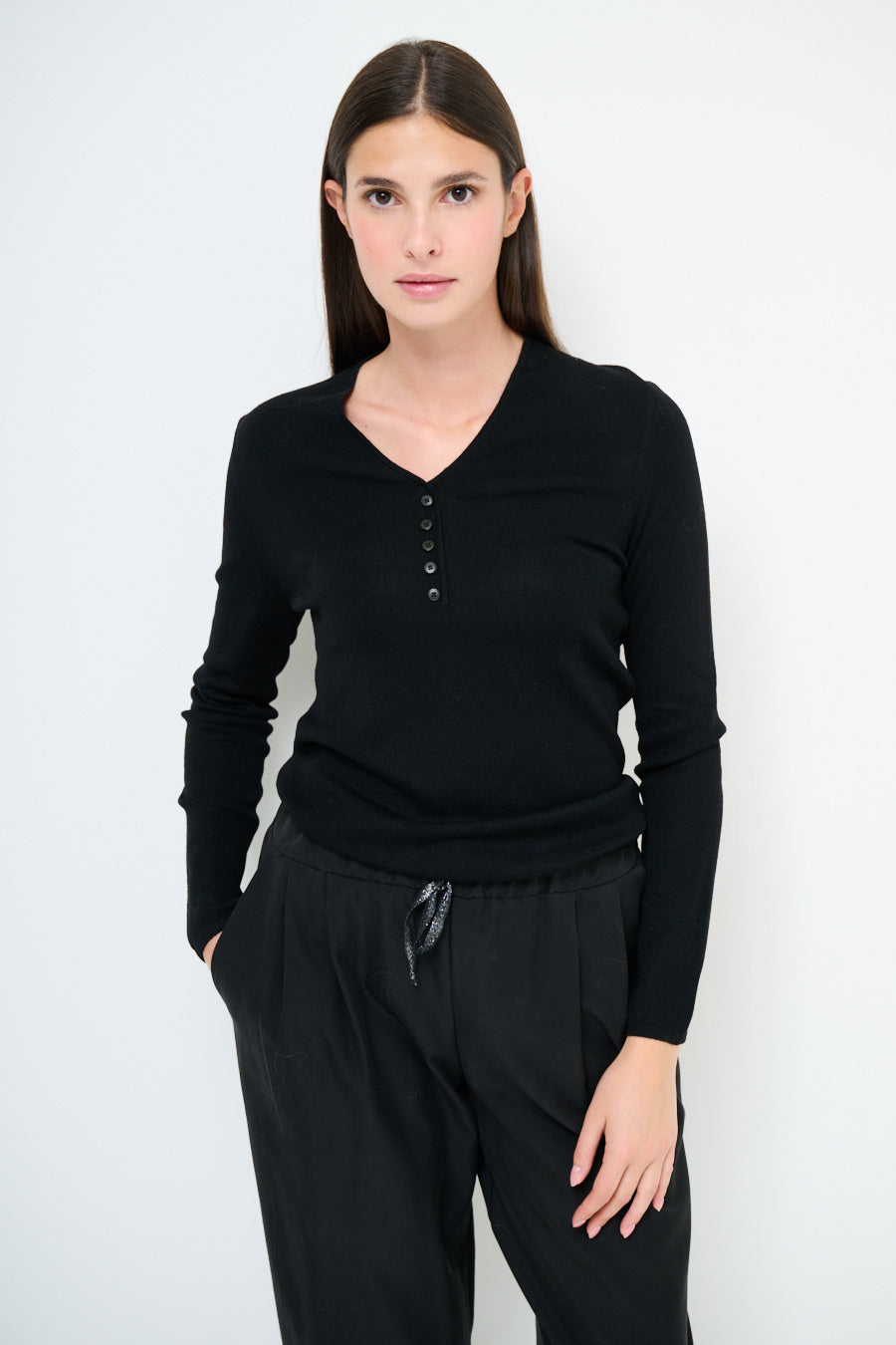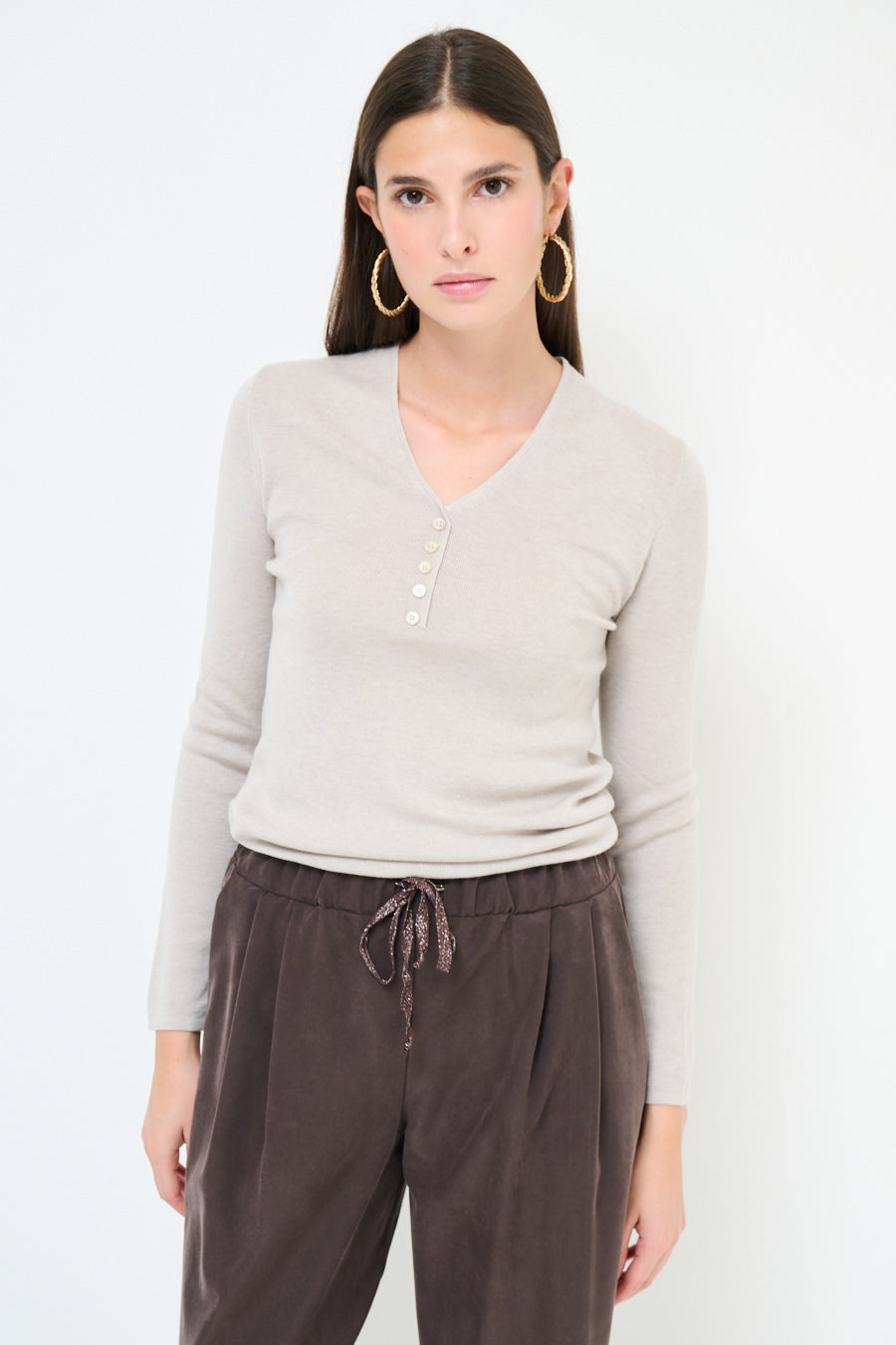 Top de punto de manga larga con detalle de botones y cuello en V al por mayor