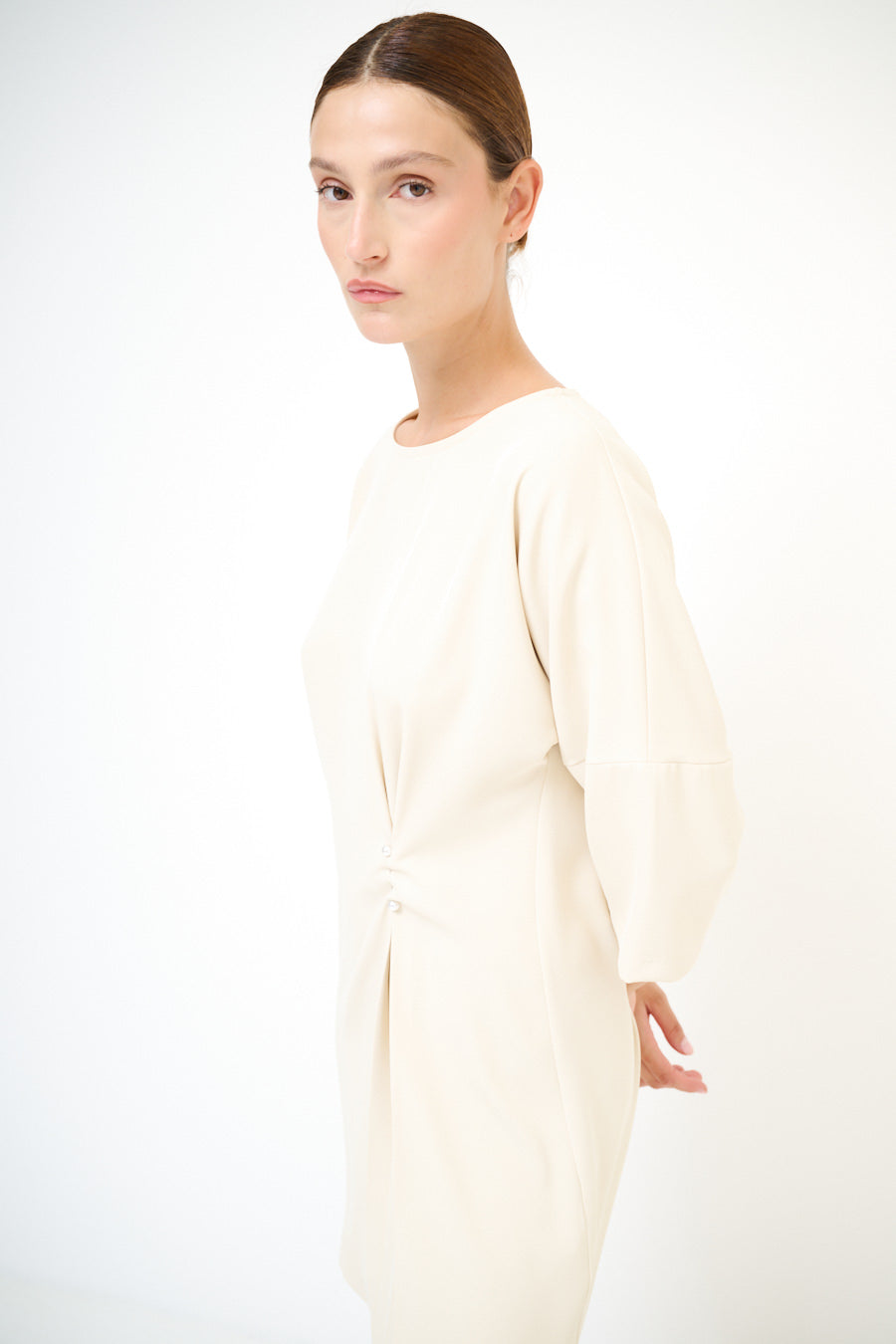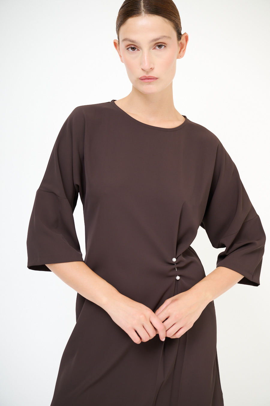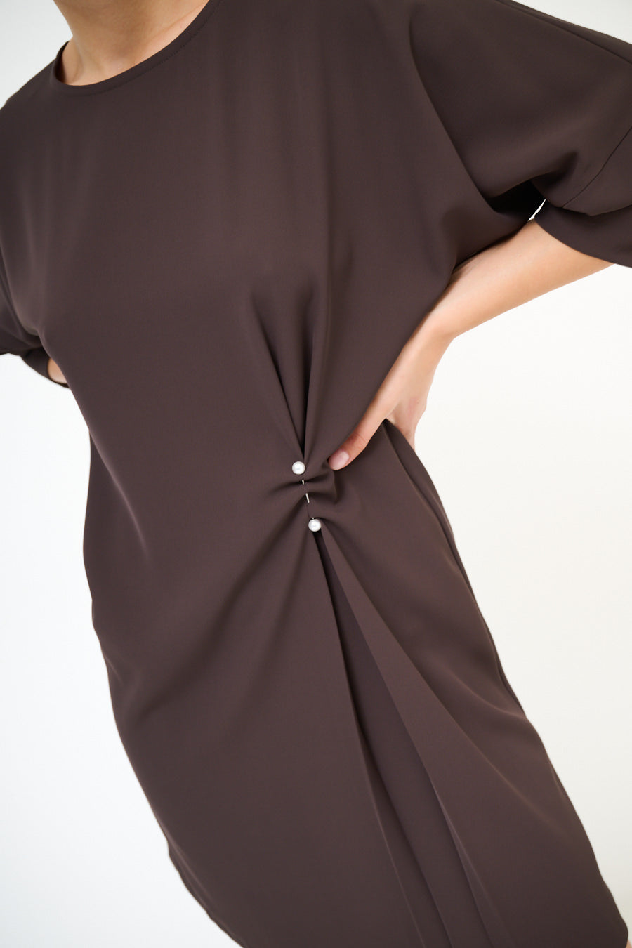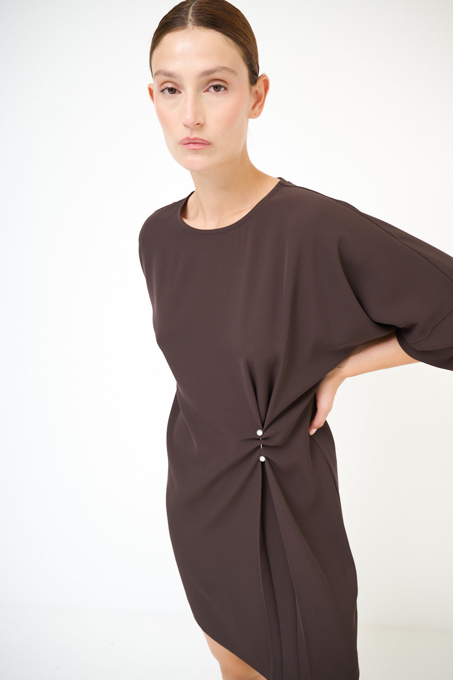 - Acento de drapeado suave reunido en la cintura con detalles de metal