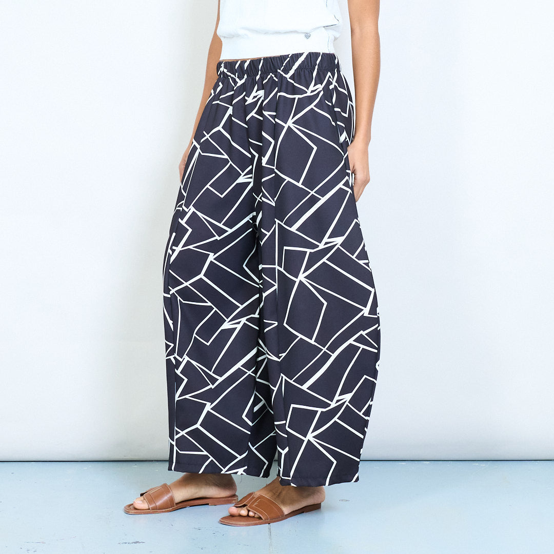 Pantalón corto de pierna ancha y fluido con estampado de líneas geométricas abstractas y cinturilla elástica al por mayor