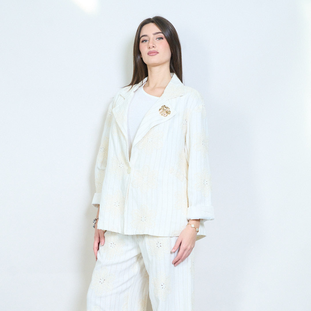 Raidallinen kirjailtu bleiseri, jossa on kukka pitsiyksityiskohtia ja rintakoru tukkumyynti
