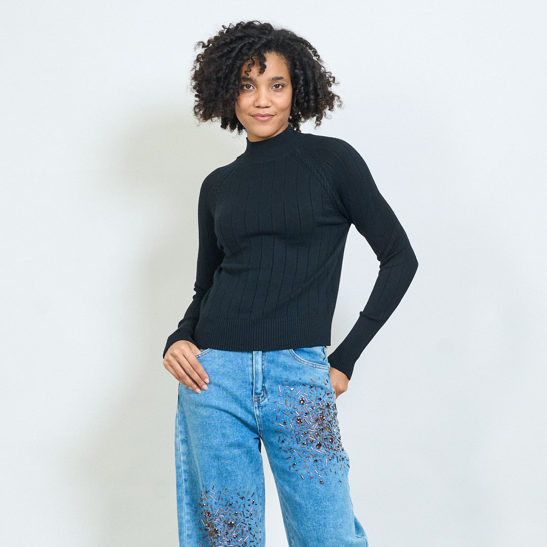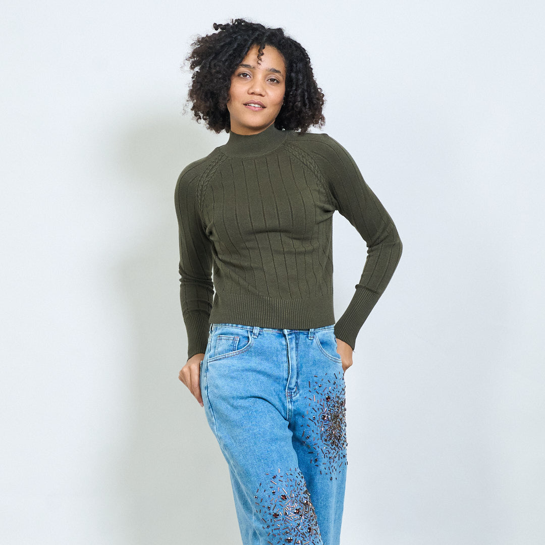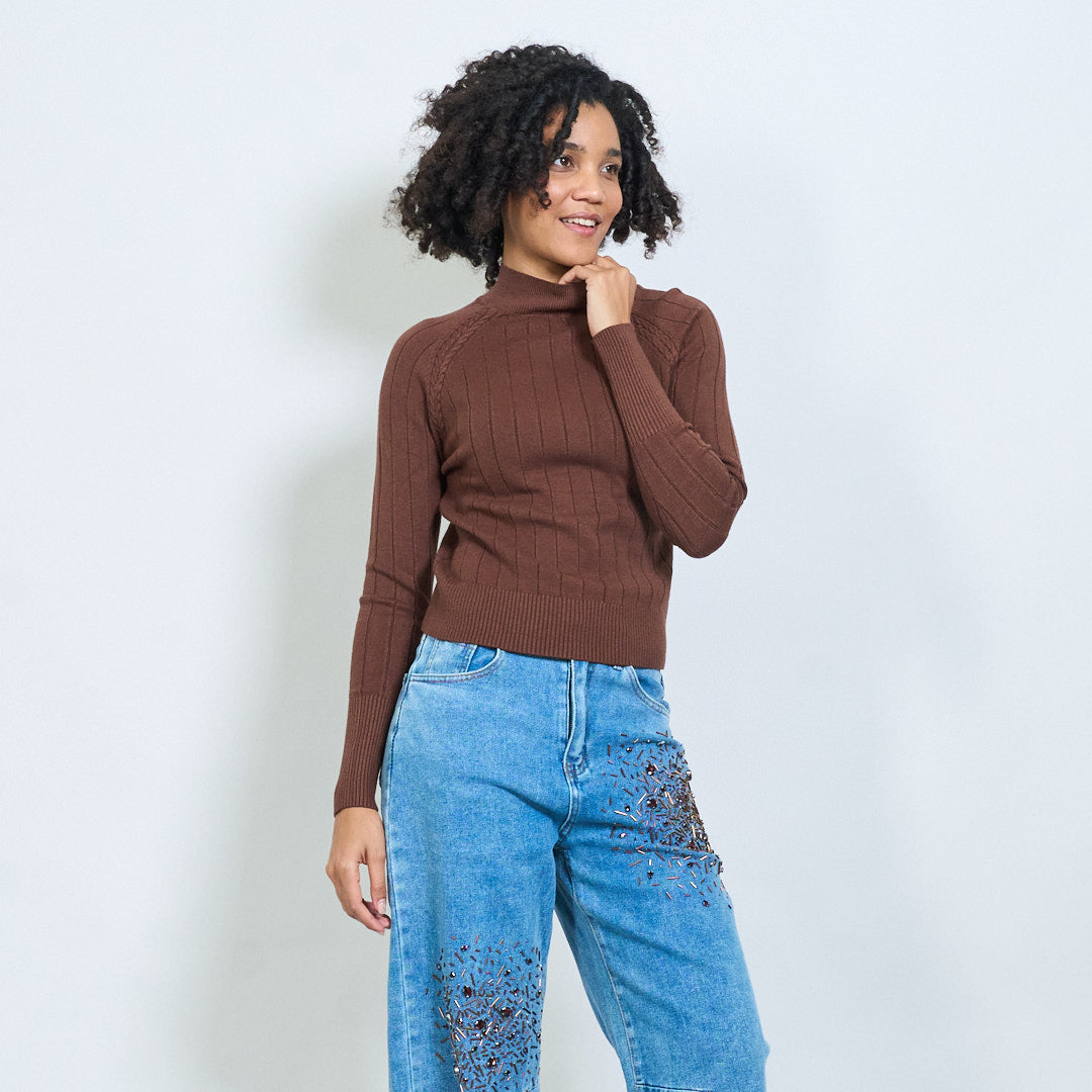 - Kaapeli -neulotut aksentit olkapäiden saumoja pitkin lisää tekstuuria