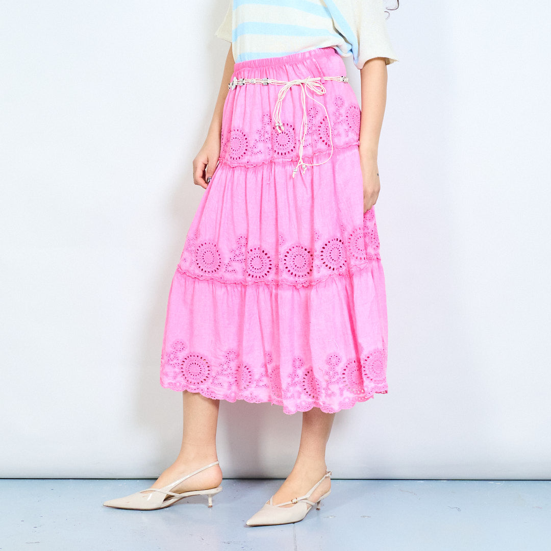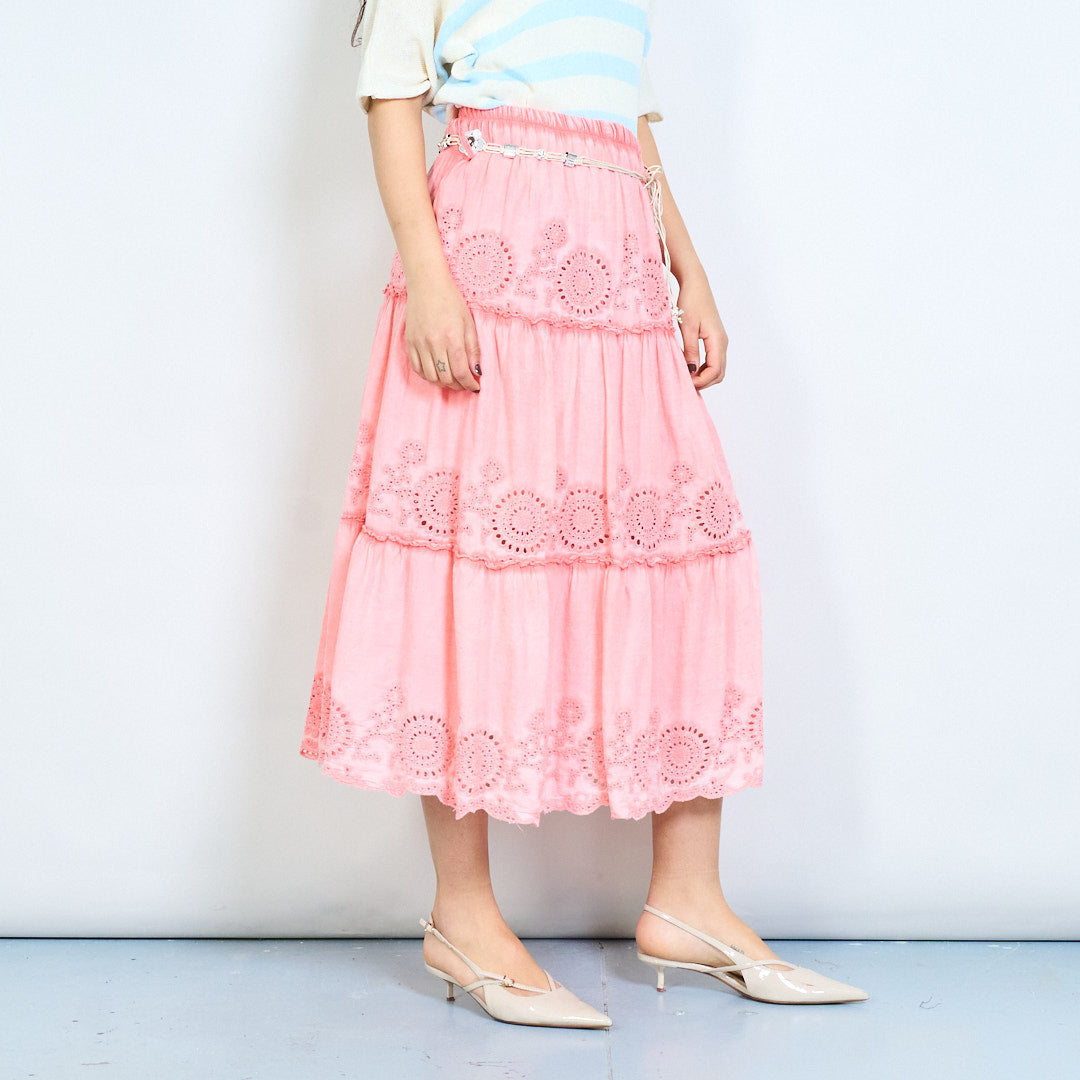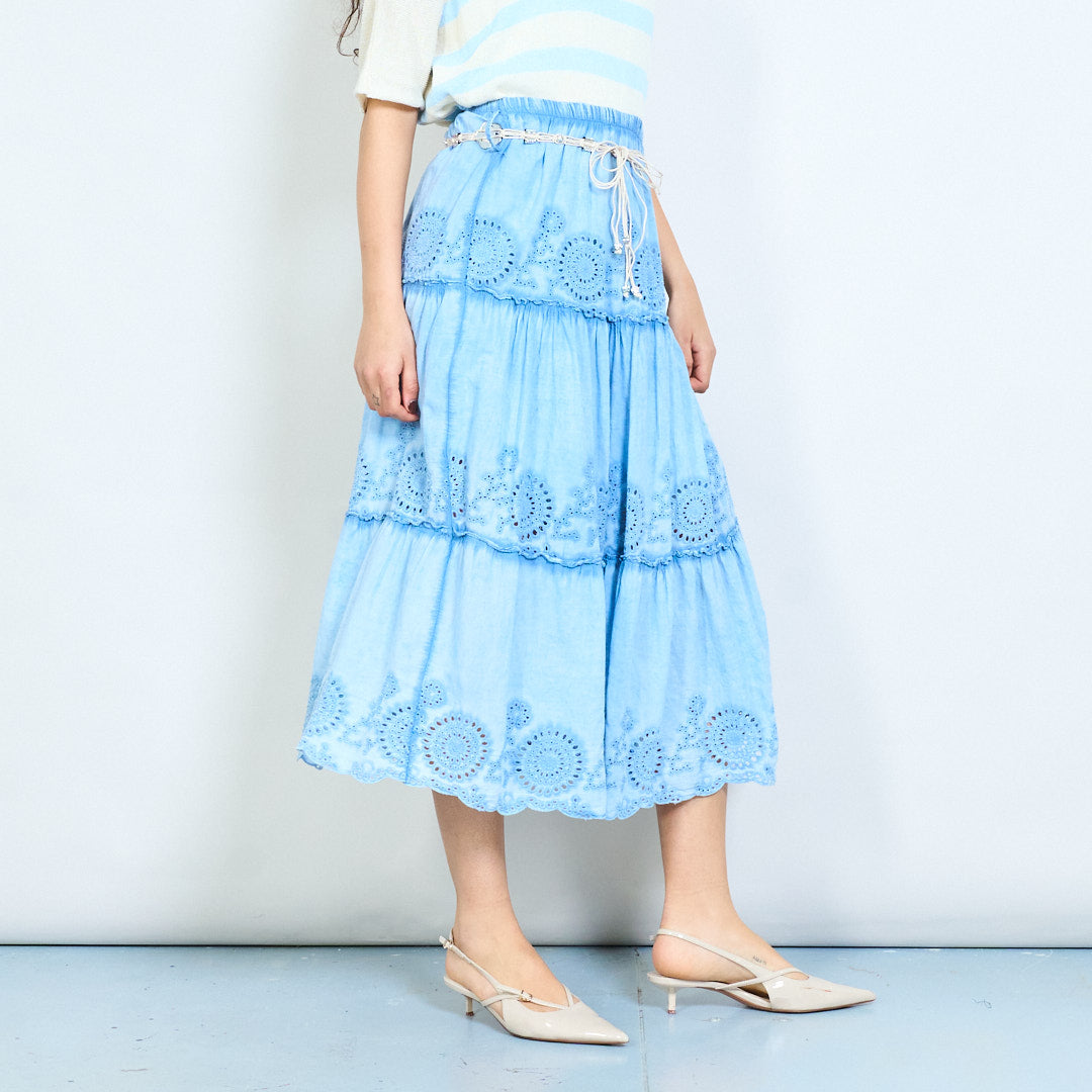 Porrastettu broderie anglaise joustava vyötäröinen midihame köysivyöllä tukkumyynti