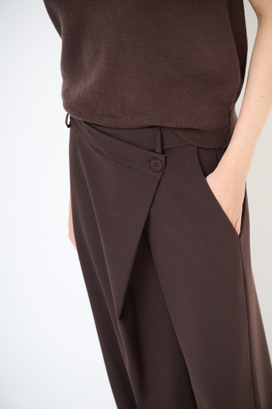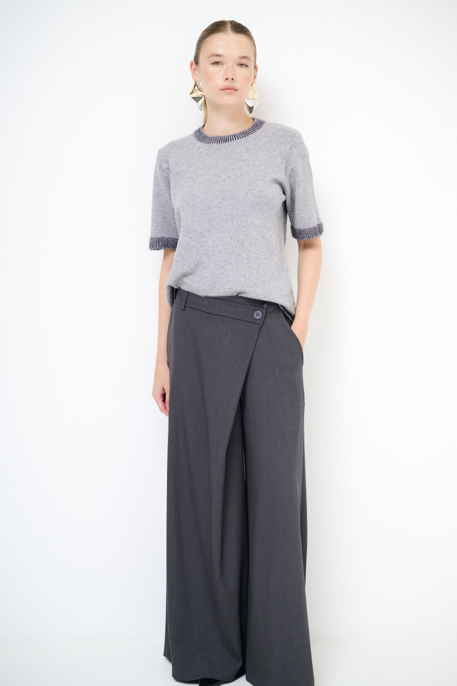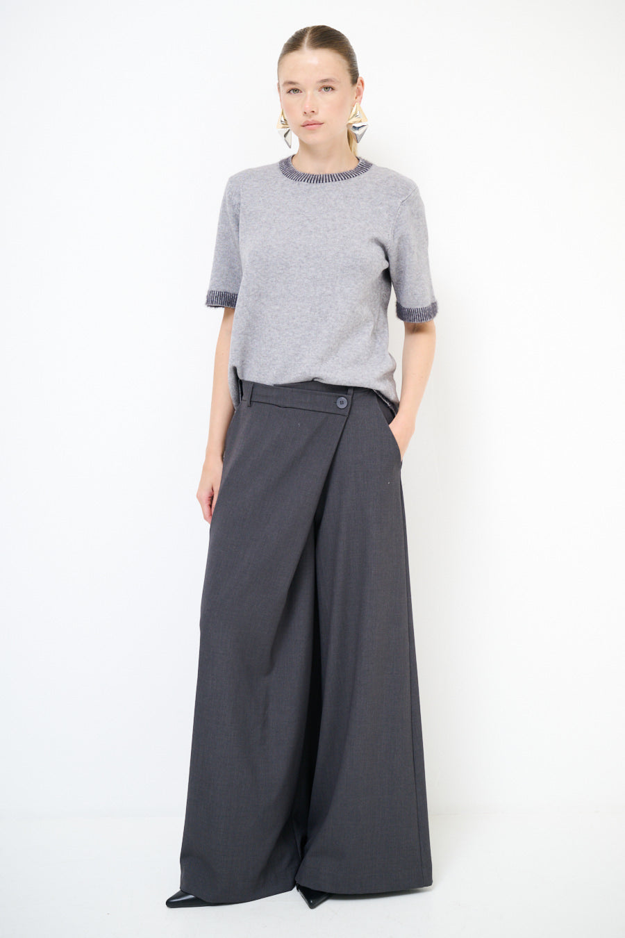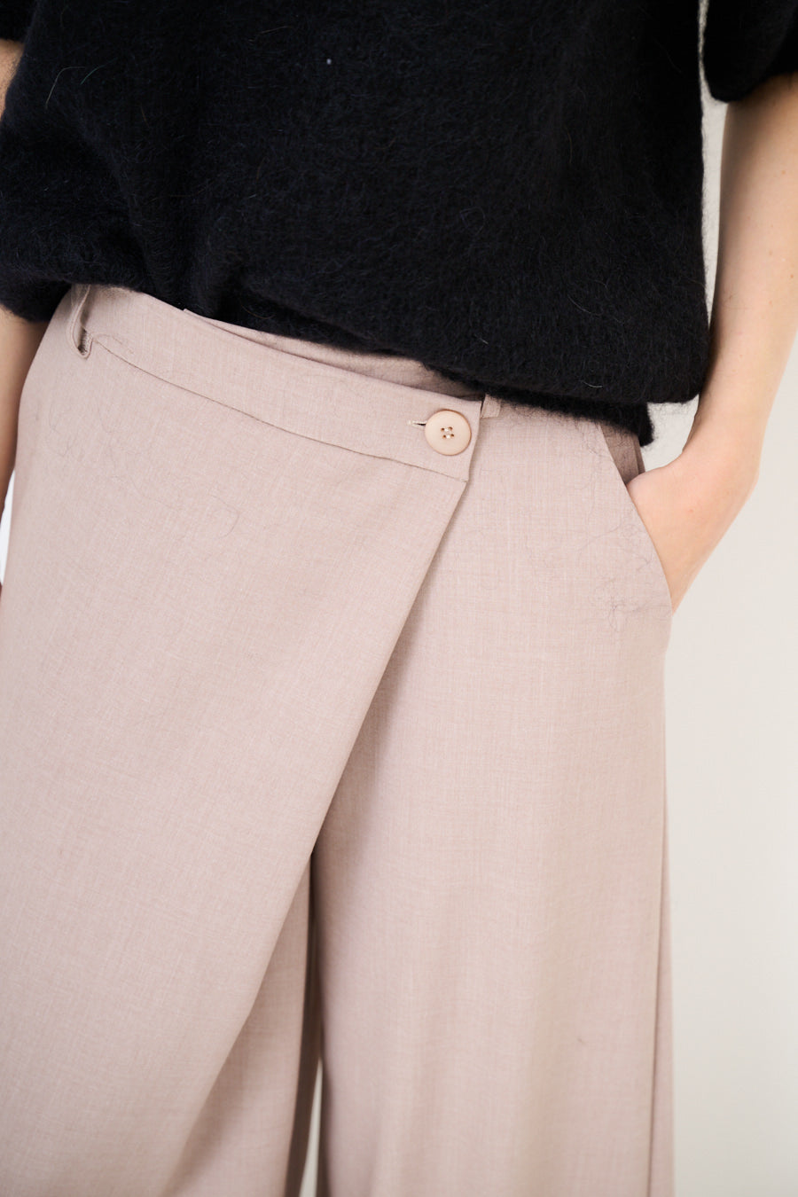 Epäsymmetrinen painike yksityiskohta leveä jalkahousu tukkumyynti