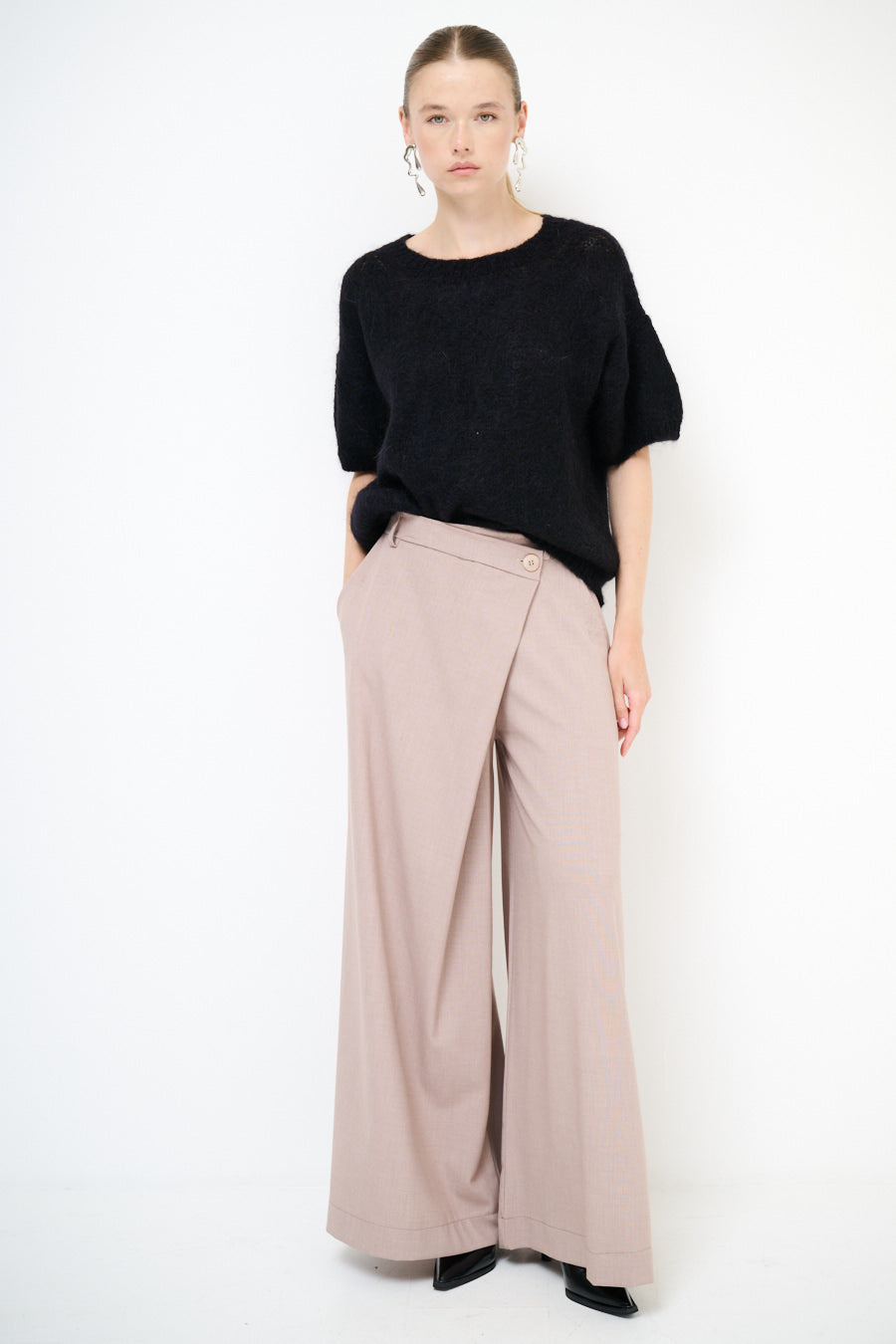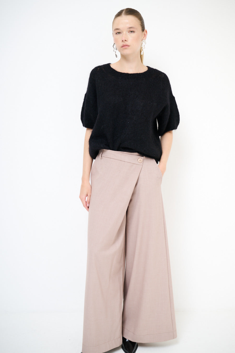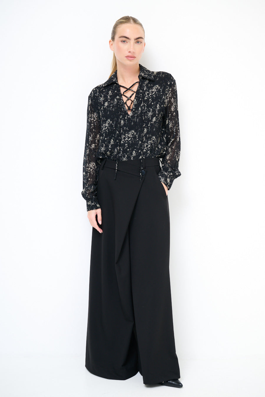 Epäsymmetrinen painike yksityiskohta leveä jalkahousu tukkumyynti
