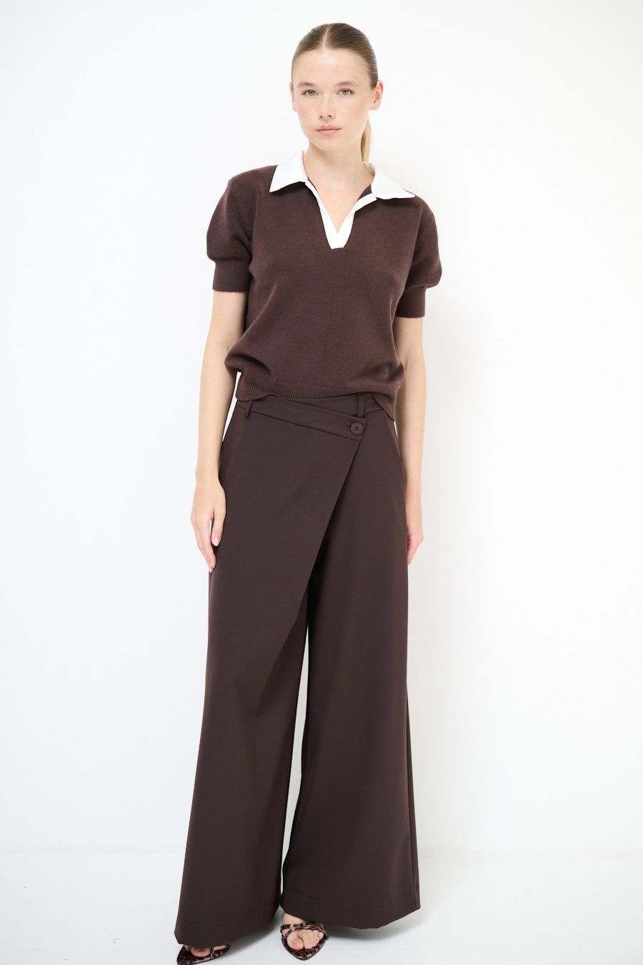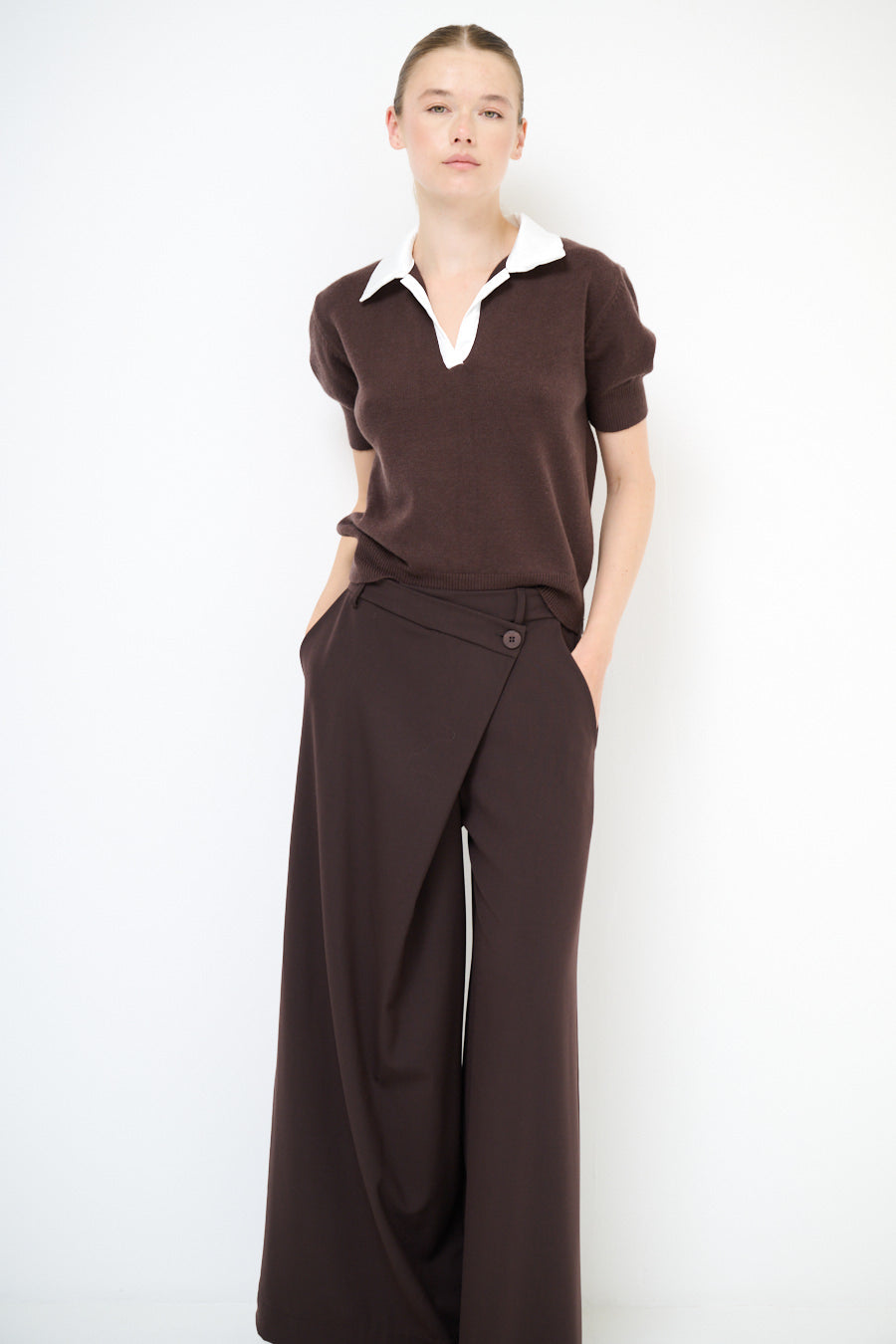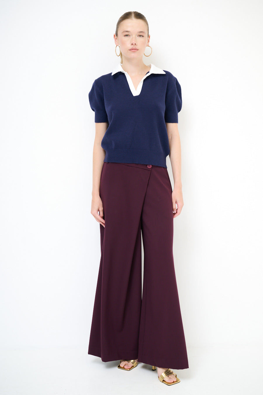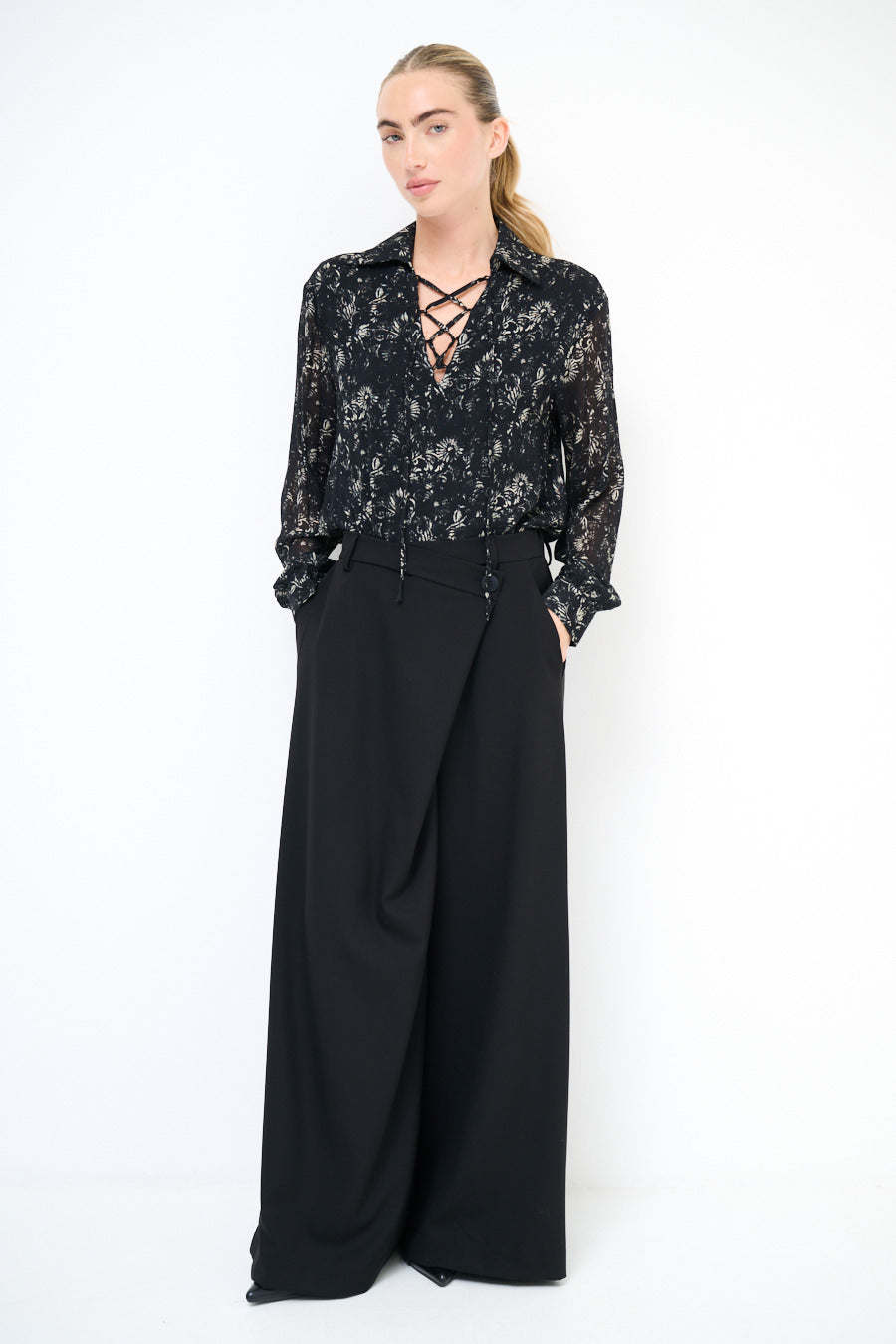 Epäsymmetrinen painike yksityiskohta leveä jalkahousu tukkumyynti