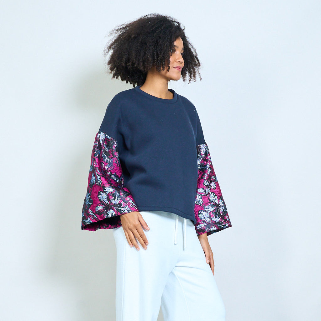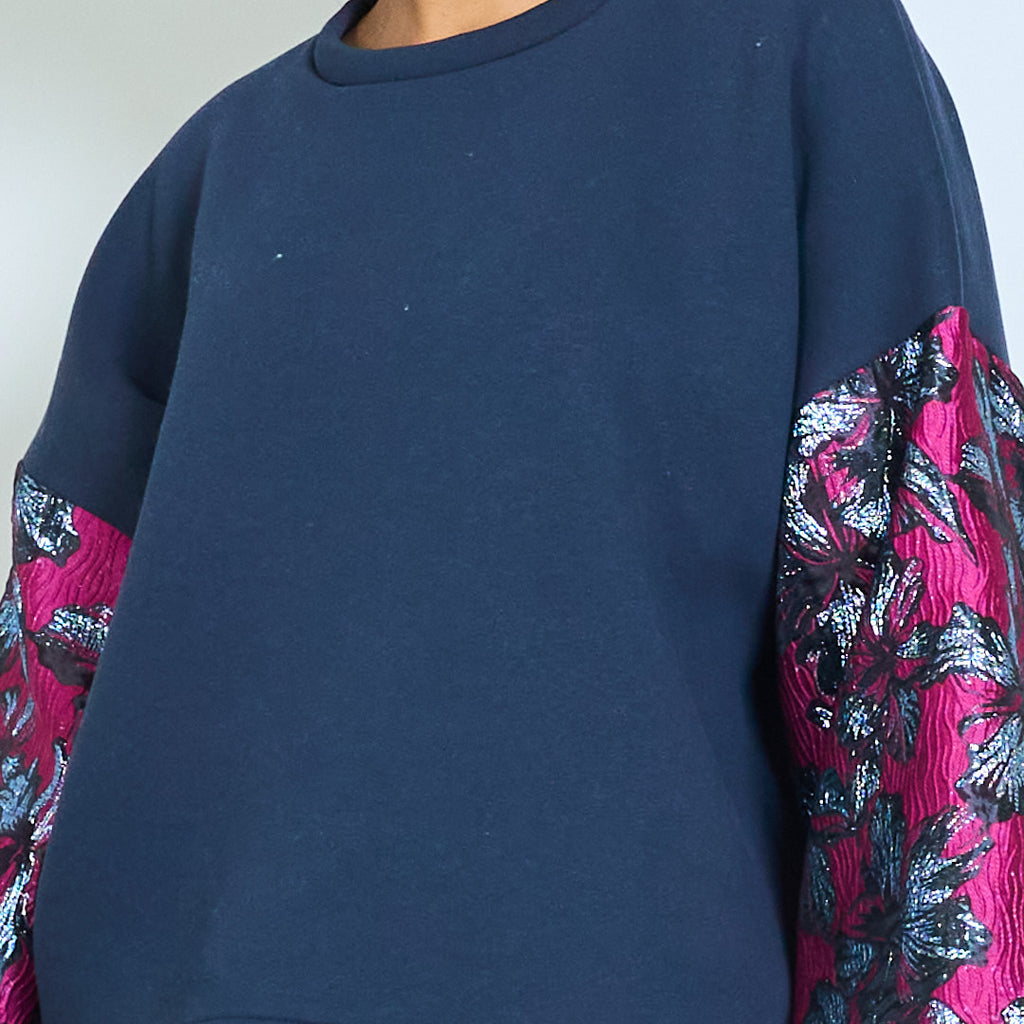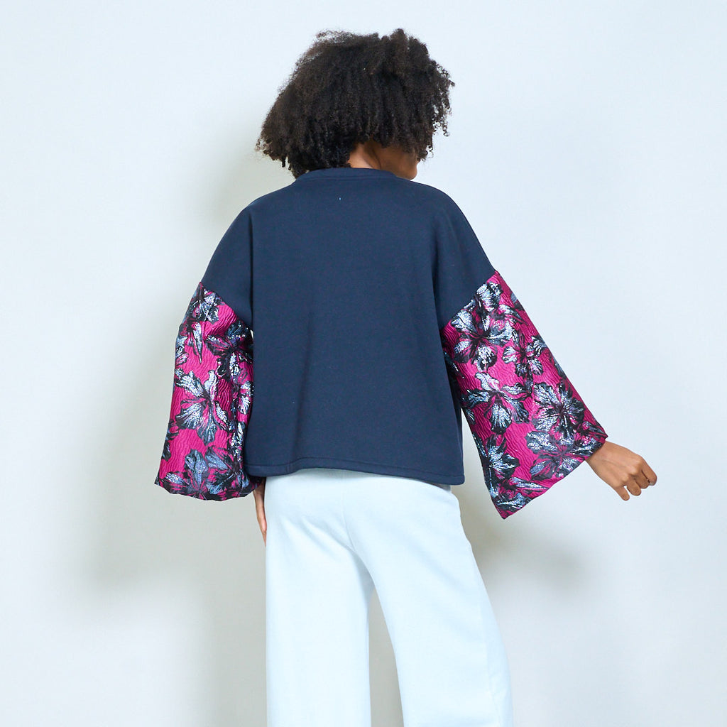 - Siinä on silmiinpistävä kukkainen jacquard-kellohiha, joka antaa tyylikkään ilmeen