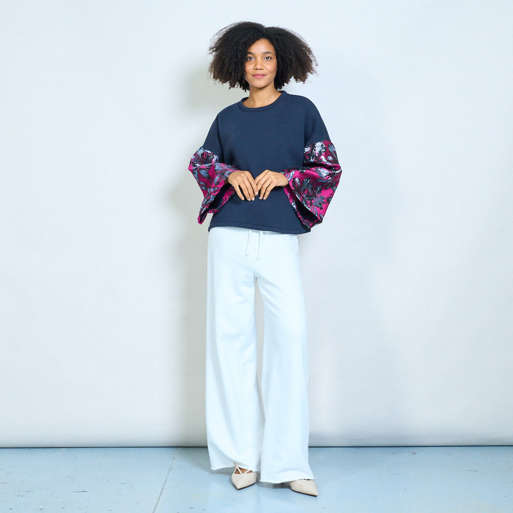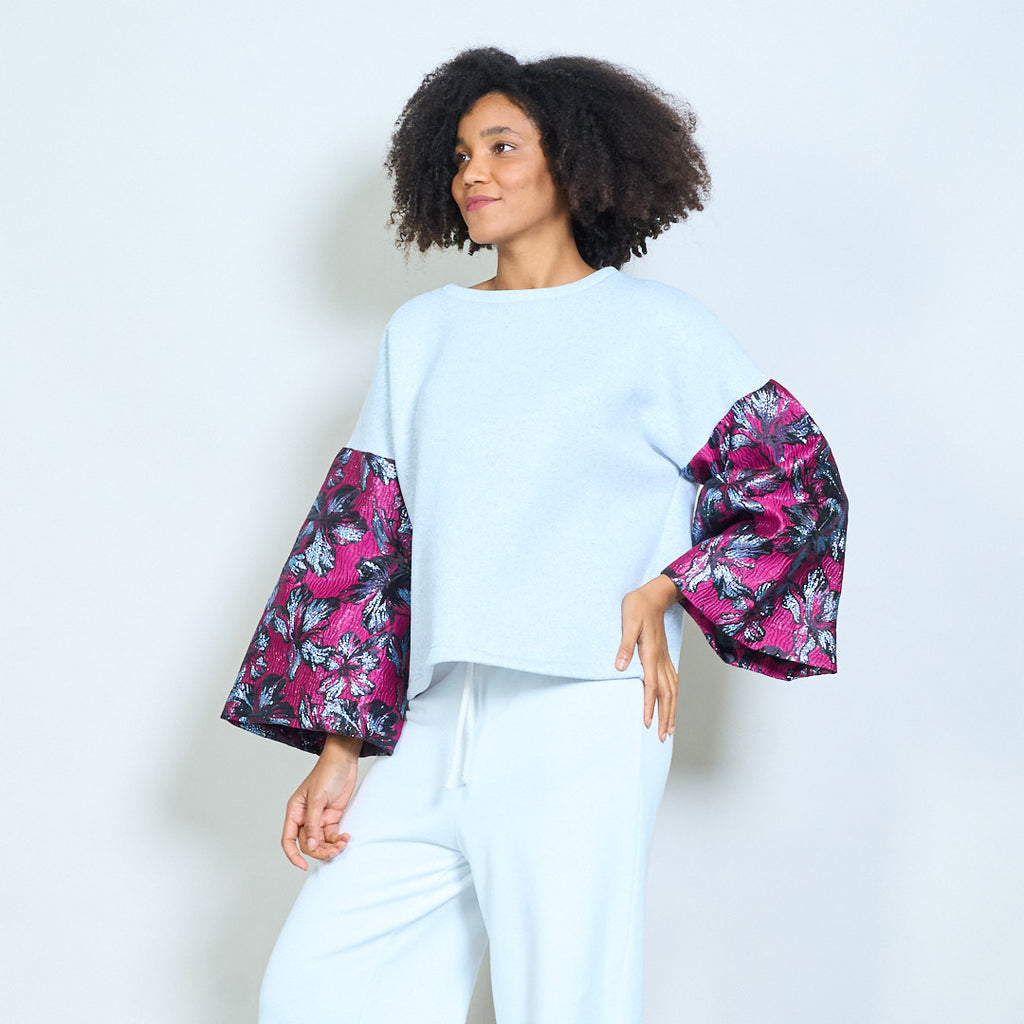 Kontrasti kukka jacquard bell hihainen pehmeä neulepusero tukkumyynti