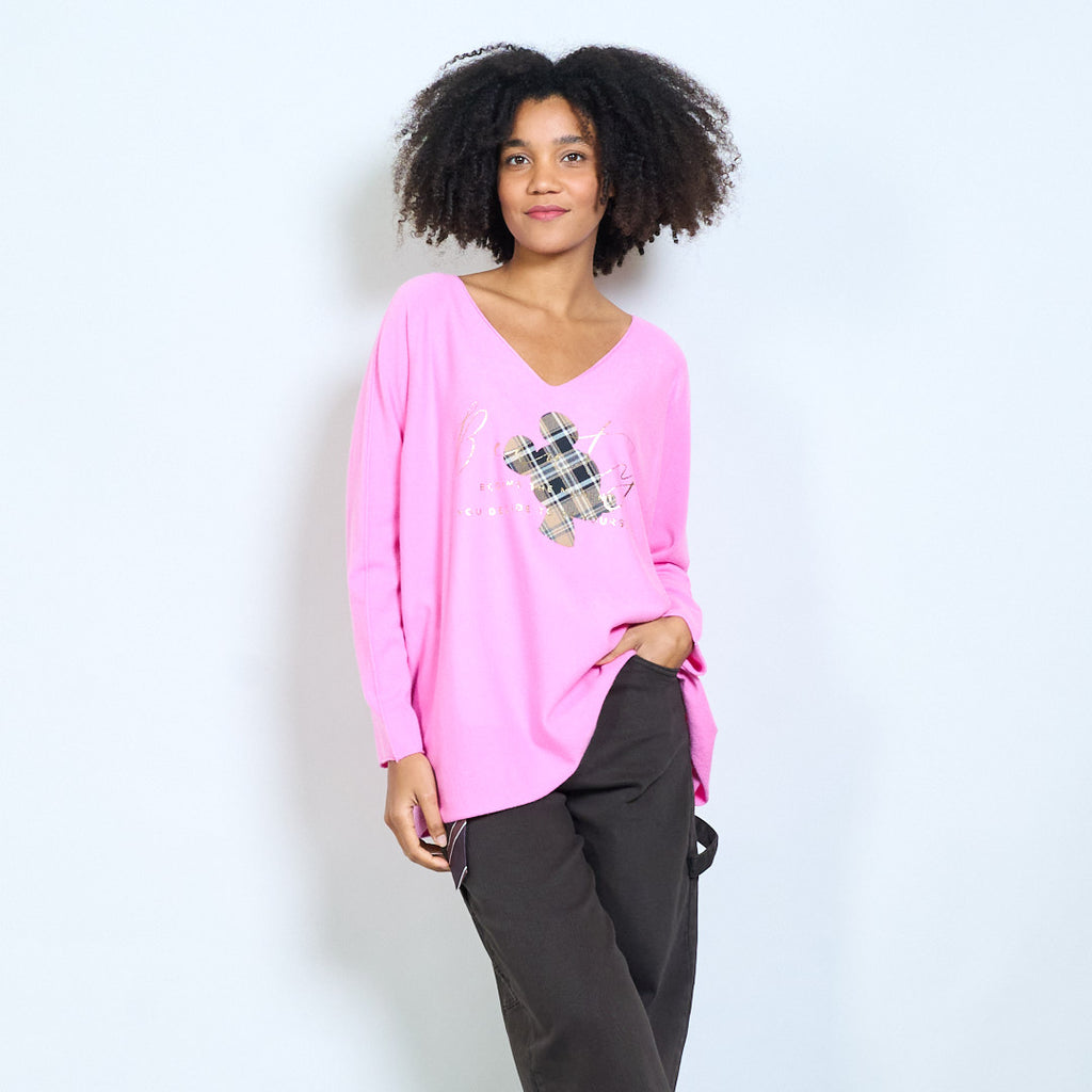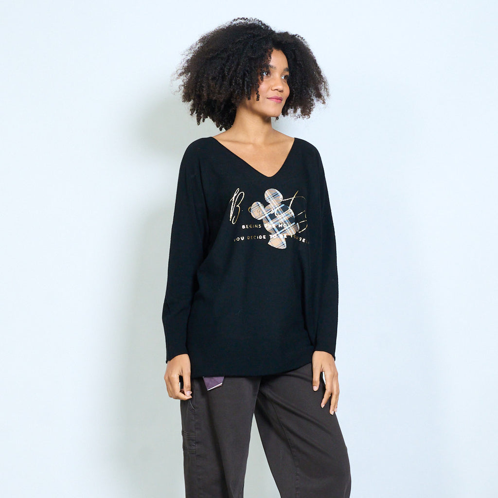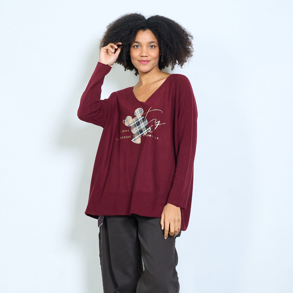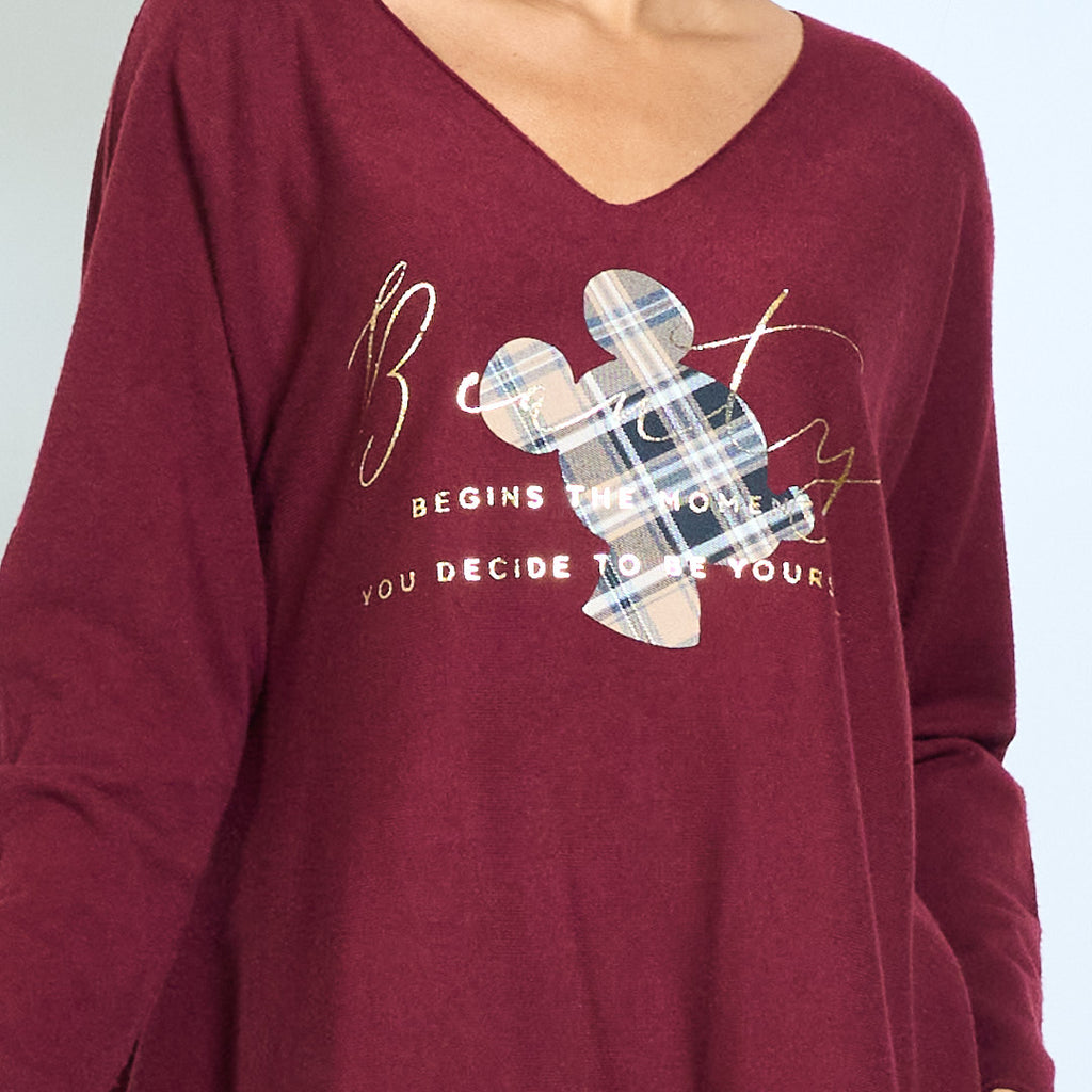 Ruudullinen mikkihiirigrafiikka "Alkaa siitä hetkestä kun päätät olla oma itsesi" painettu v-pääntie neulottu toppi tukkumyynti
