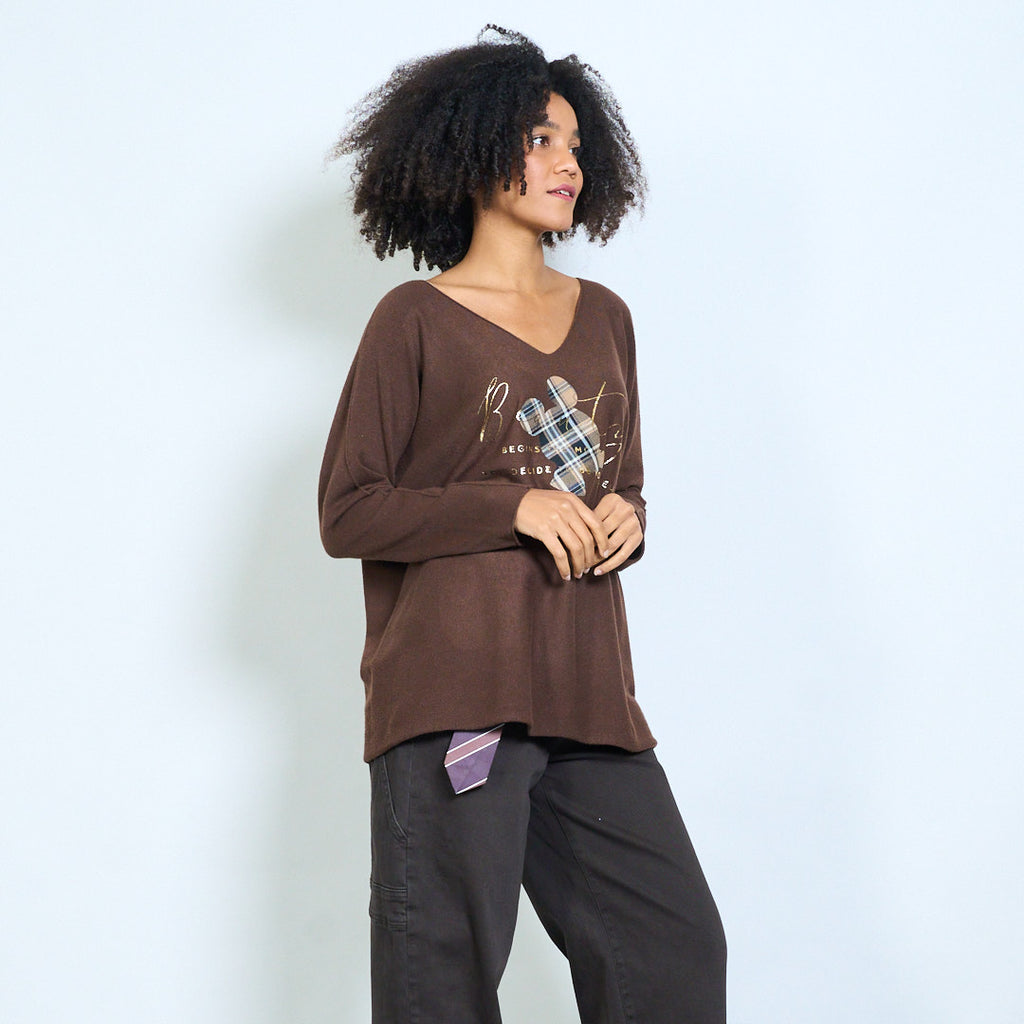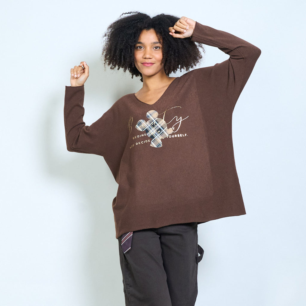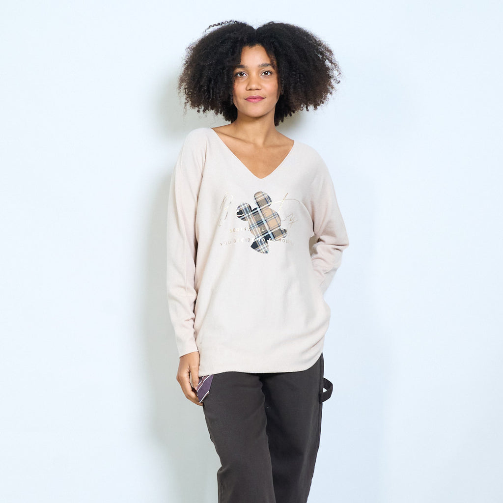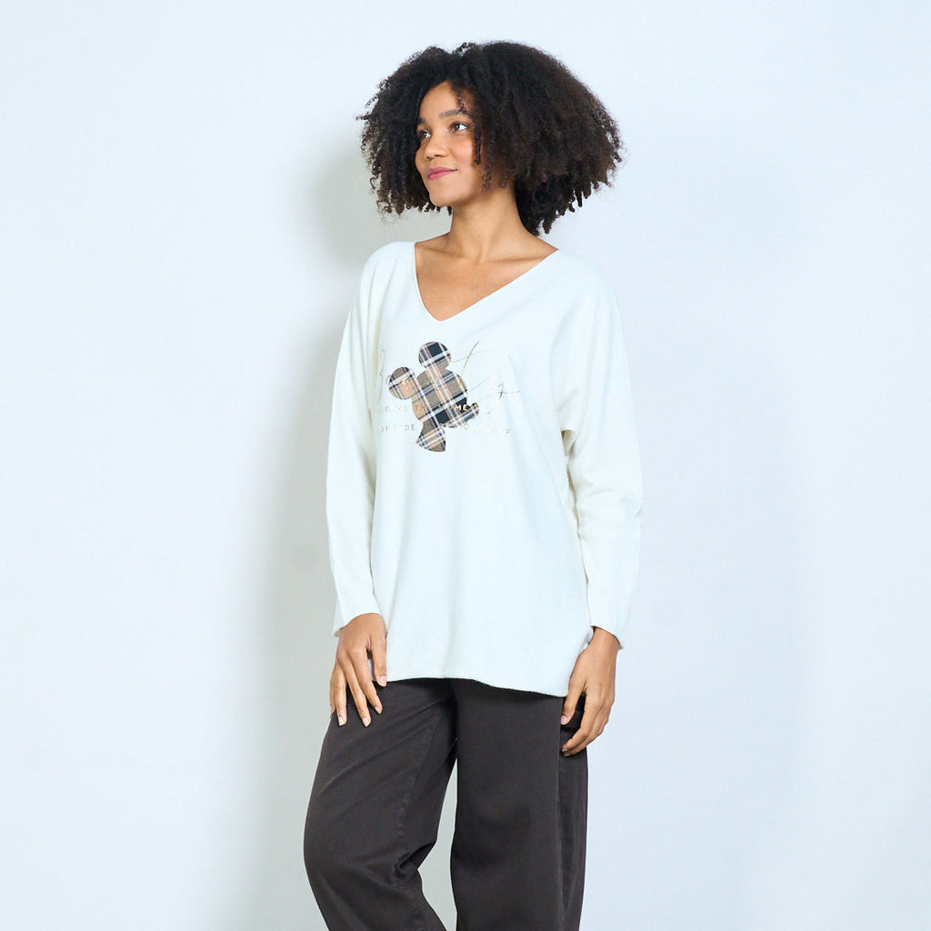 Ruudullinen mikkihiirigrafiikka "Alkaa siitä hetkestä kun päätät olla oma itsesi" painettu v-pääntie neulottu toppi tukkumyynti