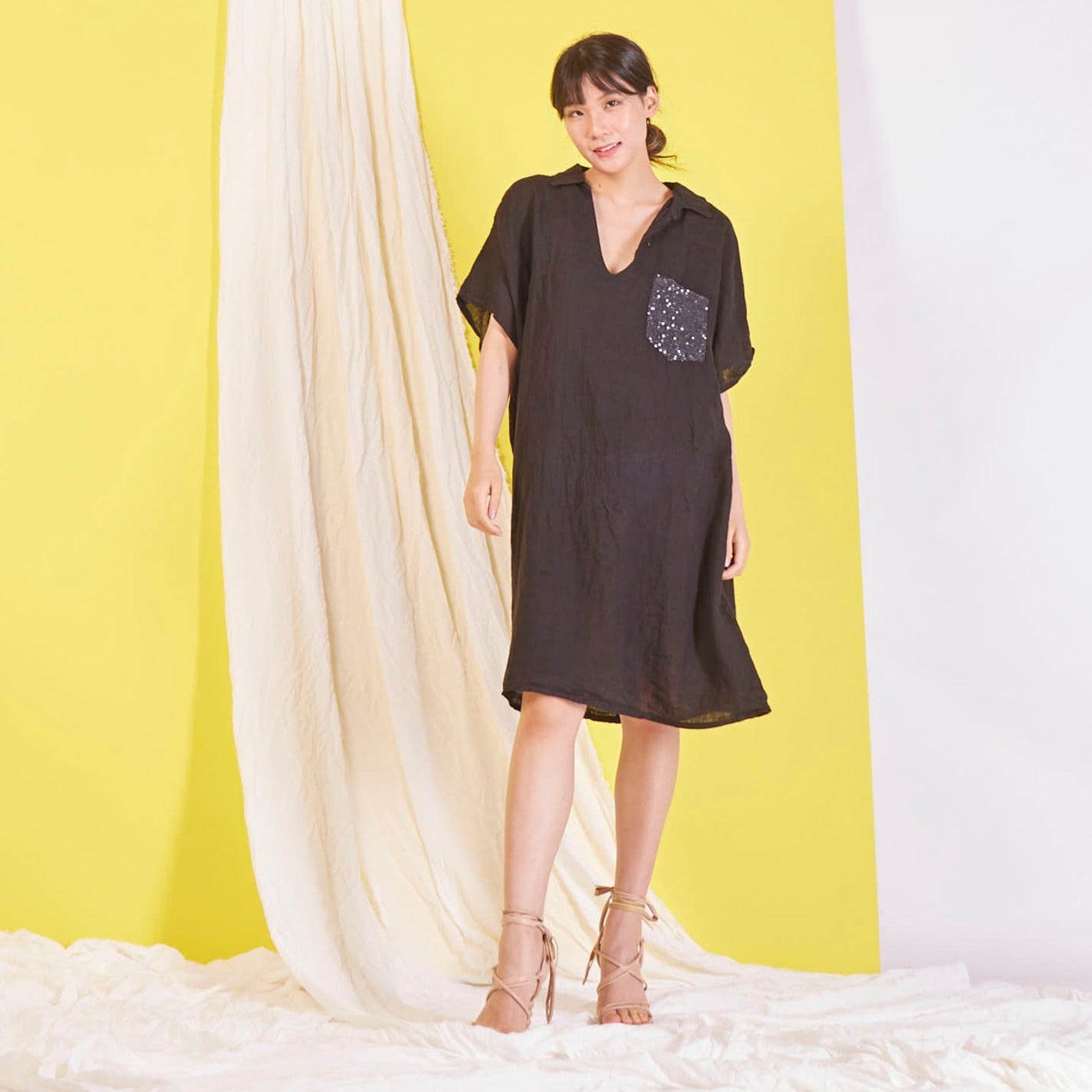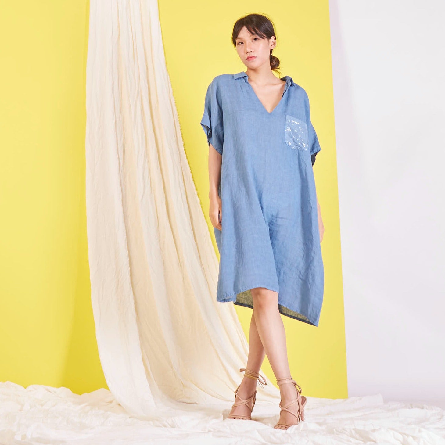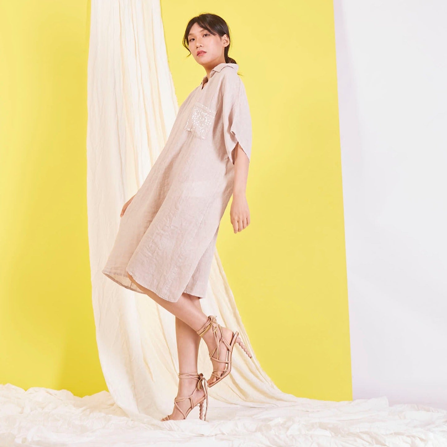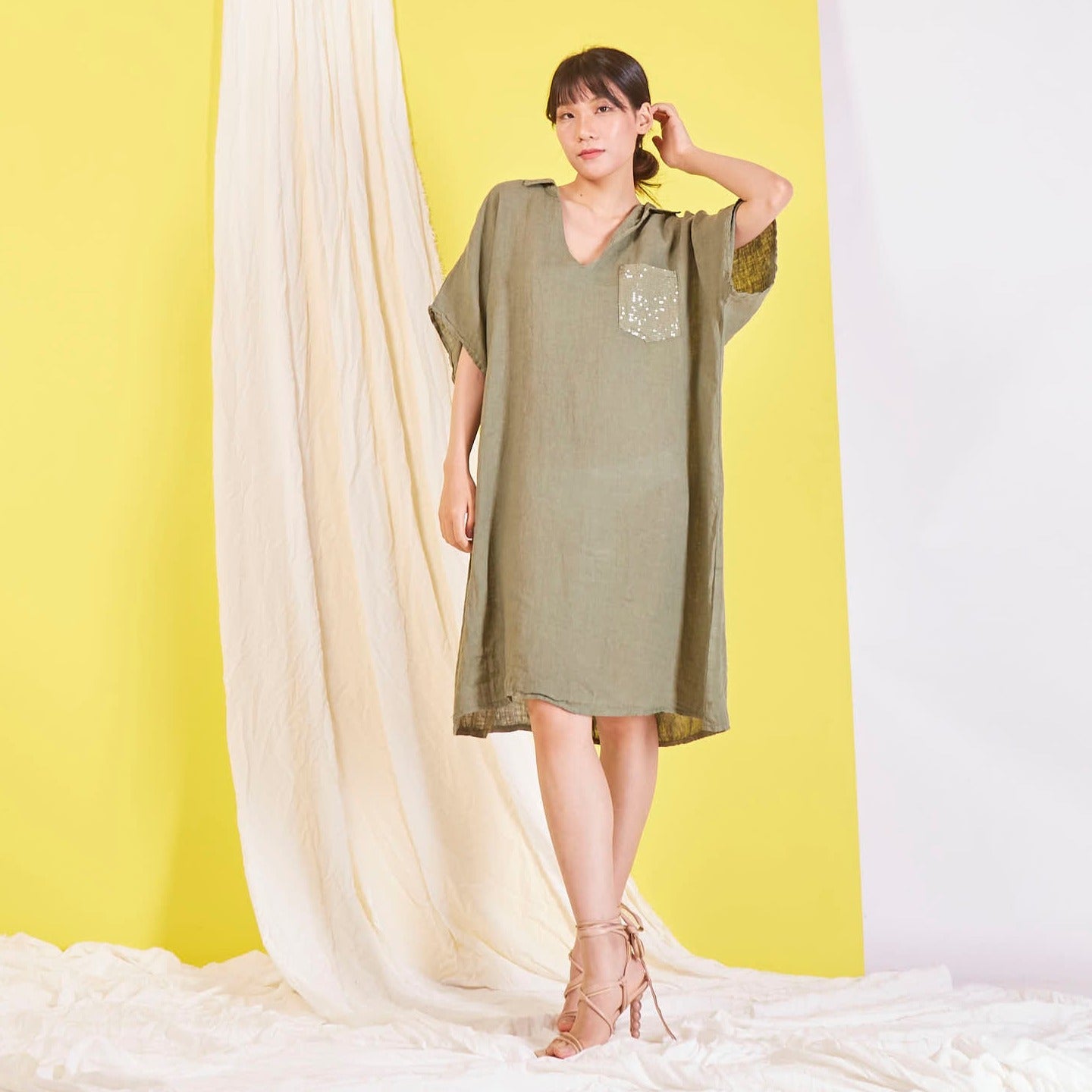 Tukkumyynti maxi pellavamekko paljetti taskulla