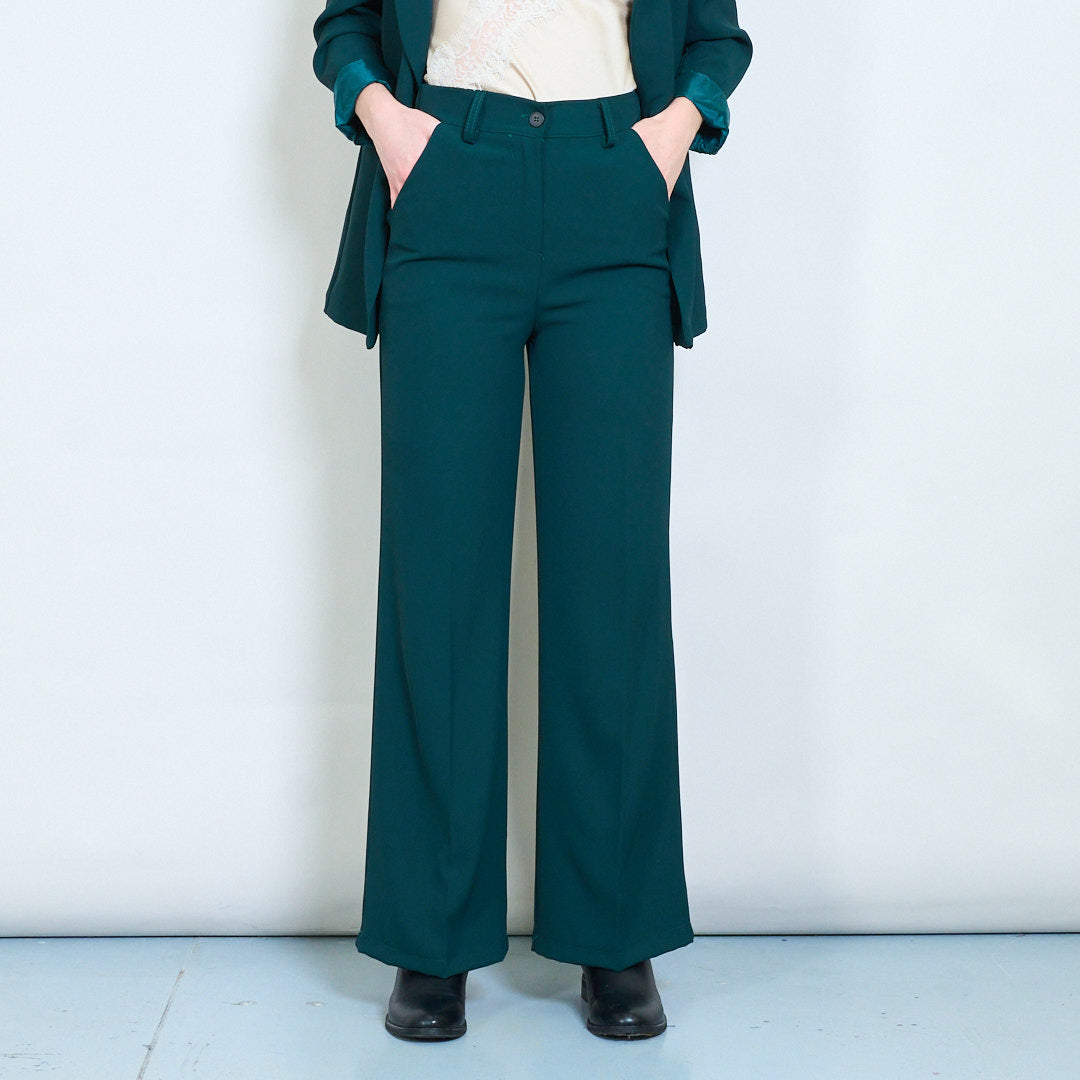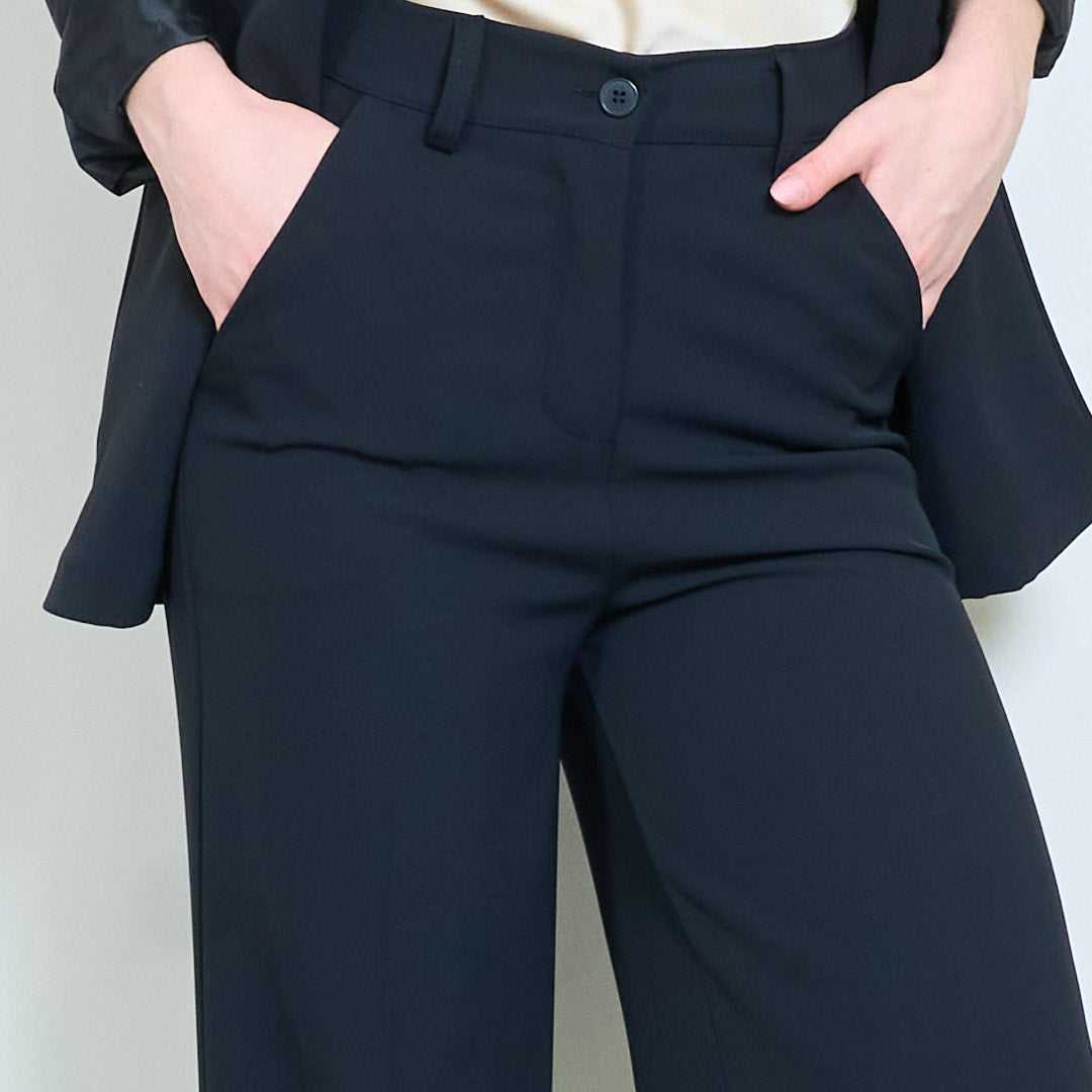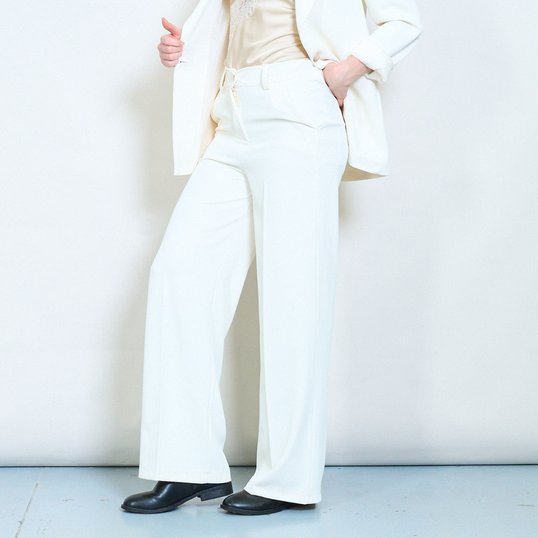 - Korkeavyötäröiset housut, joissa edessä laskokset ja toimivat taskut