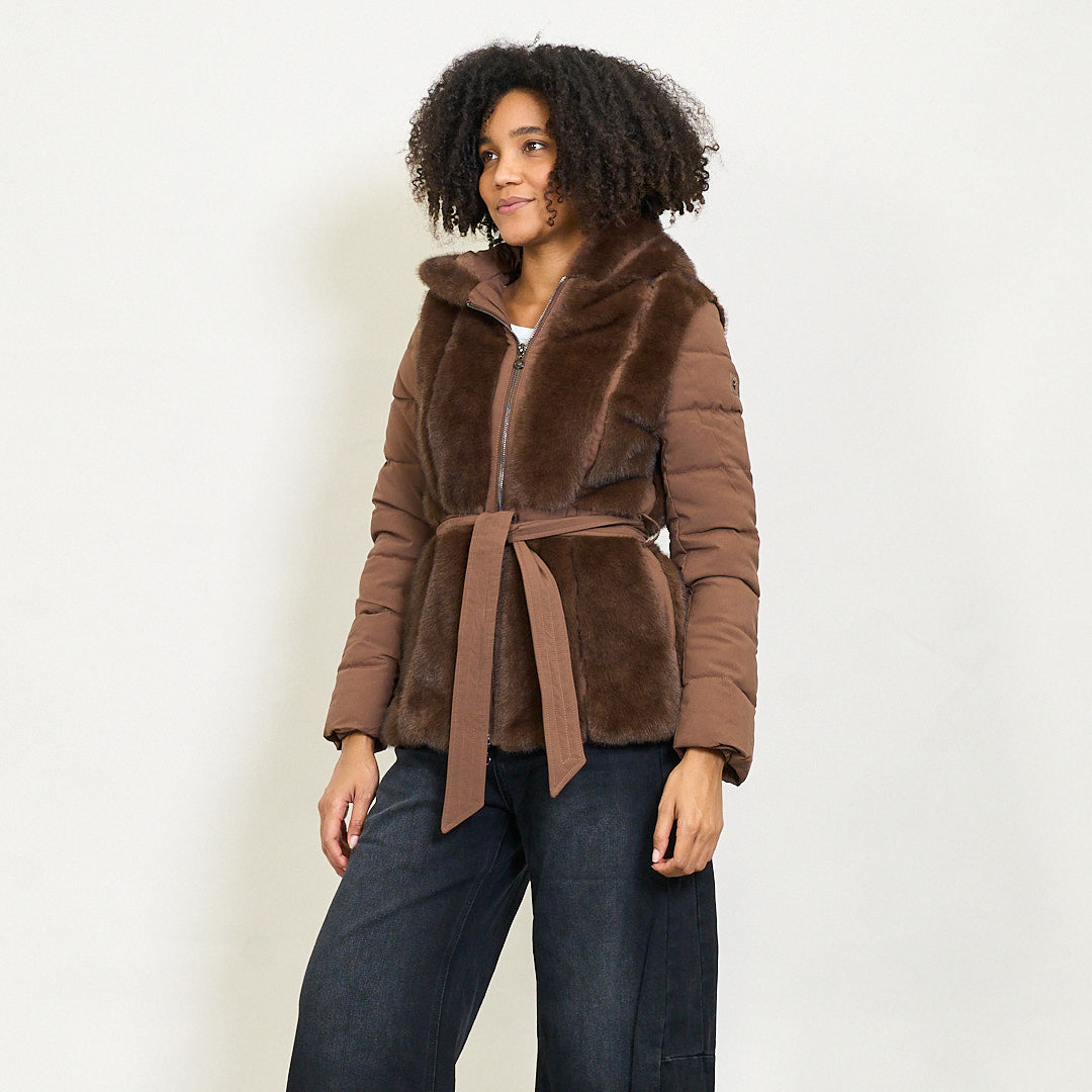 Asennettu pehmustettu takki, jossa on keinotekoinen turkis etu- ja solmihihnan tukkumyynti
