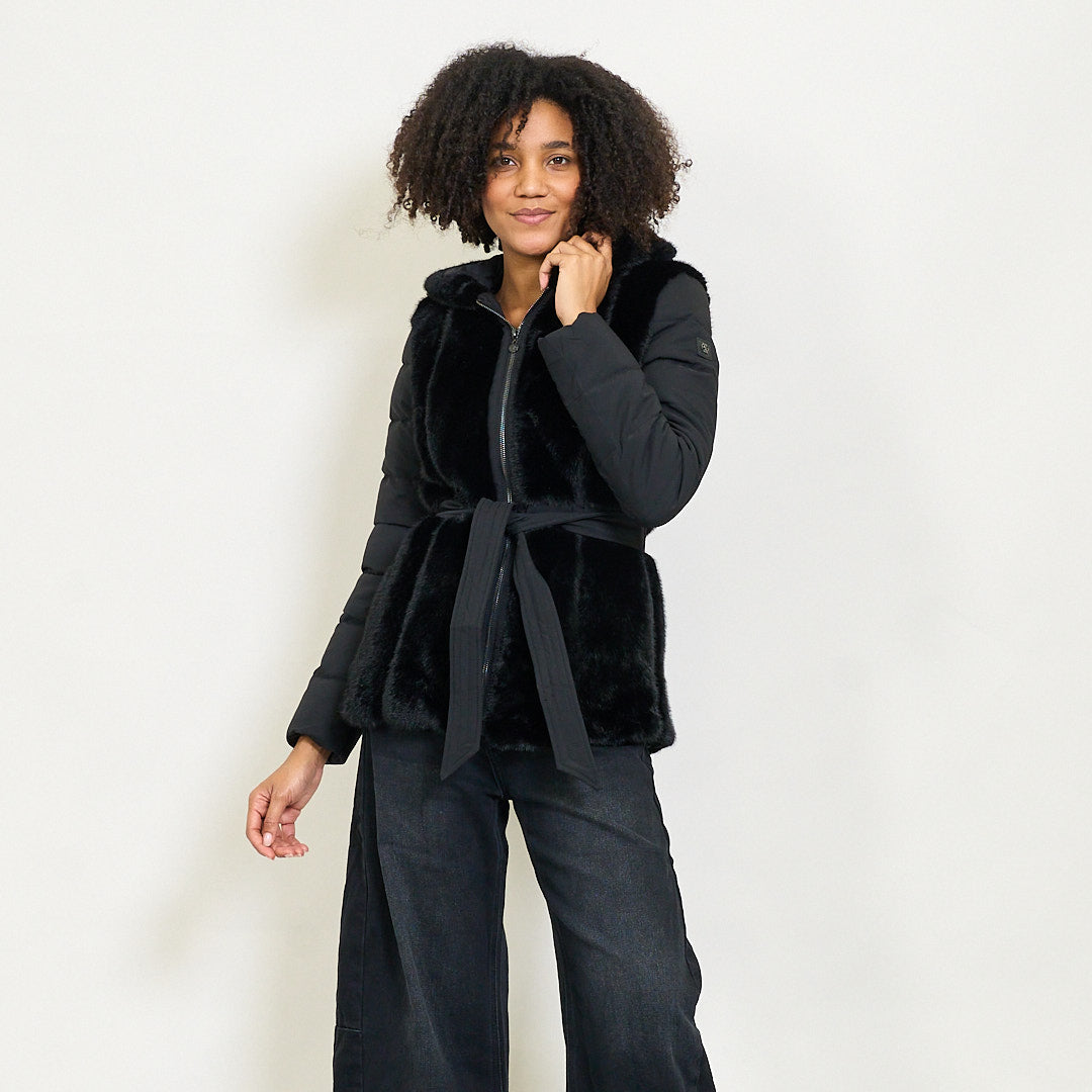 - Pehmeä faux -turkis etupaneeli ja huppu