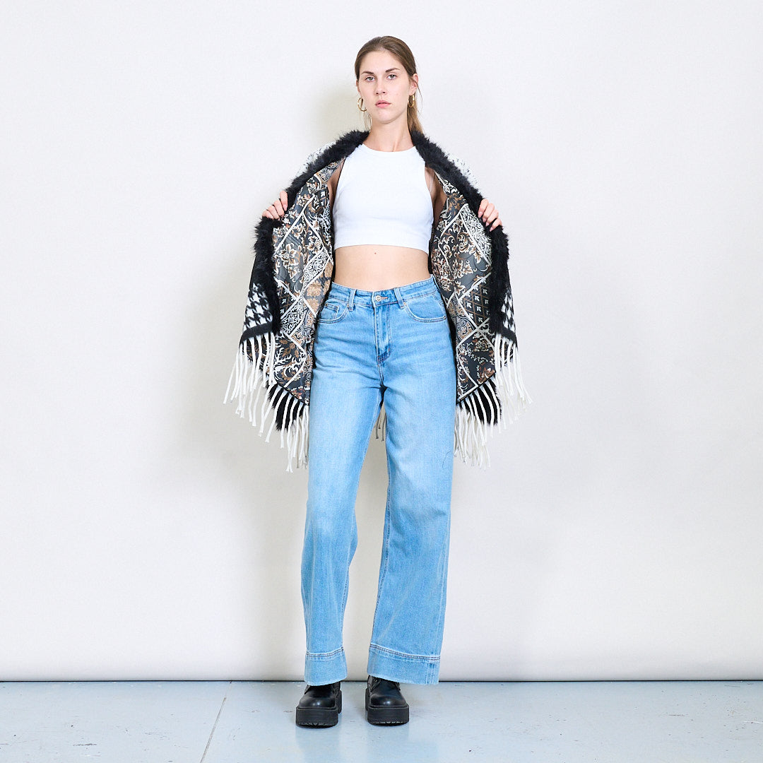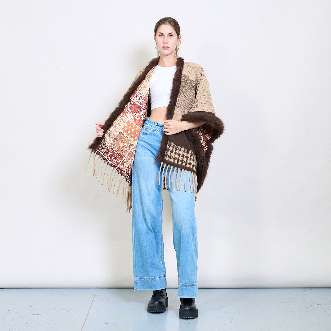 Painettu fringe poncho keinotekoisella turkisverhoilulla ja barokin sisävuorilla tukkumyyntiä