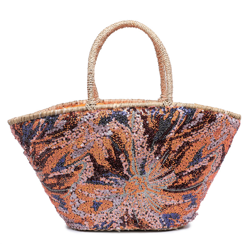 - Käsin kudottu olki -laukku, joka on täysin koristeltu häikäisevällä kukka -paljetella