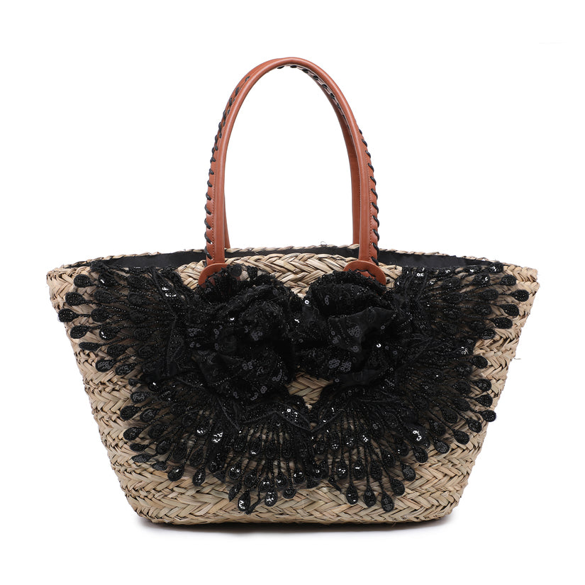 Straw Shopper -pussi kerrostettujen pitsirosettien ja paljettituulettimen applikointi tukkumyynnissä