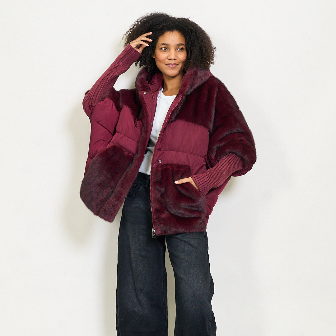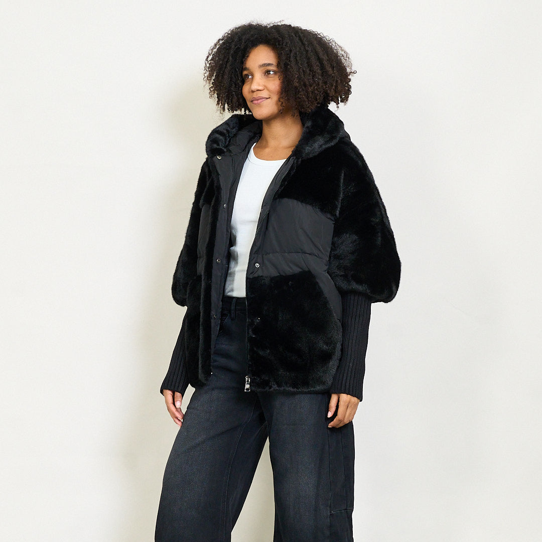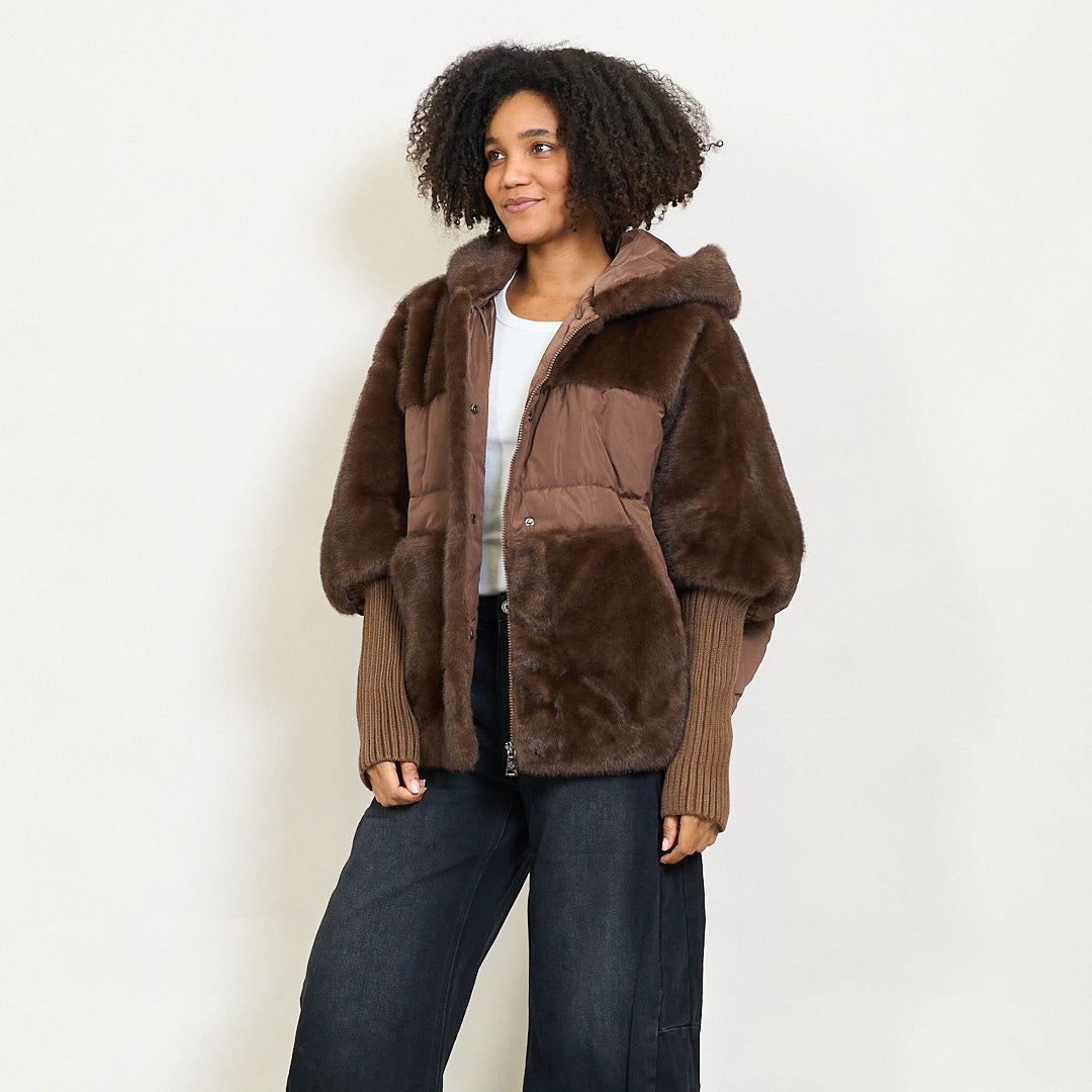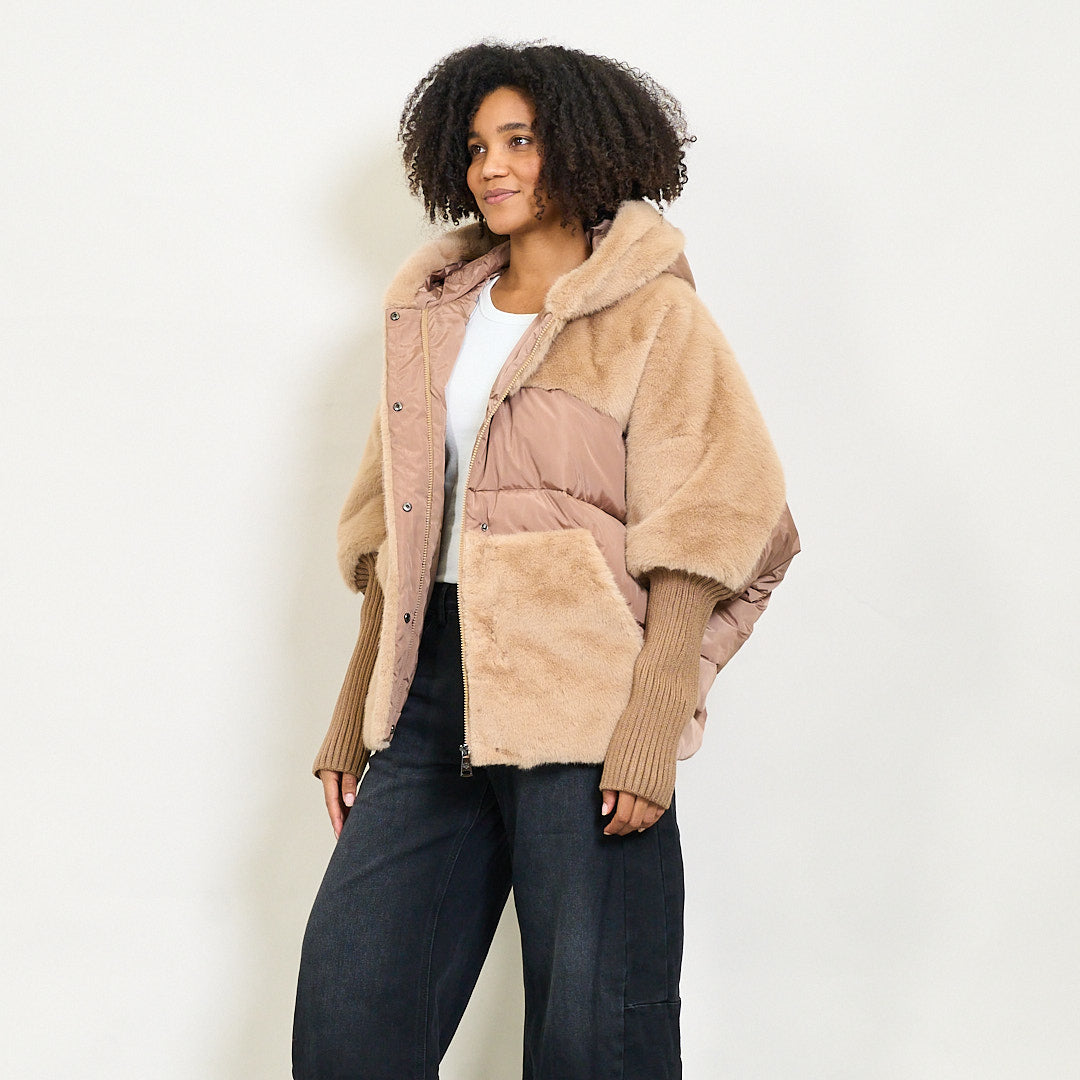 Hooded Faux -turkki ja pehmustettu sekoitettu takki uritetuilla hihoilla tukkumyynti