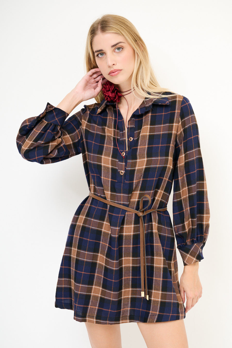 Plaid Print Belted Mini -paitamekko ilmapallohihat tukkumyynti