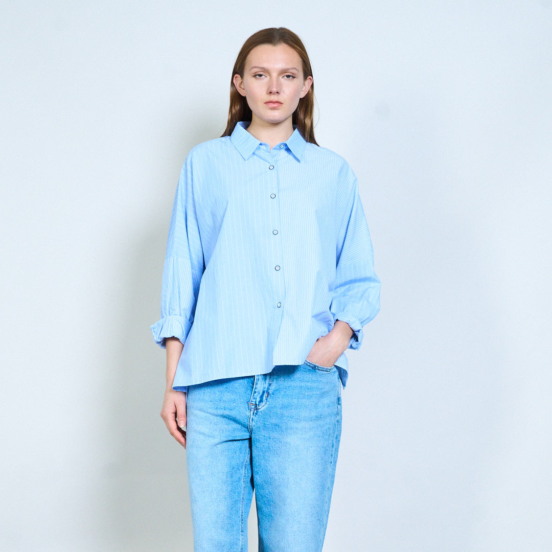 Hieno raidallinen nappi edessä rento paita tukkumyynti
