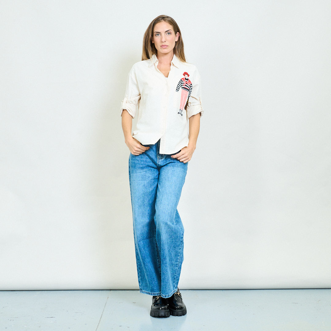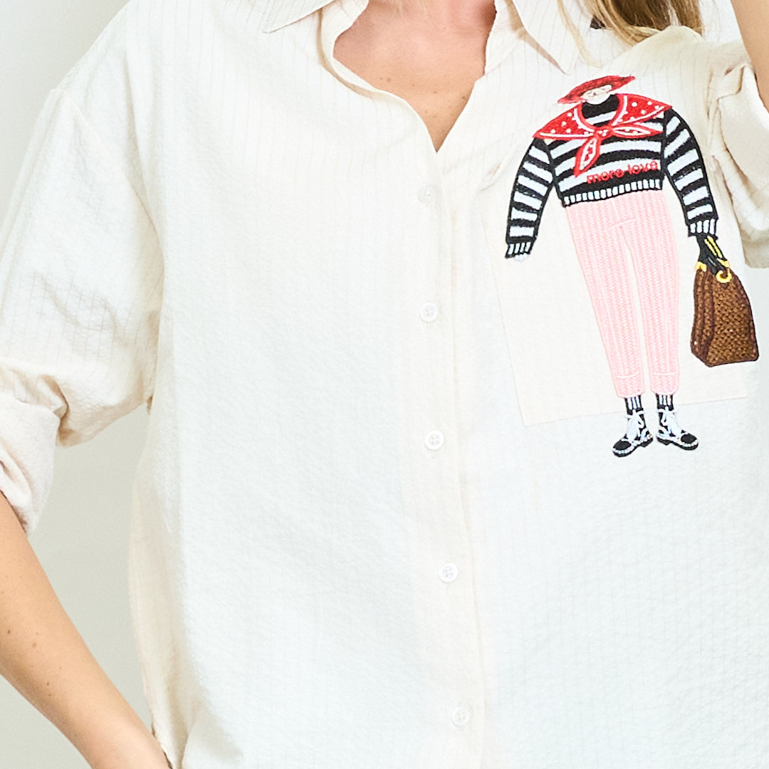 - Sarjakuvatyylisen naisen etukirjonta, jolla on laukku