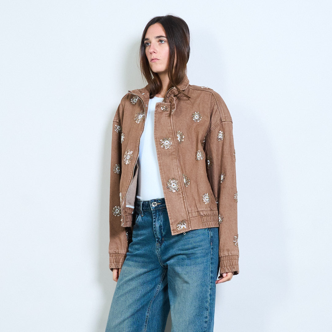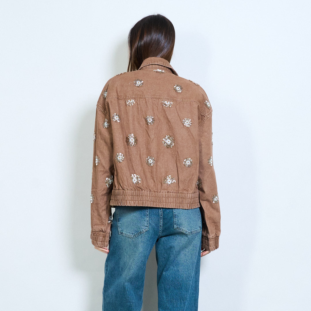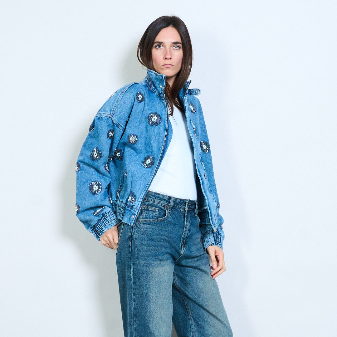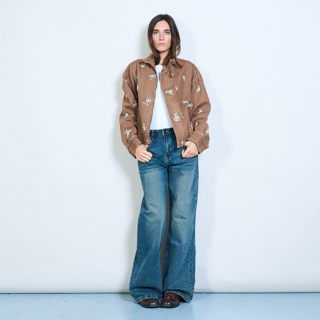 Koristeltu strassikiven kukka -aiheen rajattu farkkutakki tukkumyynti