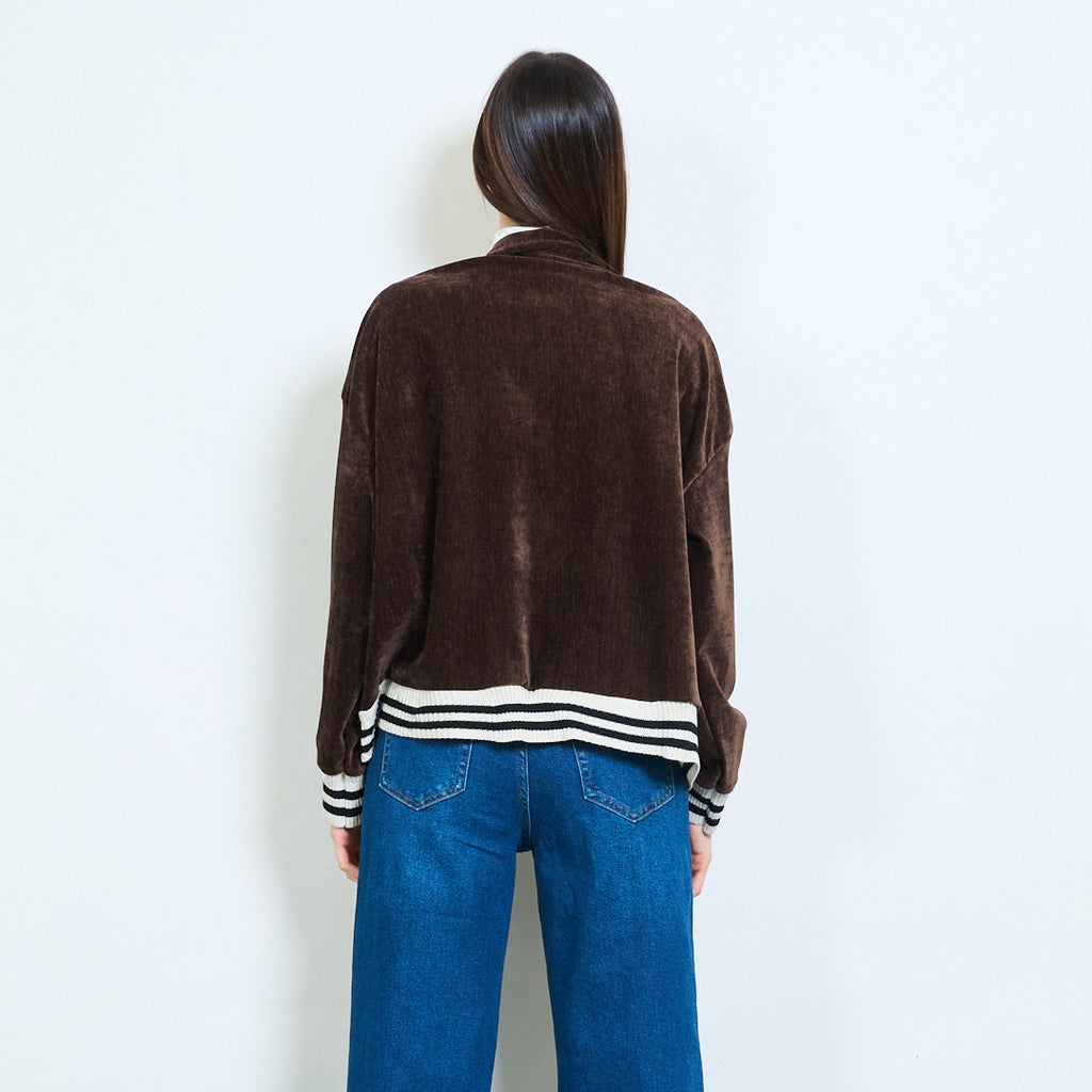 - Varsity-tyyliset raidalliset uritetut hihansuut ja helma urheilulliset yksityiskohdat