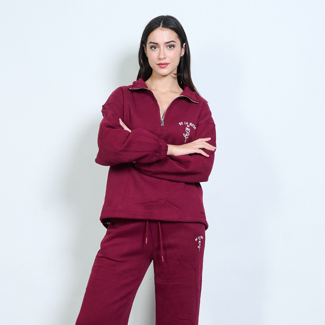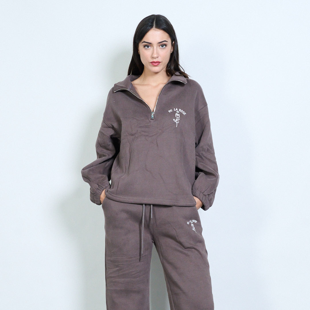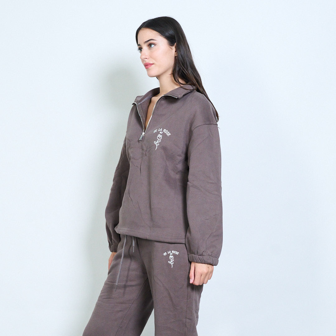 Puolivetoketjulla brodeerattu rento collegepaita ja housutsetti tukkumyynti