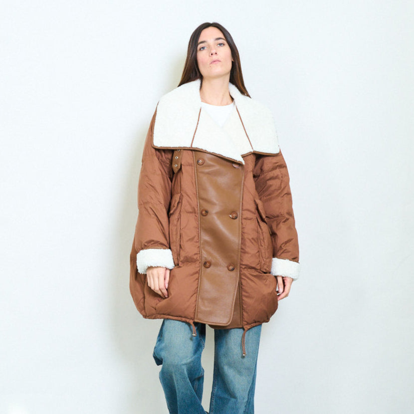 - Leveä faux shearling kaulus, joka tarjoaa pehmeää mukavuutta ja korotettua tyyliä