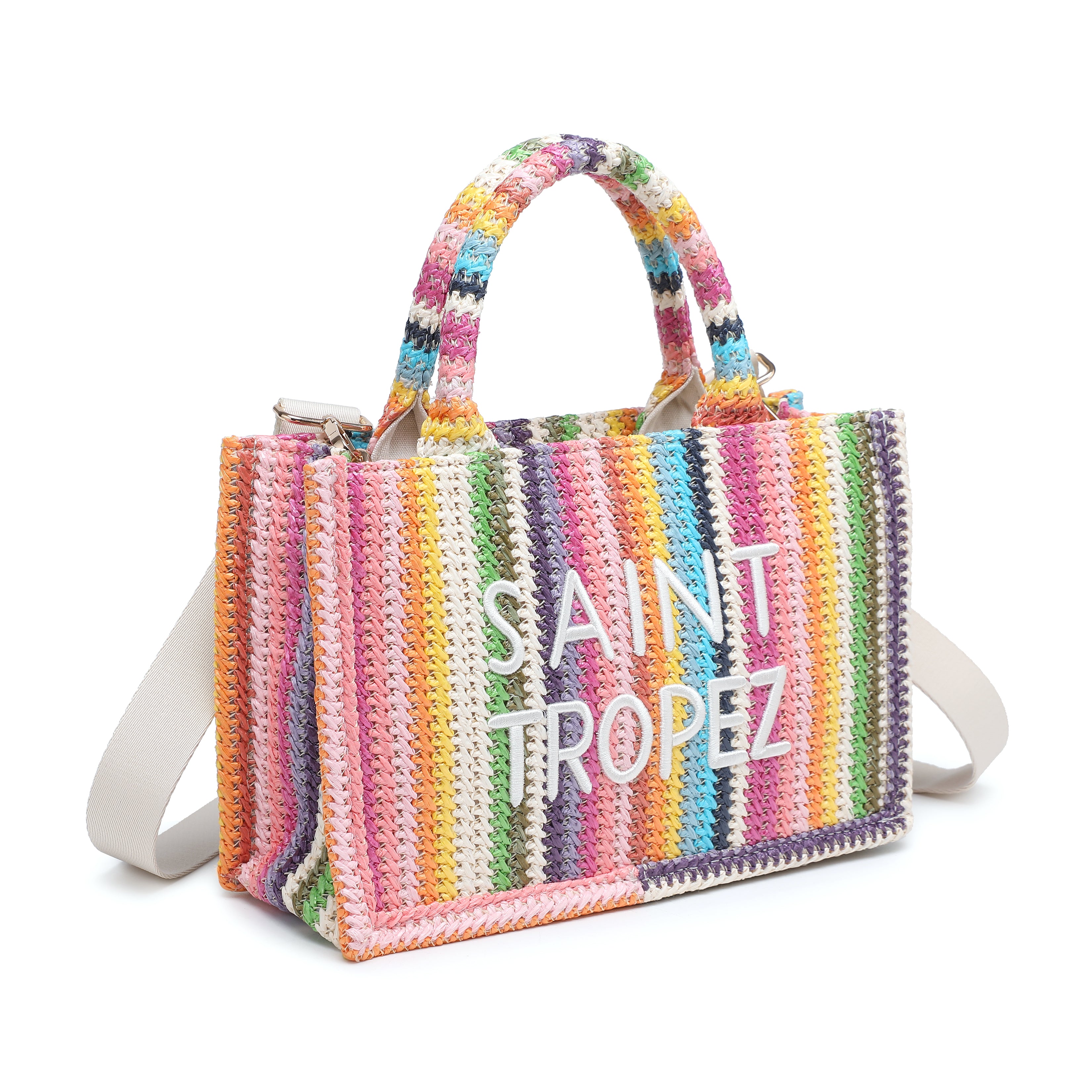 Kudottu olkilaukku, jossa kirjailtu Saint Tropez-teksti, tukkumyynti