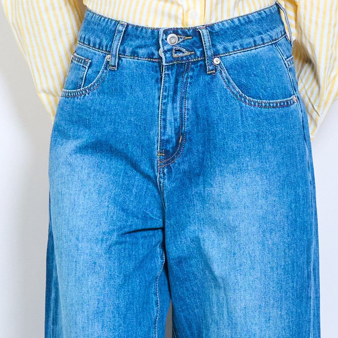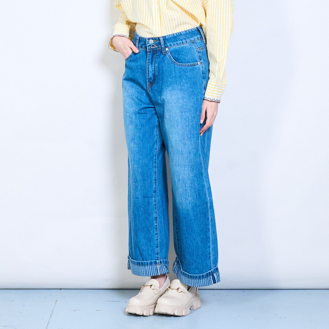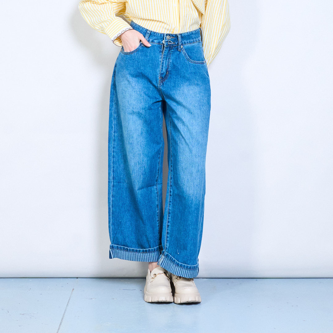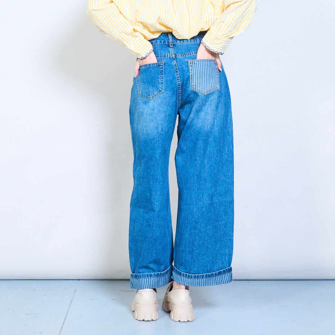 Korkea vyötärö leveät lahkeet hihansuissa helma denim housut tukkumyynti
