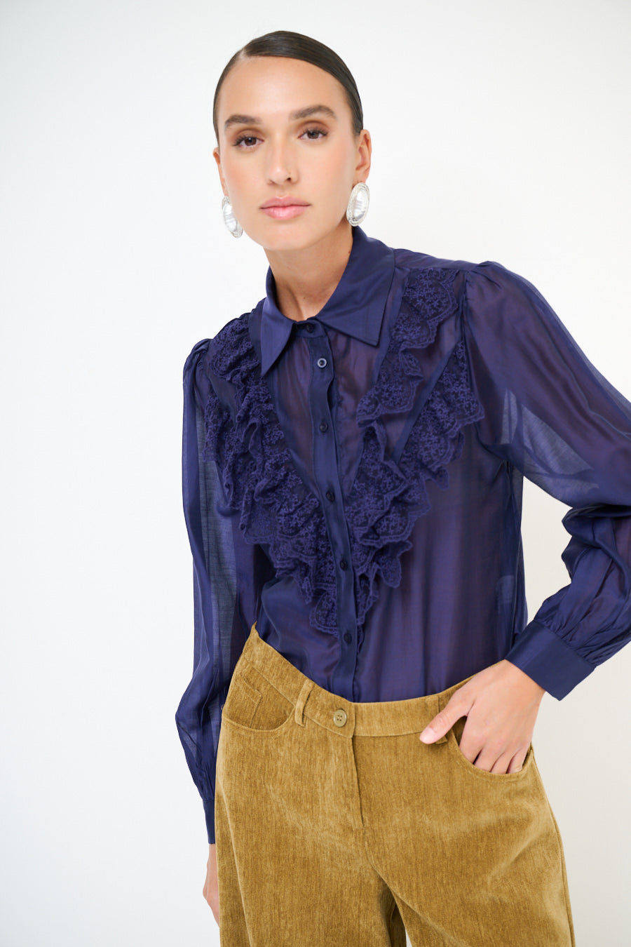 Chemisier boutonné transparent avec front en gros en dentelle en gros en gros