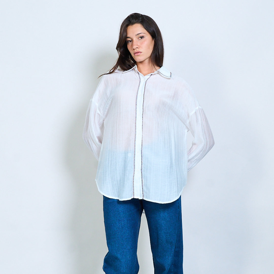Chemisier transparent avec garniture cousée et citation arrière "Plus Amor Por Favor" en gros