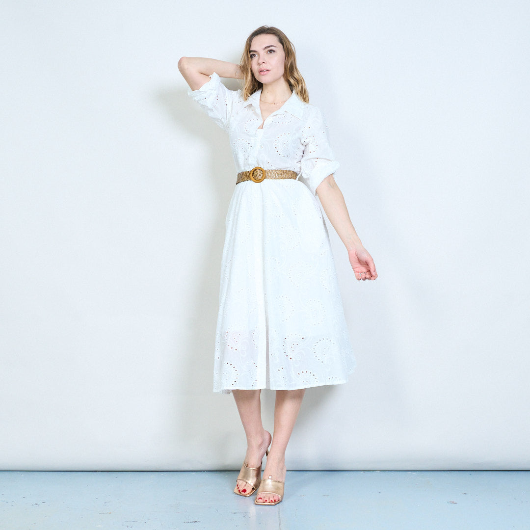 Bouton à œillets floraux à travers la robe midi avec col de chemise et cravate tressée à la taille en gros