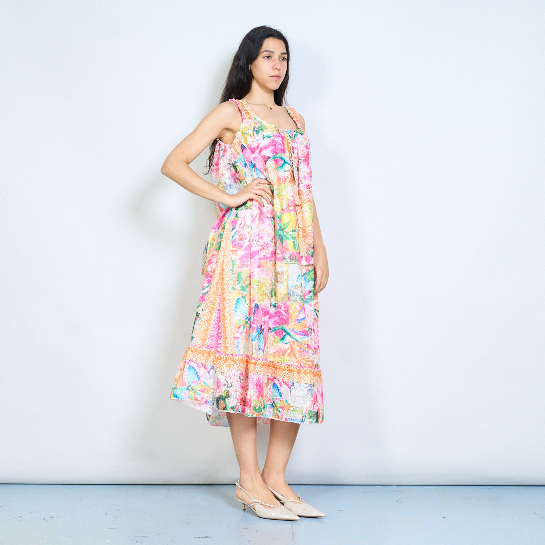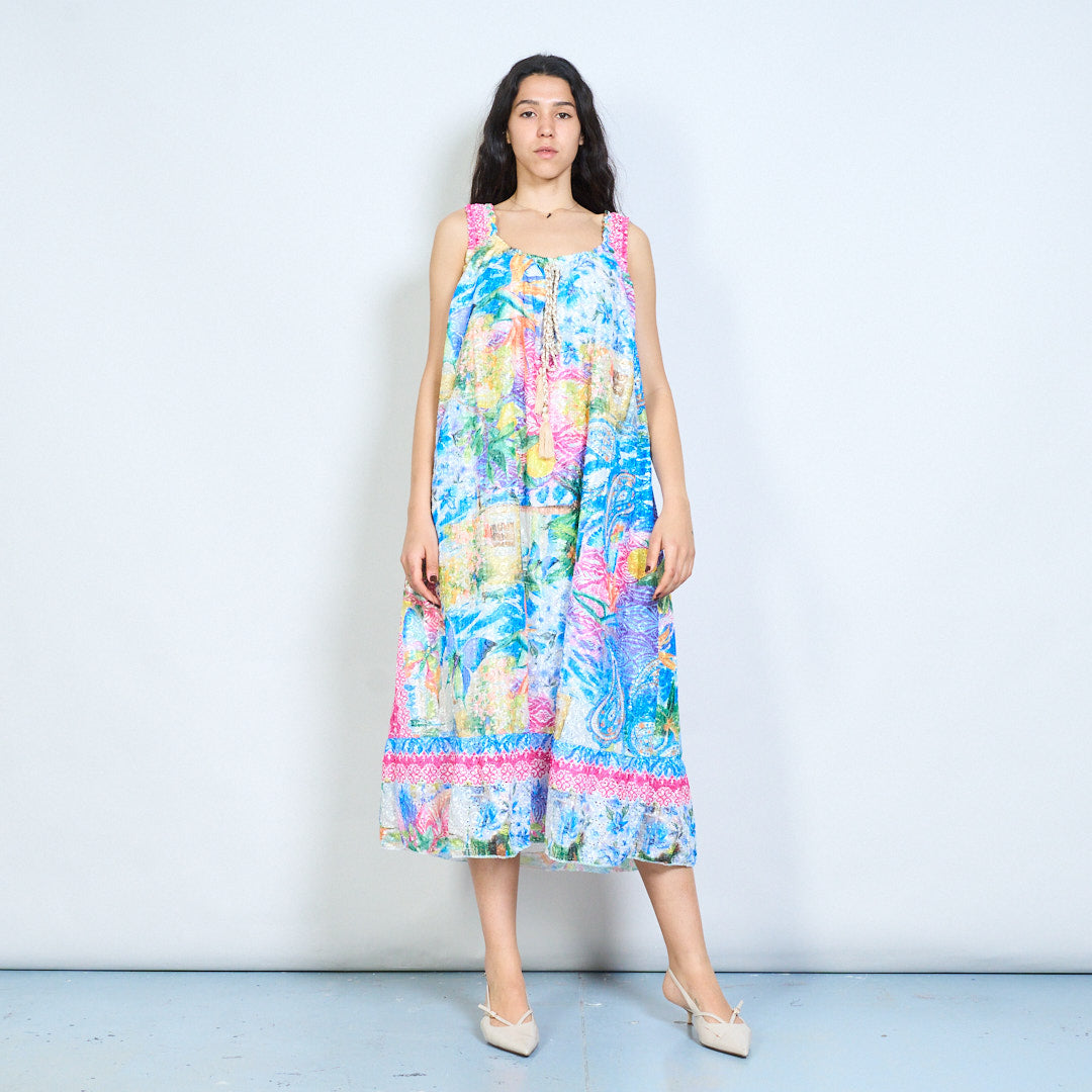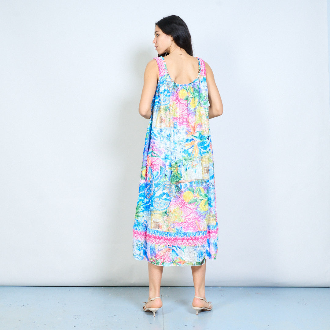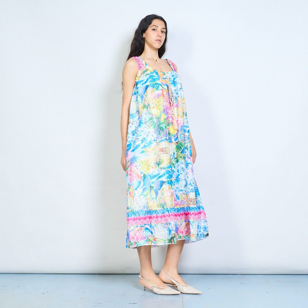 Robe longue sans manches, imprimé patchwork floral tropical, cravate à pampilles, vente en gros