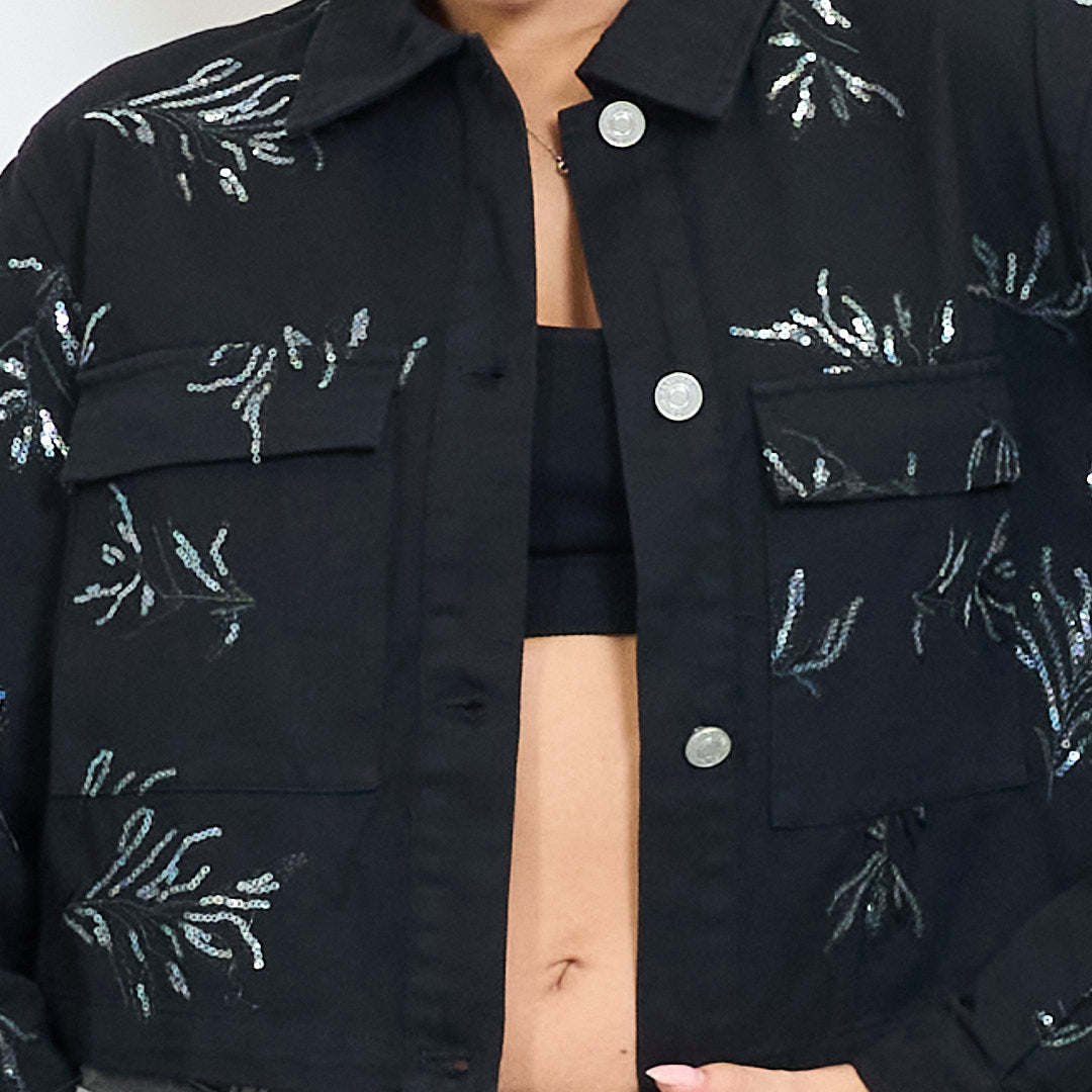 Veste courte brodée avec poches à volet et motif floral tonal en gros en gros