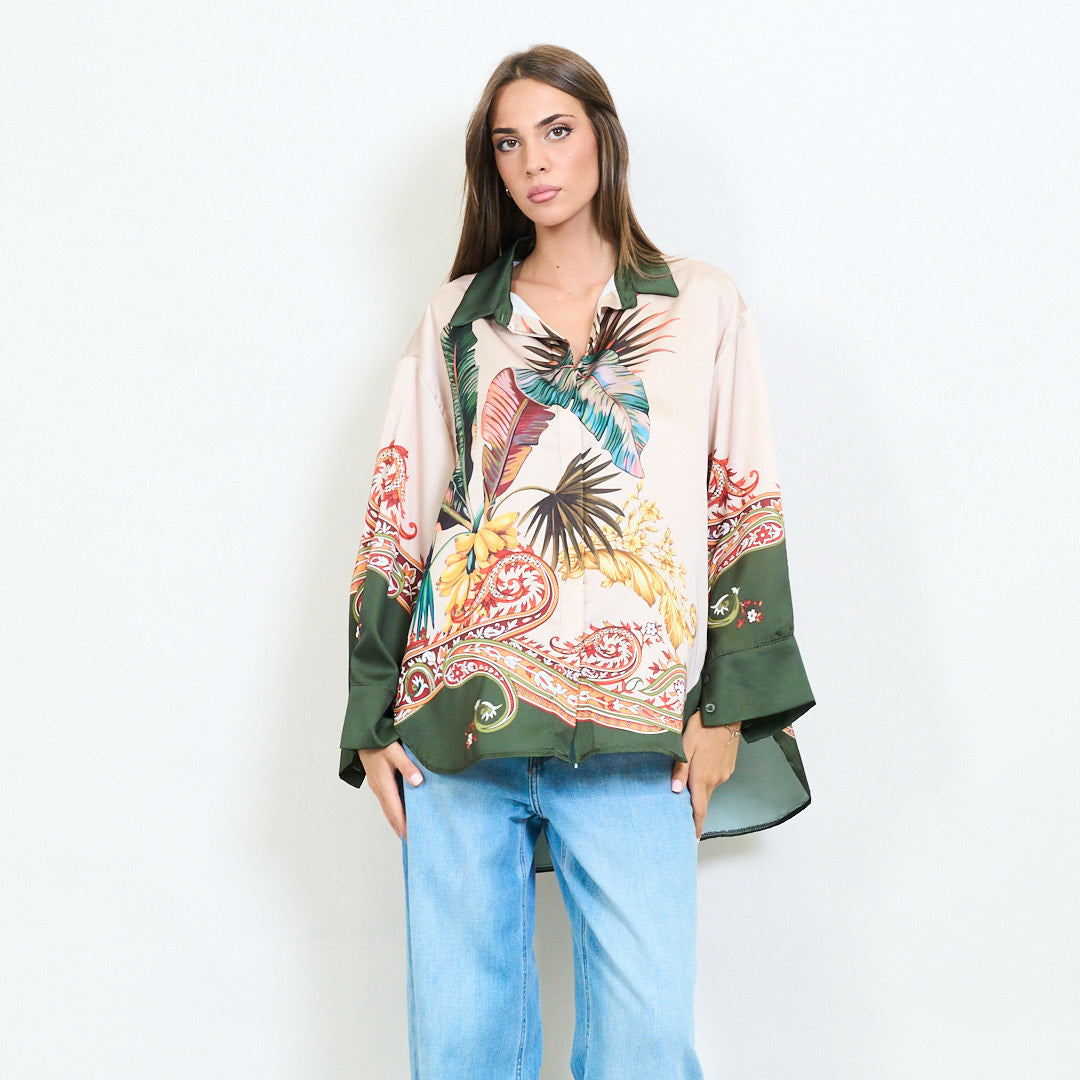 - Blouse satinée élégante avec feuille tropicale audacieuse et motifs floraux