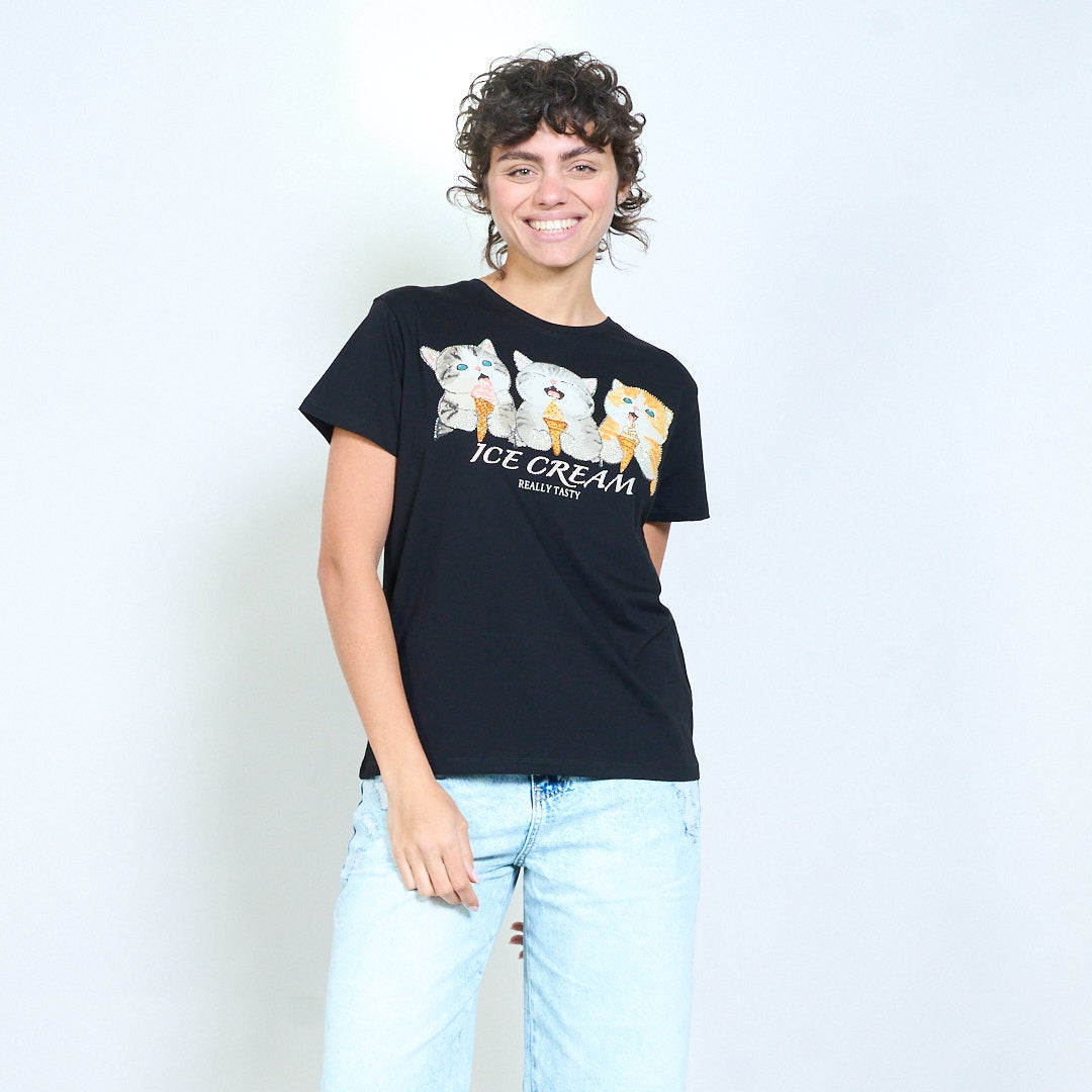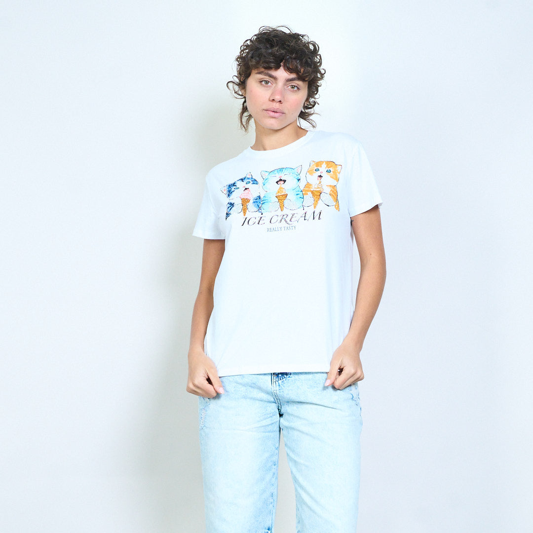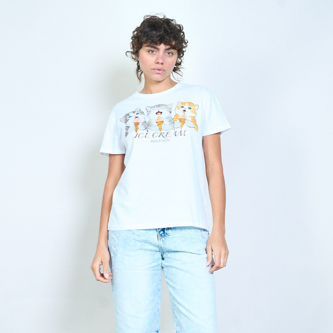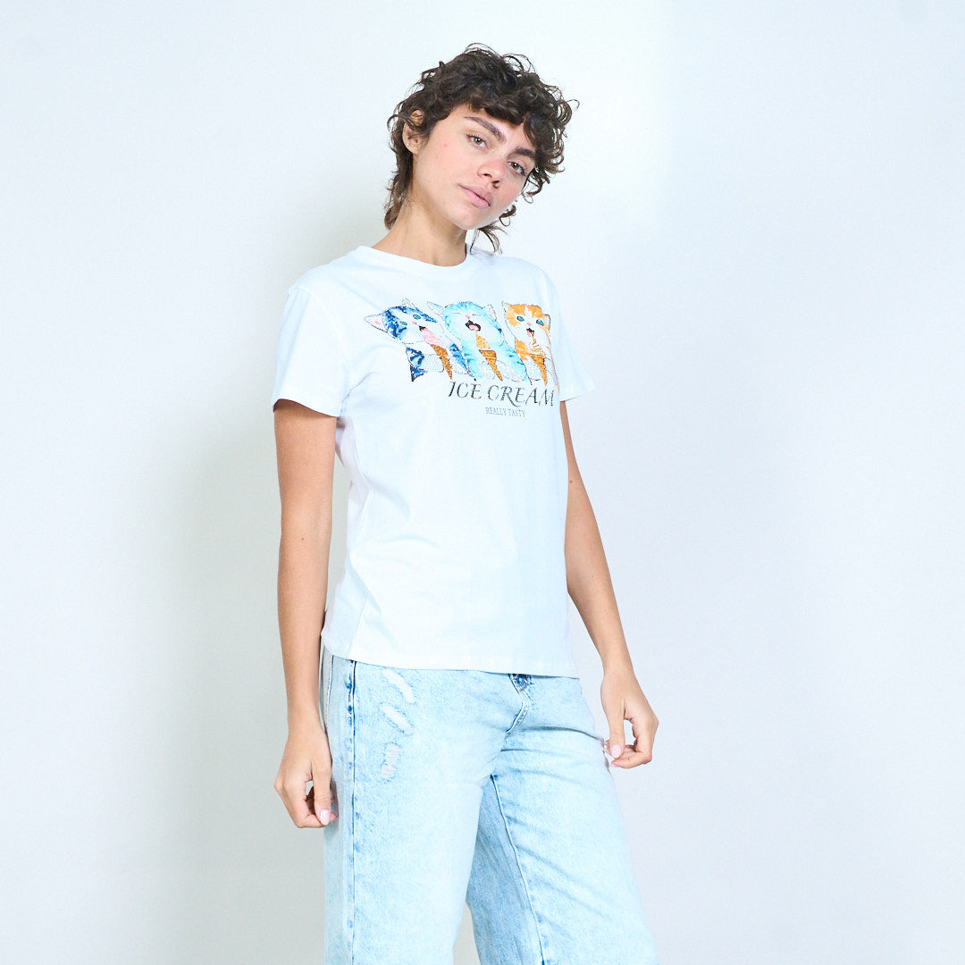 T-shirt ajusté avec imprimé graphique de crème glacée de chaton ludique, vente en gros