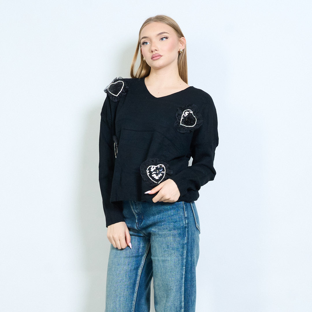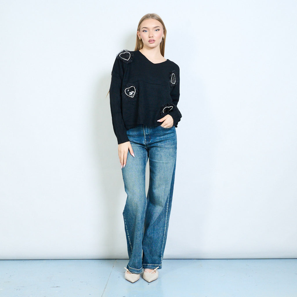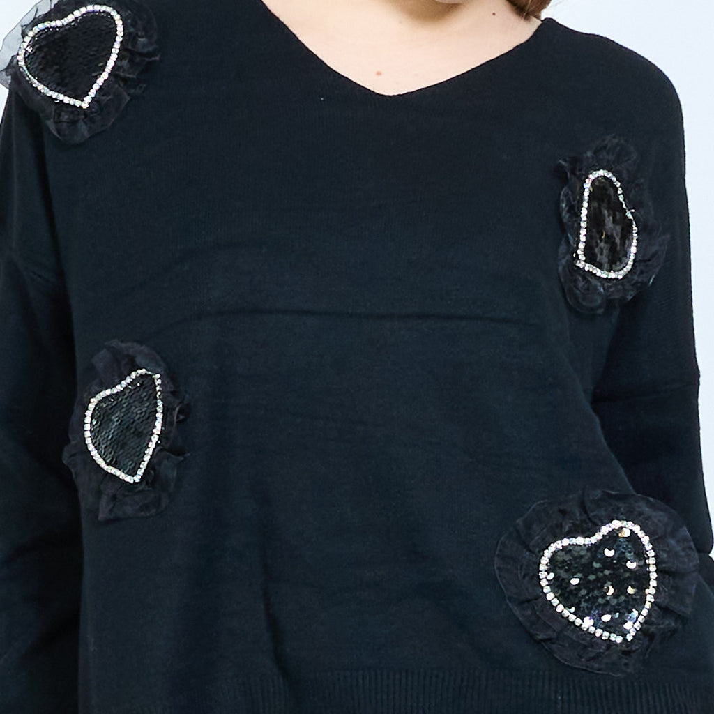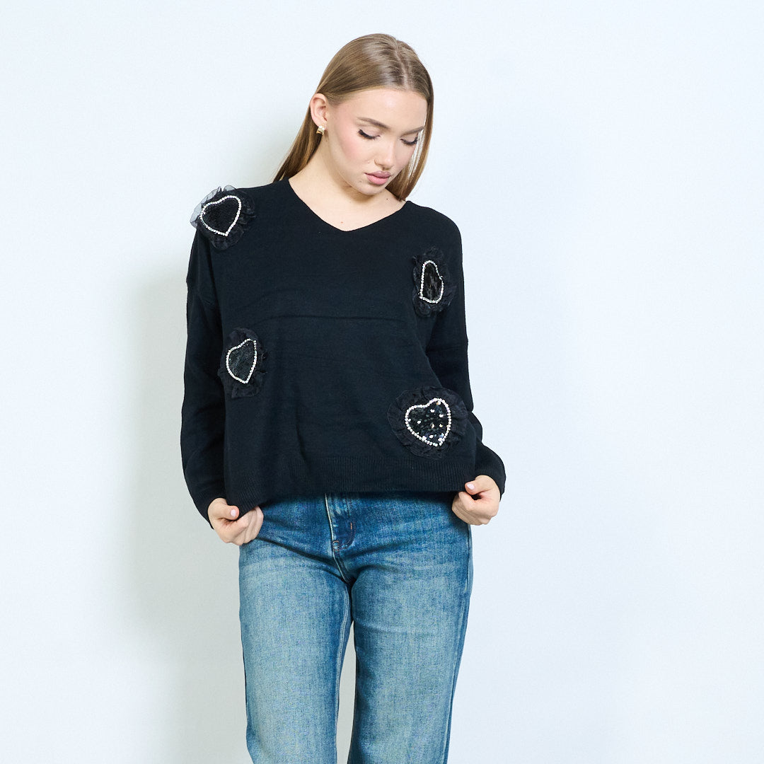 • Pull en maille col V orné de multiples applications cœur en sequins