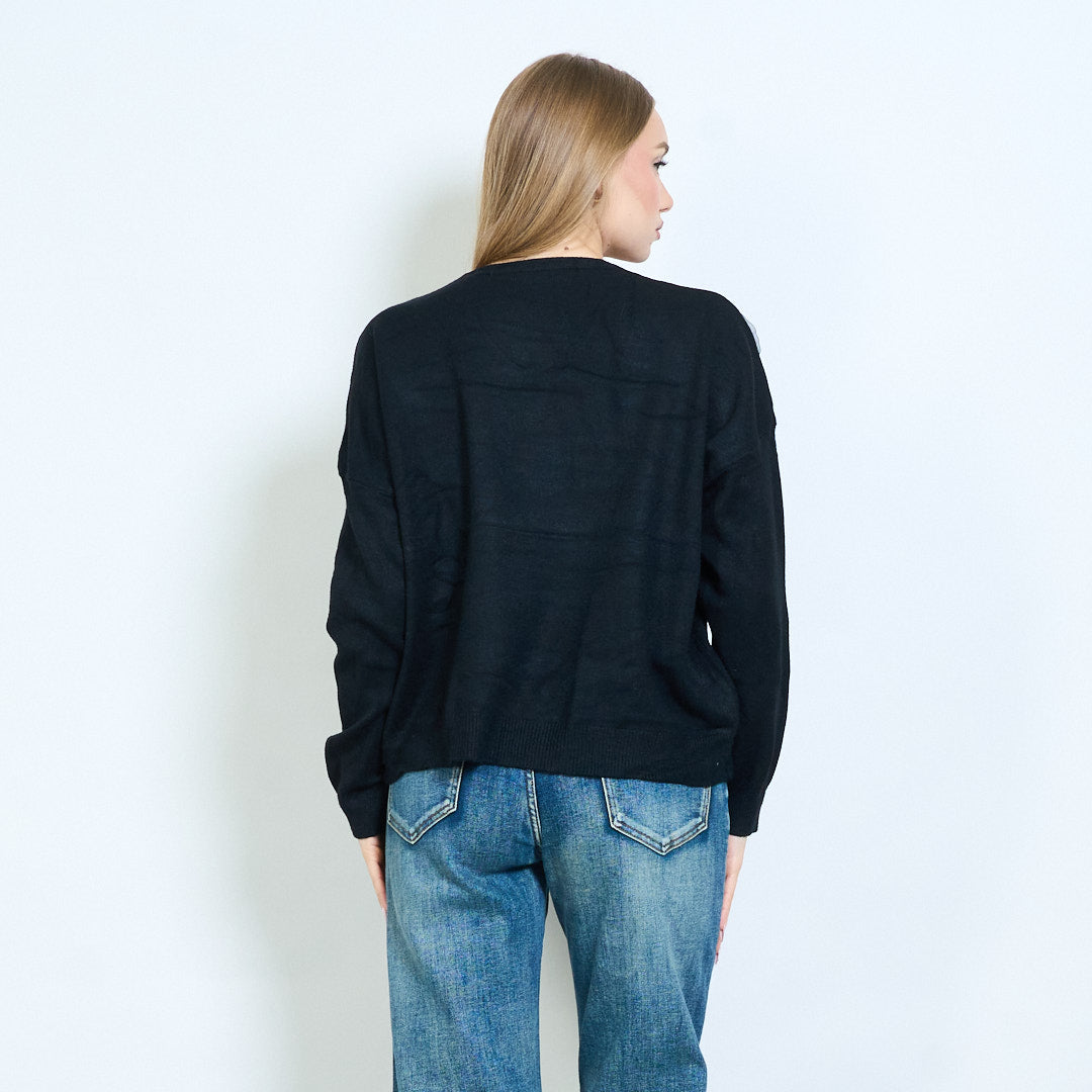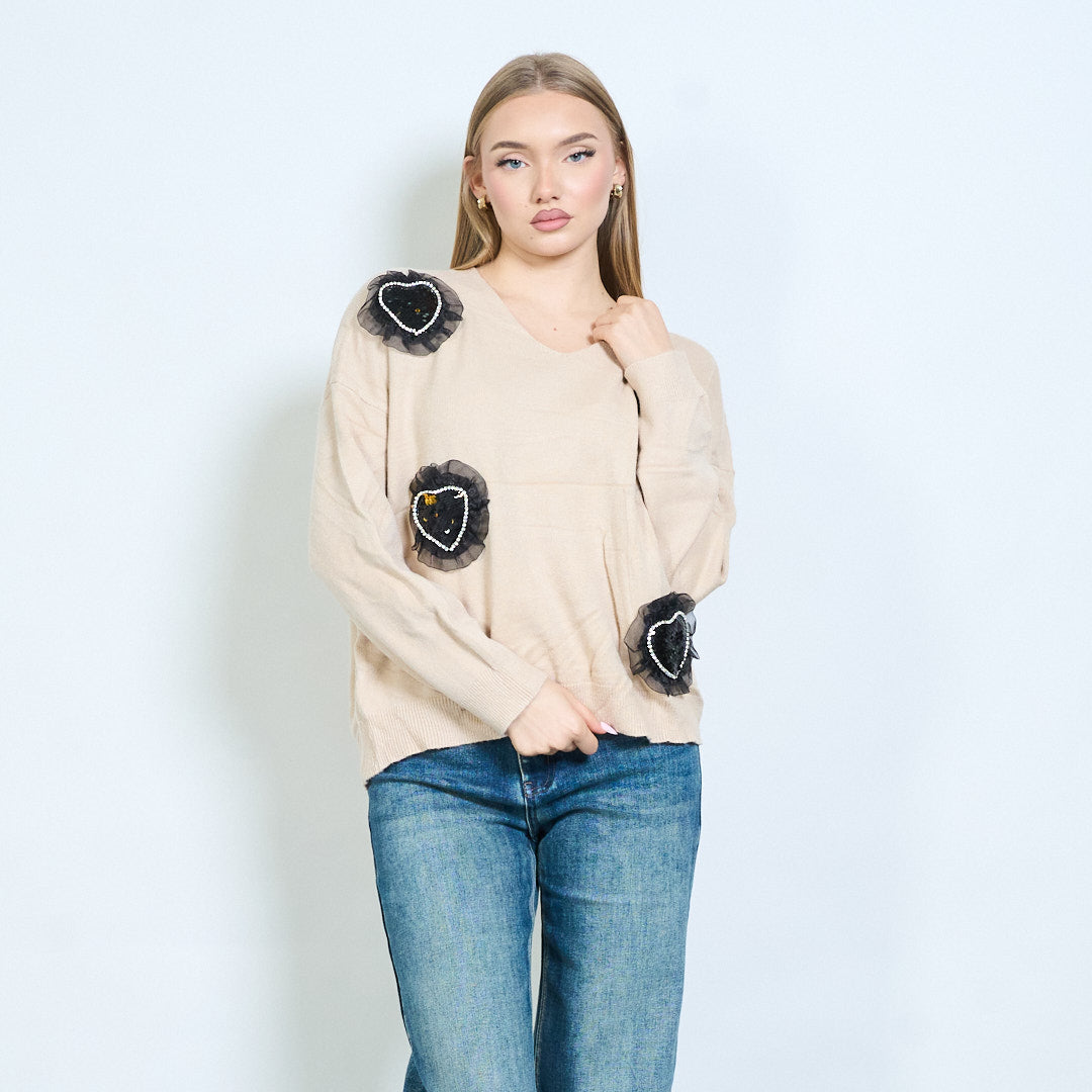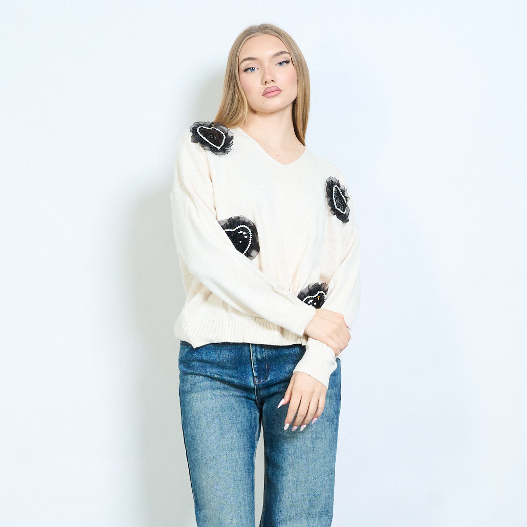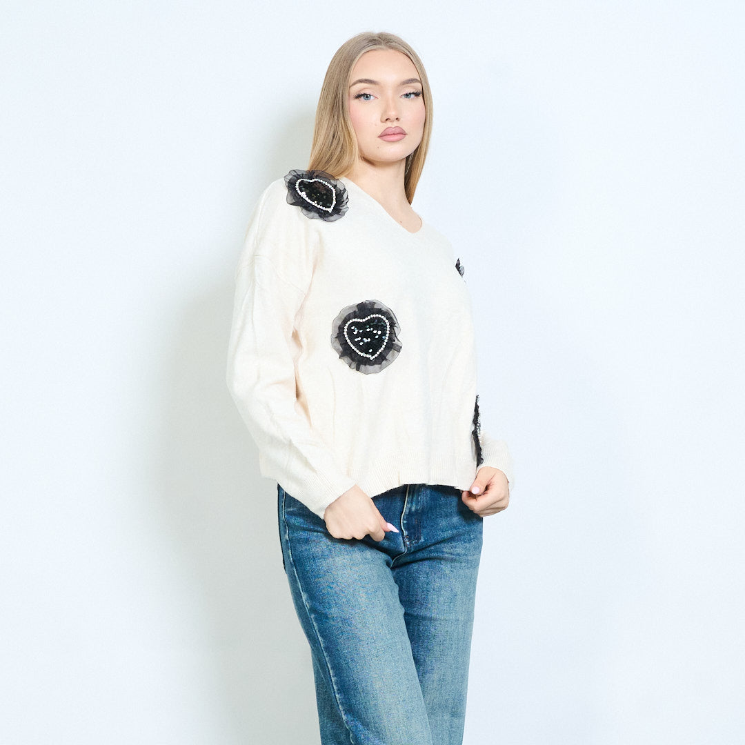 • Pull en maille col V orné de multiples applications cœur en sequins