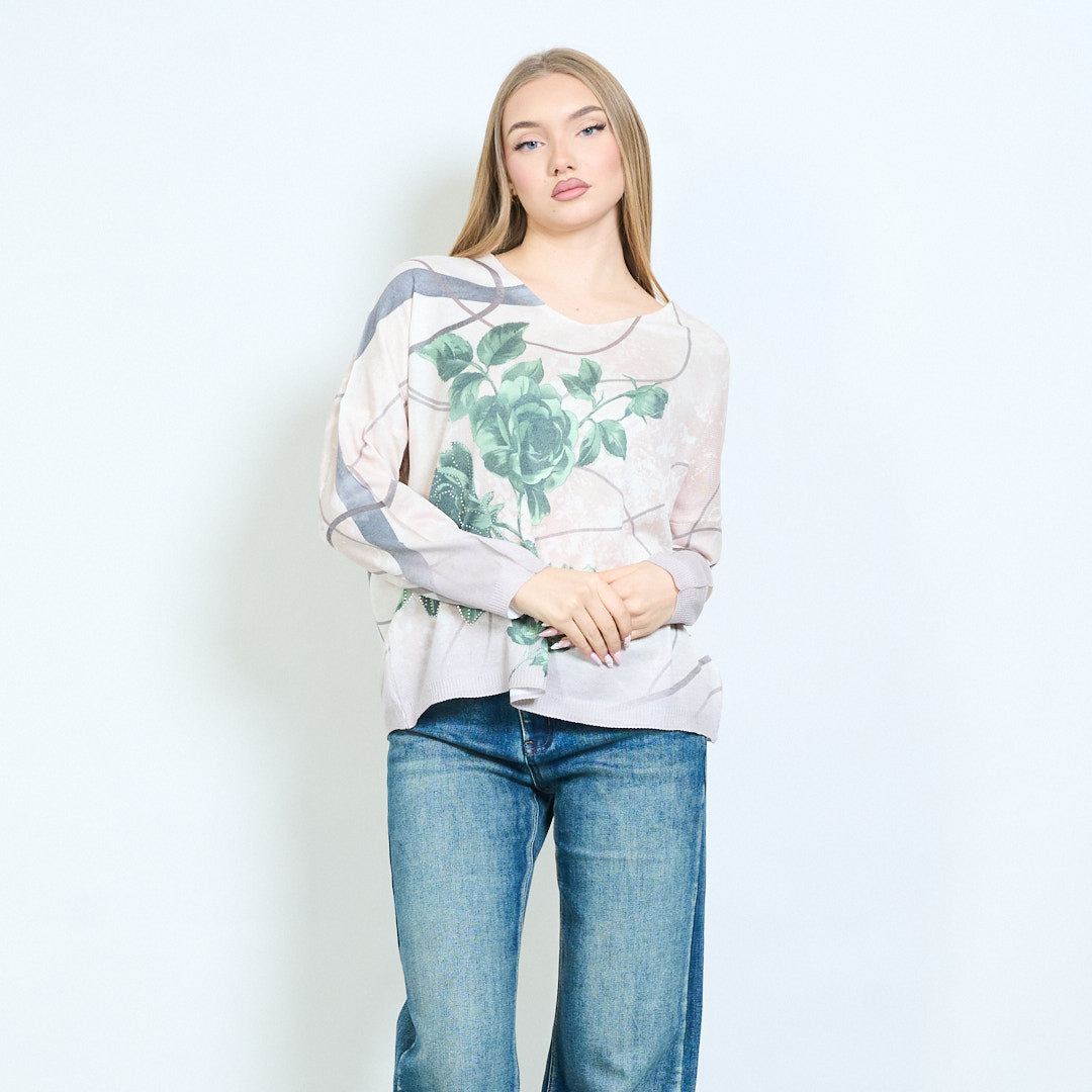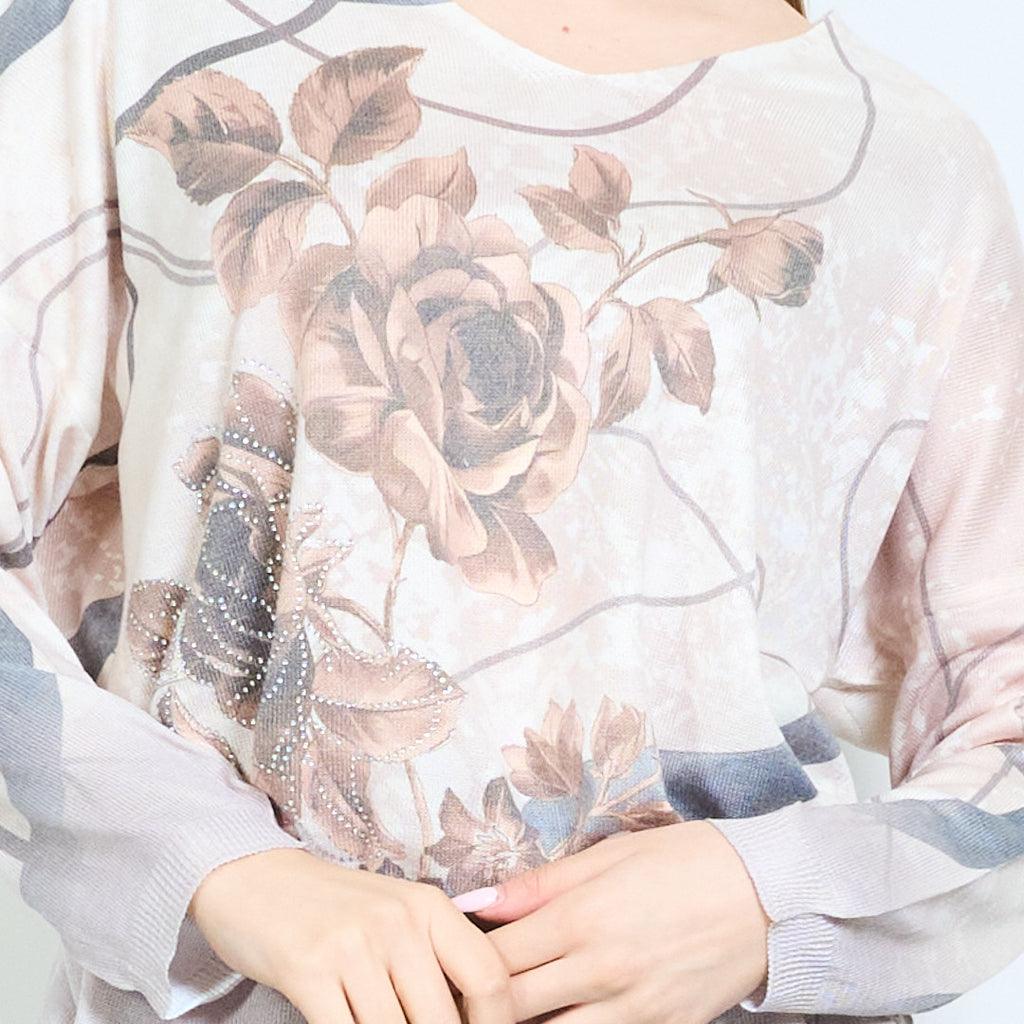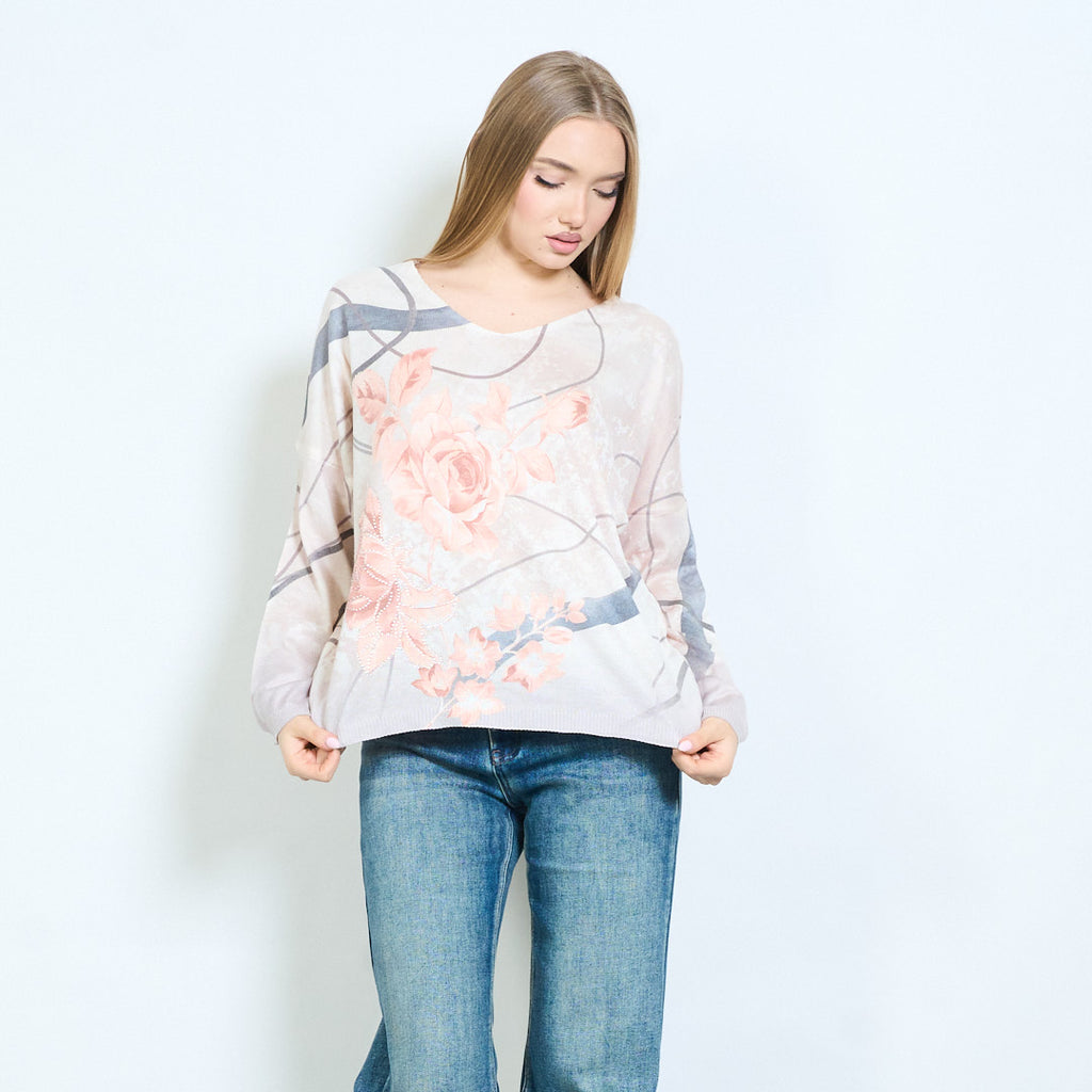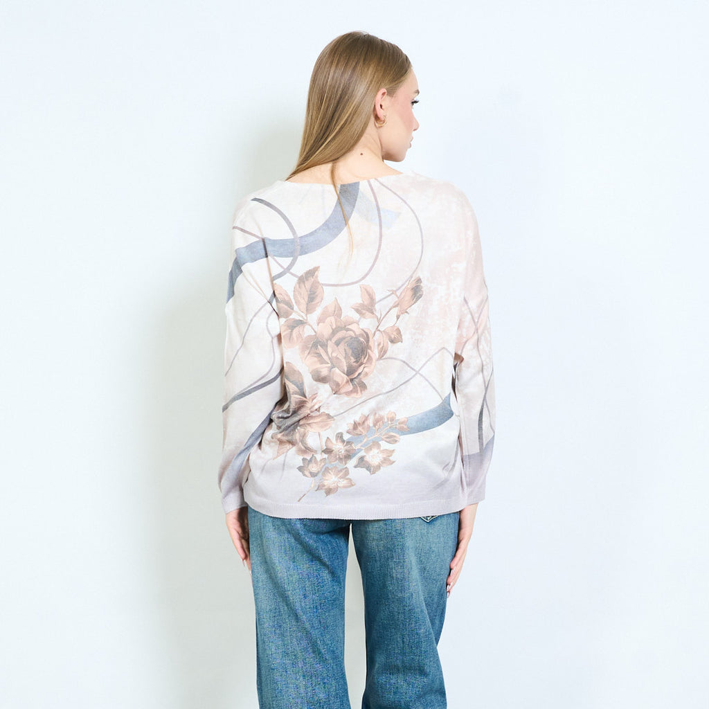• Pull tricoté doux au toucher présentant un mélange artistique d'éléments graphiques floraux et abstraits