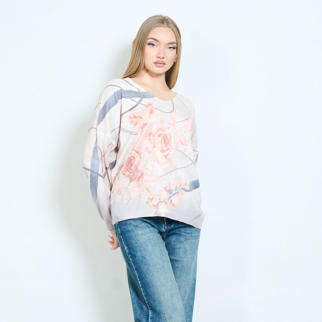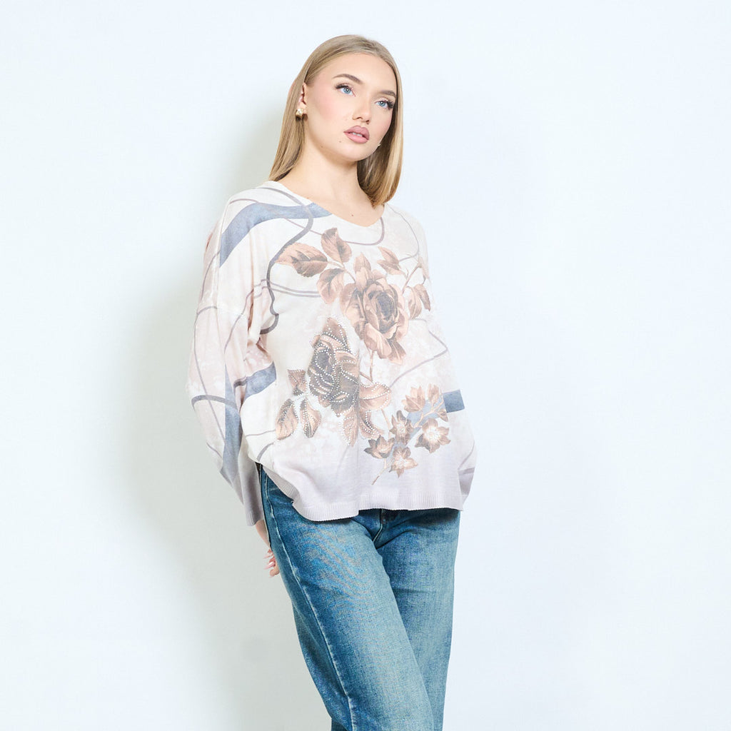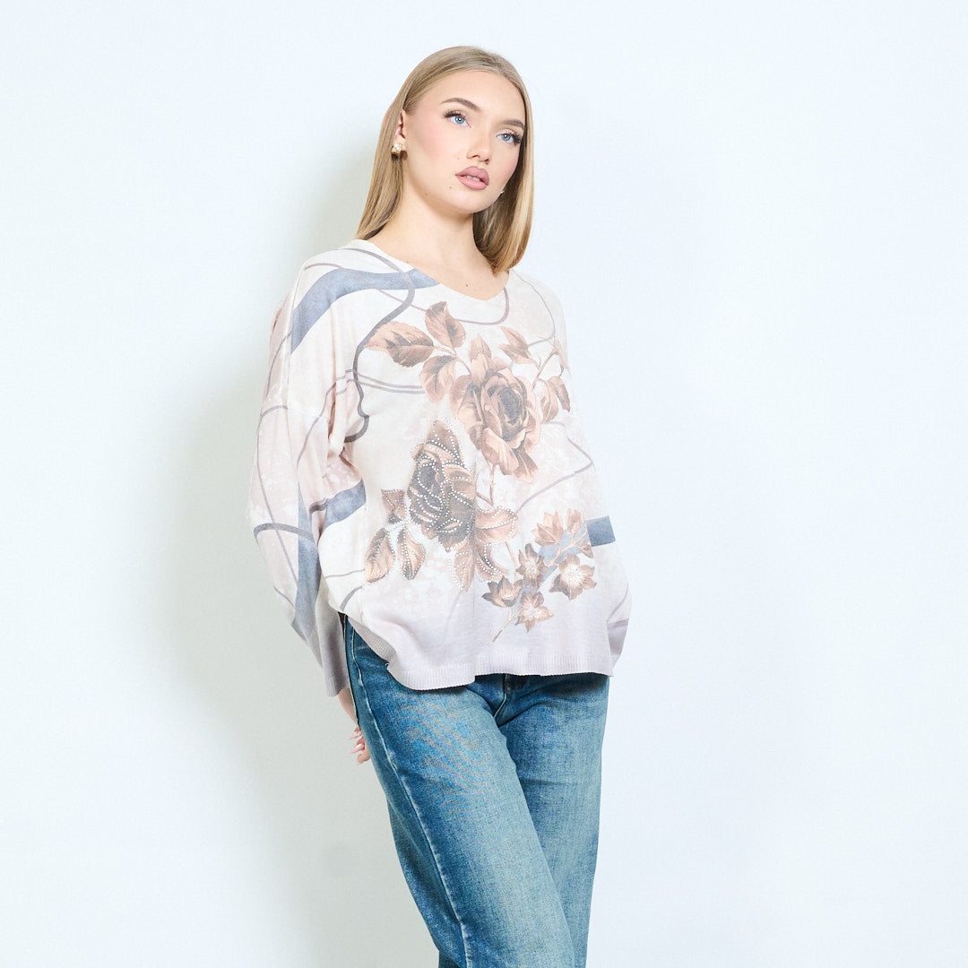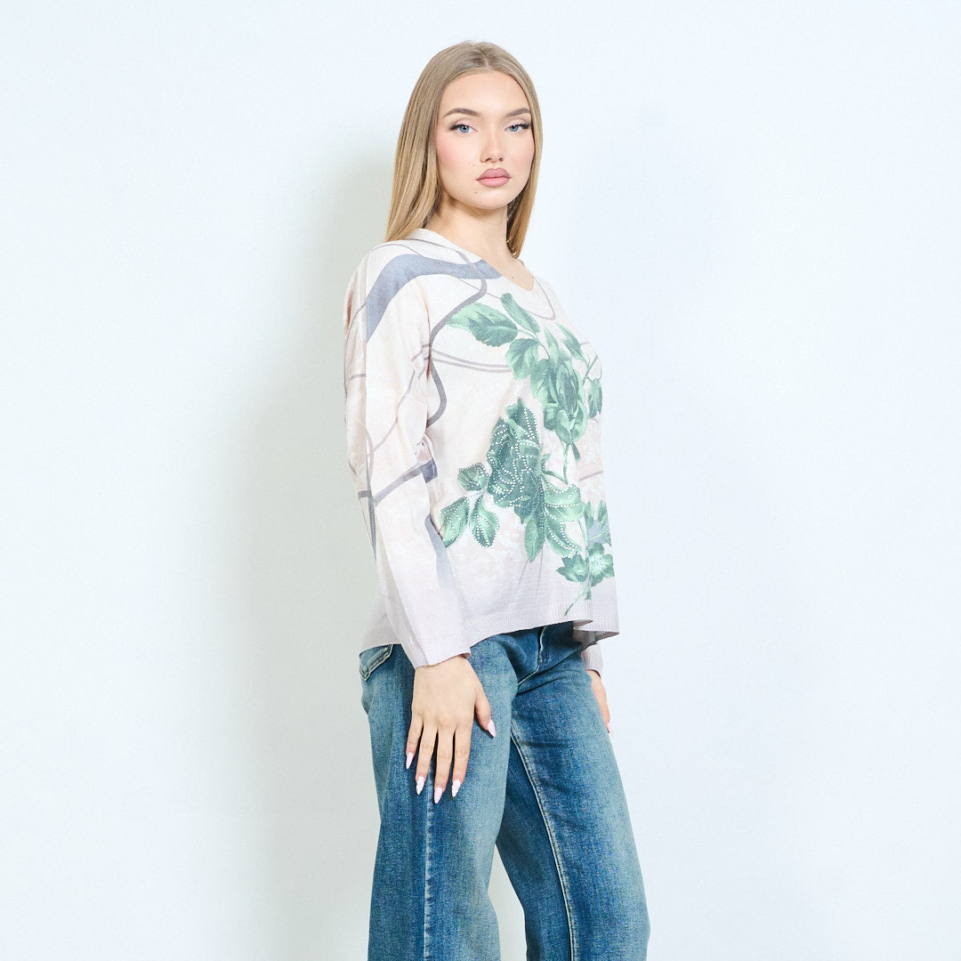 • Pull tricoté doux au toucher présentant un mélange artistique d'éléments graphiques floraux et abstraits