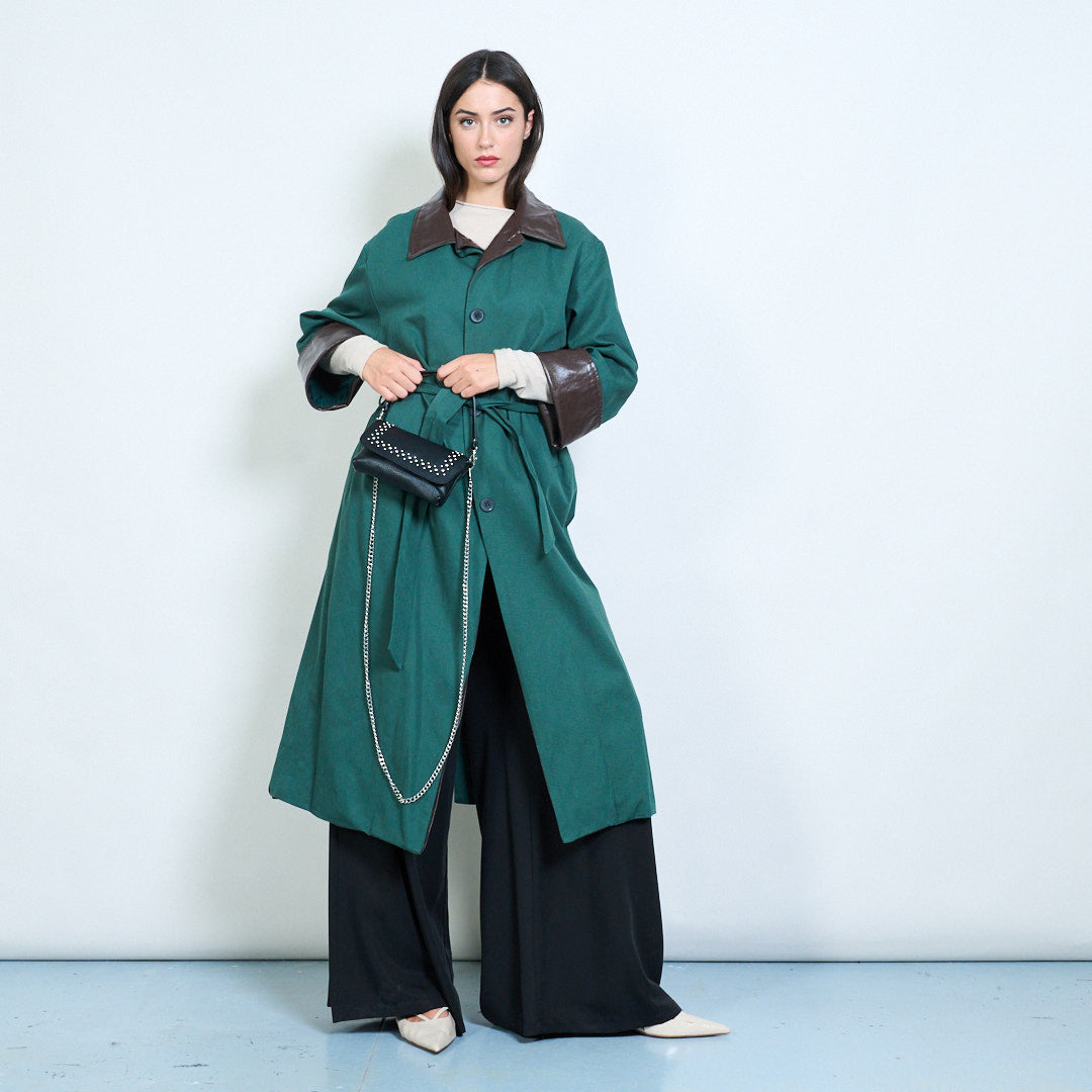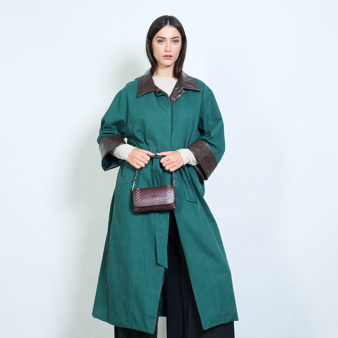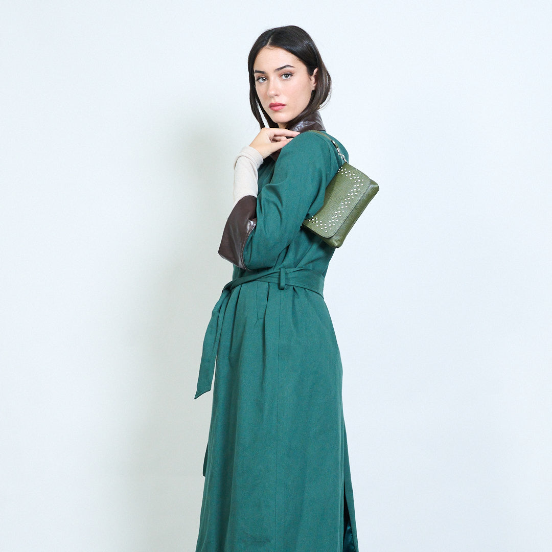 - Conçu avec un rabat structuré sur le devant rehaussé de clous métalliques.