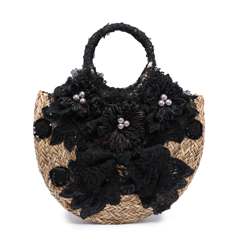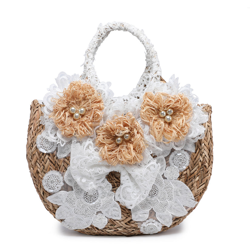 Mini panier tissé avec appliquée en dentelle et accents de fleurs de Raffia