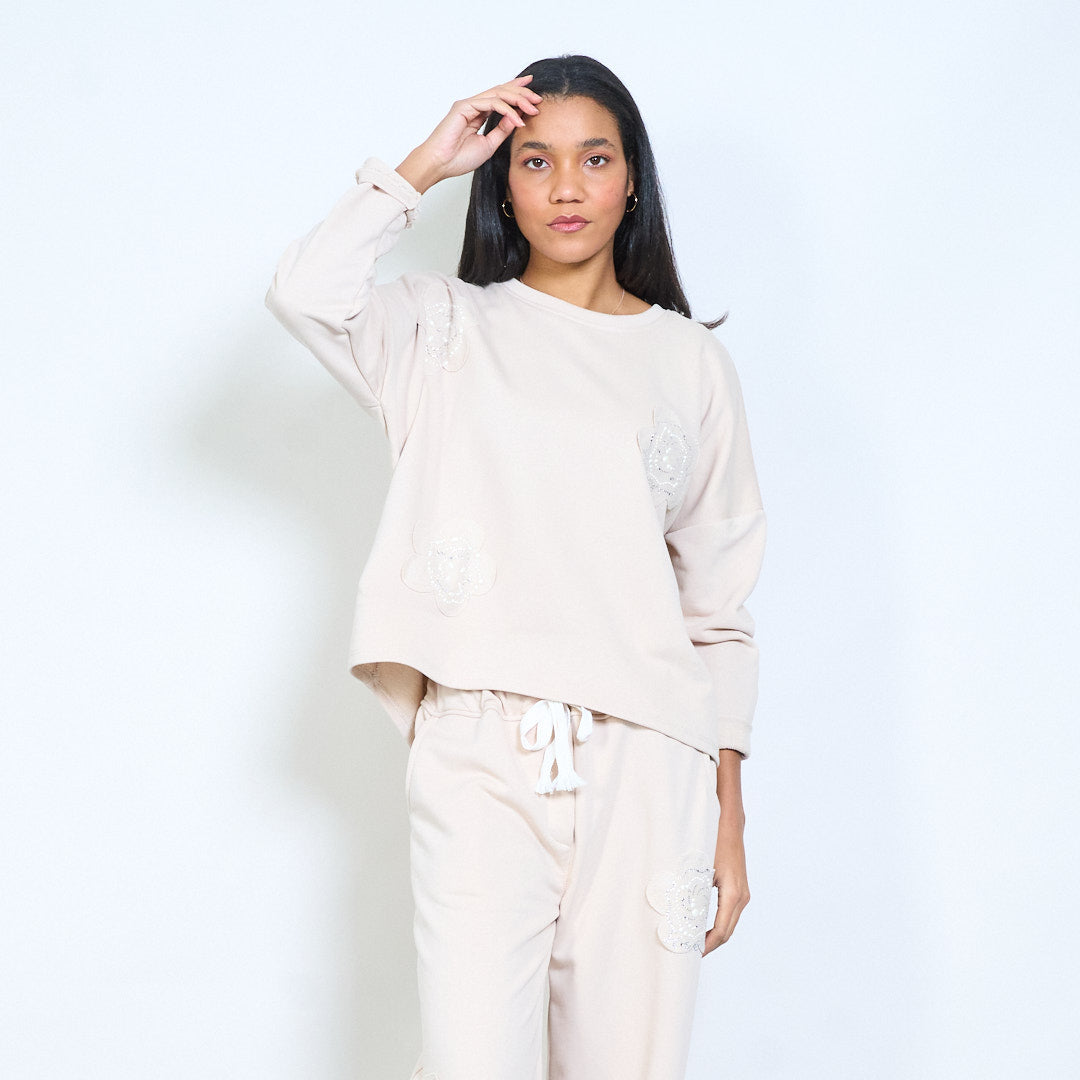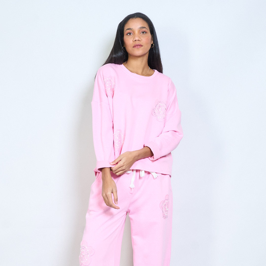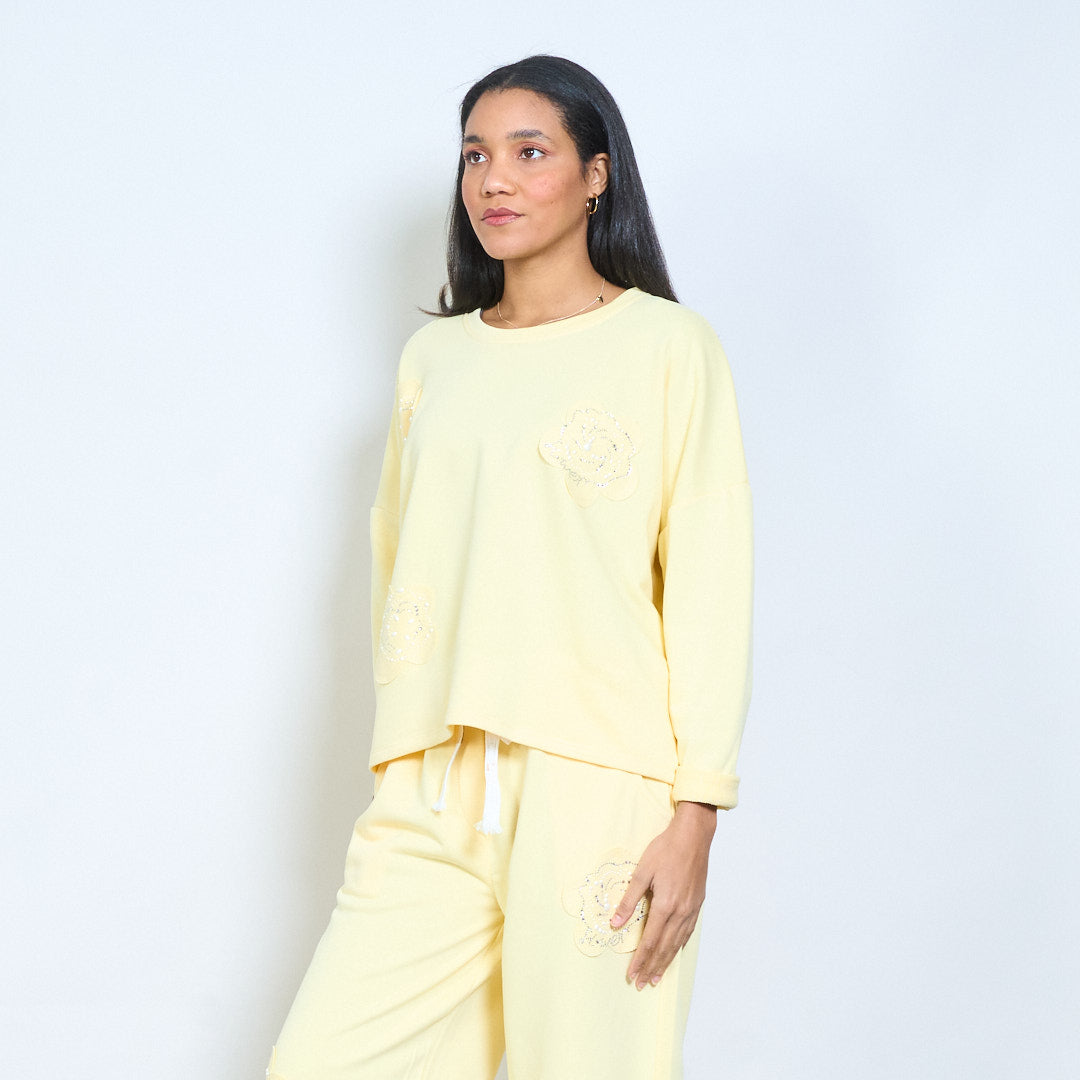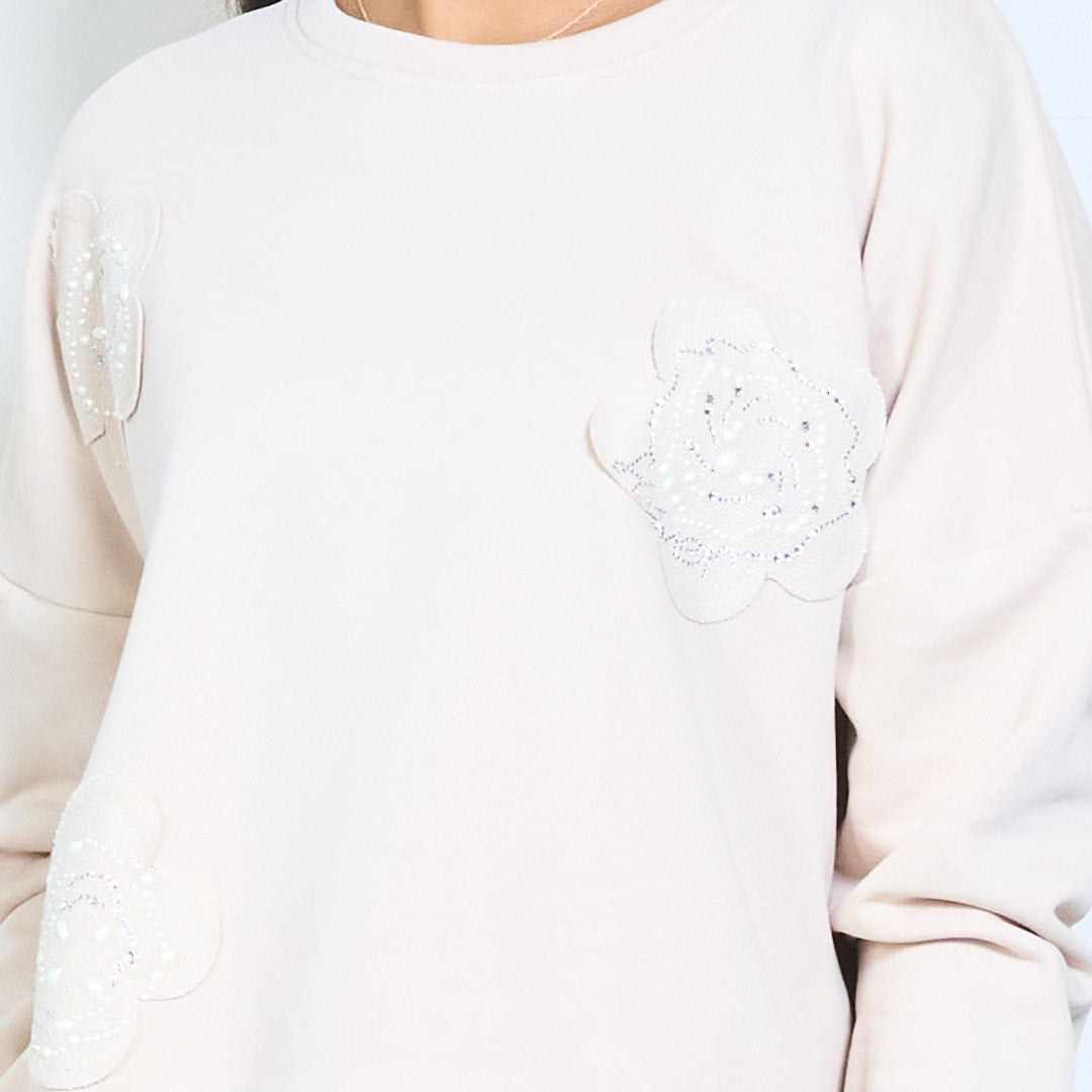Haut en tricot à manches longues décontracté avec appliques de strass floraux, vente en gros