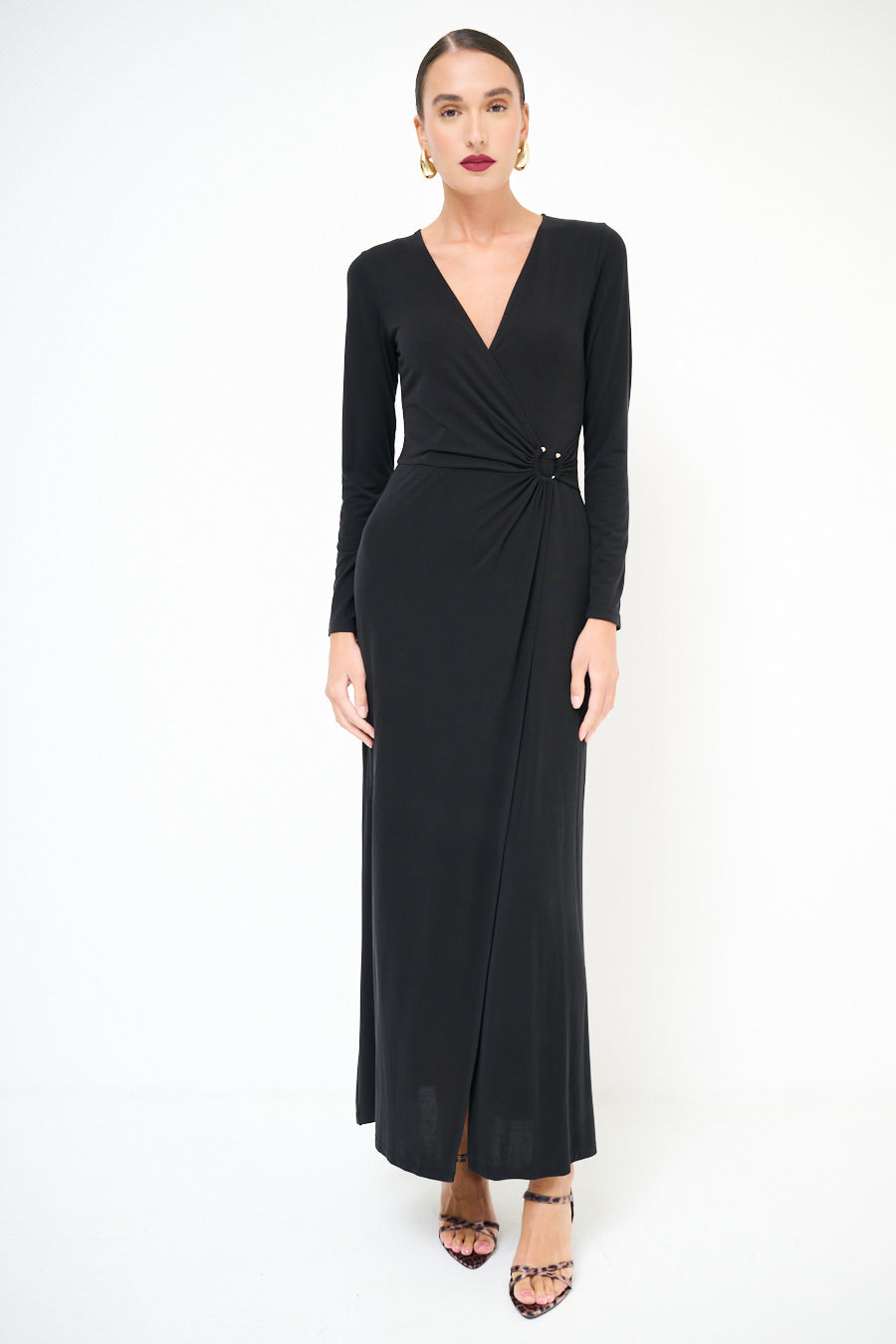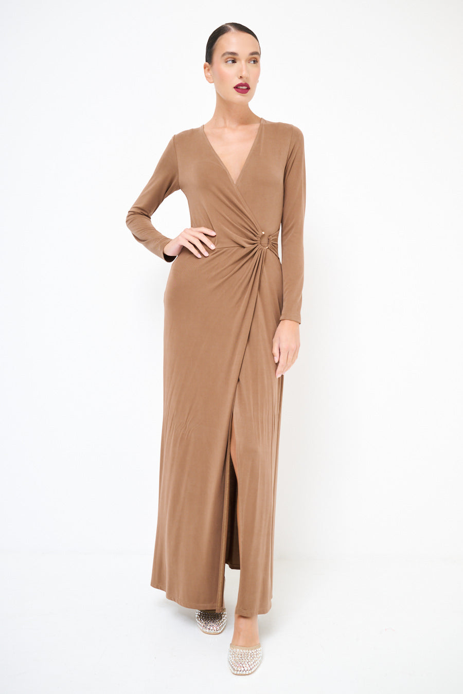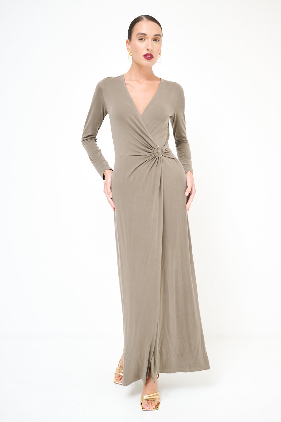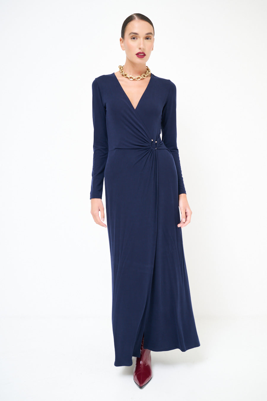 Robe maxi enveloppe à manches longues avec détail en gros de nœuds rassemblés
